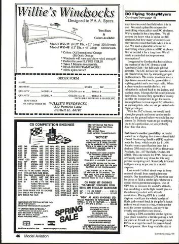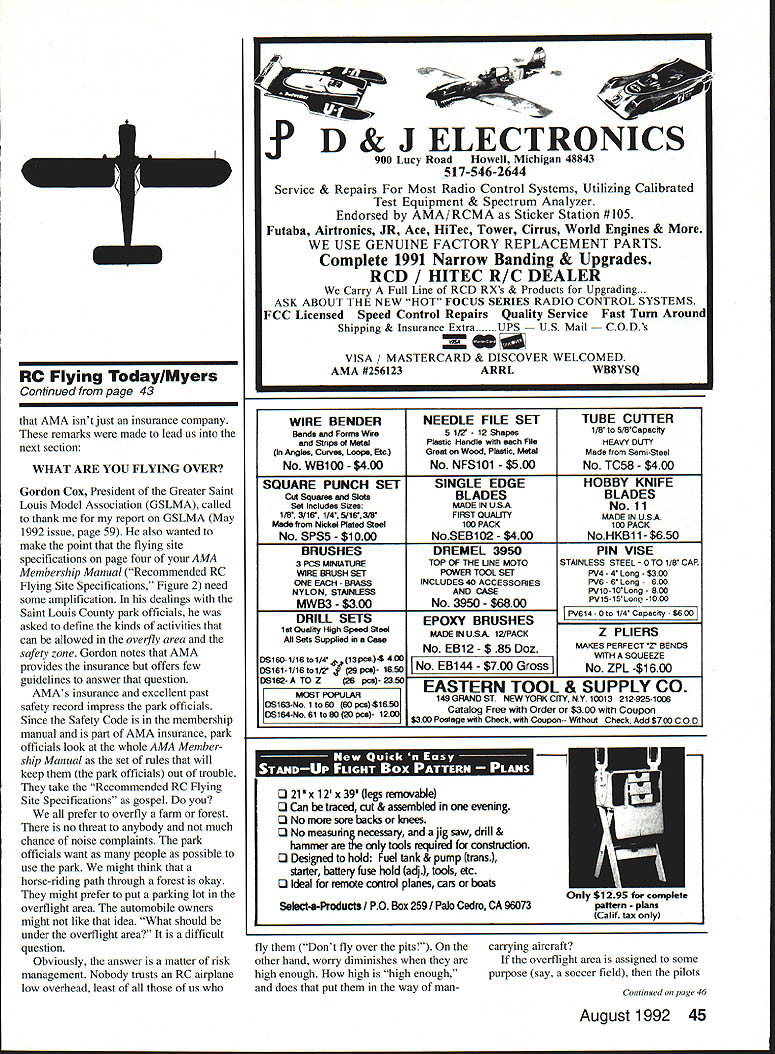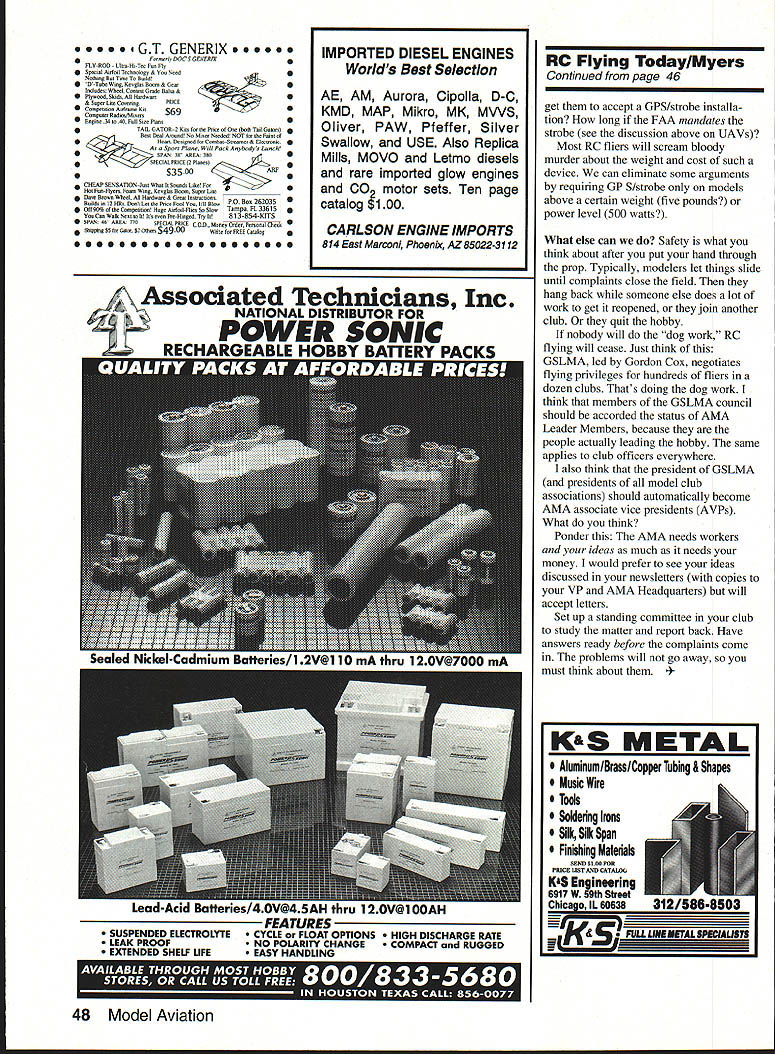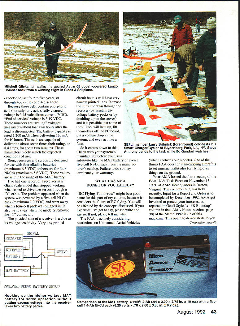 George M Myers ABSTRACT 1 Wideband RC systems 2 MAT lead/acid gel-cell battery 3 What has AMA done lately 4 What flying over WIDEBAND RC SYSTEMS COMING SOON write April 1992 remind now illegal import manufacture wideband RC transmitters Report & Order FCC 91-103 mandates wideband RC transmitters may sold until 1 March 1993 used until 1 March 1998 After dates sale use respectively must end harboring wideband equipment have ideas about selling should get narrow-banded now AMA got 50 exclusive 72 MHz RC channels has taught must use lose Hanging onto channels prolong use wideband equipment way lose Model Aviation Technology 12848 Touchstone Place Palm Beach Gardens FL 33418 importing gelled electrolyte sealed lead/phosphoric acid batteries plastic cases 6-VDC x 12Ah size Charge retention time vibration resistance claimed much better Ni-Cd batteries Price $30 folks MAT have glued pack firewall Giant Scale model flown often enough convinced vibration resistance excellent German manufacturer supplied laboratory test report showing resistance 10-G vibration l00-G shock MAT offers battery replacement 1 200-mAh Ni-Cd packs used Helicopters large stiff-wing airplanes might like backup battery 2 x 5 system such Ace RICs 2 x 5 dual-battery-pack installation kit designed twin five-cell Ni-Cd batteries because selfdischarge rate about 3% per month could also use isolated servo power supply would keep both higher voltage servo other noise out receiver servos will run faster generate torque wear out sooner use voltage higher specified manufacturer Some microservos critical voltage MAT batteries must charged constant voltage constant current avoid overcharging MAT recommends use Ace R/C Inc six-volt CVC constant-voltage charger kit #34K3BC supplied Fully charged gelled electrolyte batteries should maintained trickie charger manufacturer recommends C/l000 case would 12 mA Gelled electrolyte cells should fast charged MAT battery limited 600 mA short periods Properly maintained MAT batteries 42 Model Aviation 70 Froehlich Farm Rd Hicks yule NY 11801 Jimmy holding Spectra Joe La Placa Irulr iirui iurn smigni oilotiinstructor GMM MAT BATTERY buddy Jeff Hughes Fast Eddy 1st 1992 Pylon Racing session SEFLI Silent Electric Flyers Long Island expected last four five years through 400 cycles 5% discharge Because cells contain phosphoric acid sulphuric acid fully charged voltage 645 volts direct current VDC End service voltage 519 VDC numbers resting voltages measured load two hours after load disconnected battery capacity rated 1200 mAh delivering 120 mA 10 hours cells capable delivering about seven times rating 84 amps about two minutes parameters nicely match expected conditions use Some receivers servos designed use four alkaline batteries maximum 63 VDC others four Ni-Cds maximum 56 VDC values within range MAT battery Ive report receiver Giant Scale model stopped working asked drive two servos through Y cable problem appeared system powered five-cell Ni-Cd pack maximum 70 VDC went away four-cell pack plugged also went away modeler removed Y connector physical size receiver clue its voltage sensitivity Very tiny printed circuit boards will have very narrow printed lines Increase current drawn through receiver using highvoltage battery packs doubling up servos possible some lines will heat up lift themselves off PC board put voltage drop system act like fuse So comes down Check systems manufacturer before use substitute like MAT battery five-cell Ni-Cd pack manufac turers catalog Failure may terminate warranty WHAT HAS AMA DONE FOR YOU LATELY RC Flying Tomorrow~ might good name part column because considers future RC flying will affected concepts discussed like what Ive got say please write say please tell FAA actively considering restrictions Unmanned Aerial Vehicles SEFLI member Larry Sribnick foreground cola-tests nis Smart Charger/Cycler Blydenberg Park Ll NY Steve Anthony bends task Ed Gandorf watches includes models things FAA does man-carrying aircraft set minimum altitudes flying over things ground AMA hosted first meeting FAA UAV Task Force November 13 1991 AMA Headquarters Reston Virginia sixth meeting held recently Input Report Order completed December 1992 AMA got involved protect interests reported Geoff Styless PR Roundup column AMA News section page 98 March 1992 issue magazine ought demonstrate Continued page 45 8IGNAL RECEIVER RECEIVER ERY-V0 BATTERY ISOLATED SERVO BATTERY TUP Hooking up higher voltage MAT battery servo operation putting excess voltage receiver takes two battery packs August1992 43 Mitchell Glicksman walks geared Astro 05 cobalt-powered Lanzo Bomber back winning flight Class Sailplane Comparison MAT battery 6-voltIl2-Ah 94 x 200 x 375 x 10 oz fivecell 14-Ah Ni-Cd pack 625 volts x 70 x 200 x 330 x 67 oz RC Flying Today/Myers Continued page 43 AMA isnt just insurance company remarks made lead us next section WHAT ARE YOU FLYING OVER Gordon Cox President Greater Saint Louis Model Association GSLMA called thank report GSLMA May 1992 issue page 59 also wanted make point flying site specifications page four AMA Membership Manual Recommended RC Flying Site Specifications Figure 2 need some amplification dealings Saint Louis County park officials asked define kinds activities can allowed oveifly area safely zone Gordon notes AMA provides insurance offers few guidelines answer question AMA s insurance excellent past safety record impress park officials Since Safety Code membership manual part AMA insurance park officials look whole AMA Member ship Manual set rules will keep park officials out trouble take Recommended RC Flying Site Specifications gospel prefer overfly farm forest no threat anybody much chance noise complaints park officials want people possible use park might think horse-riding path through forest okay might prefer put parking lot overflight area automobile owners might like idea What should under overflight area difficult question Obviously answer matter risk management 