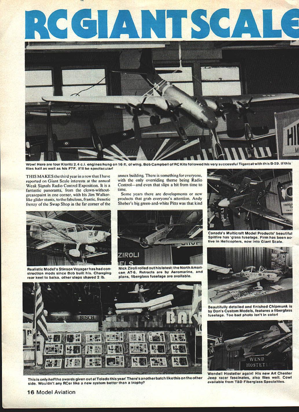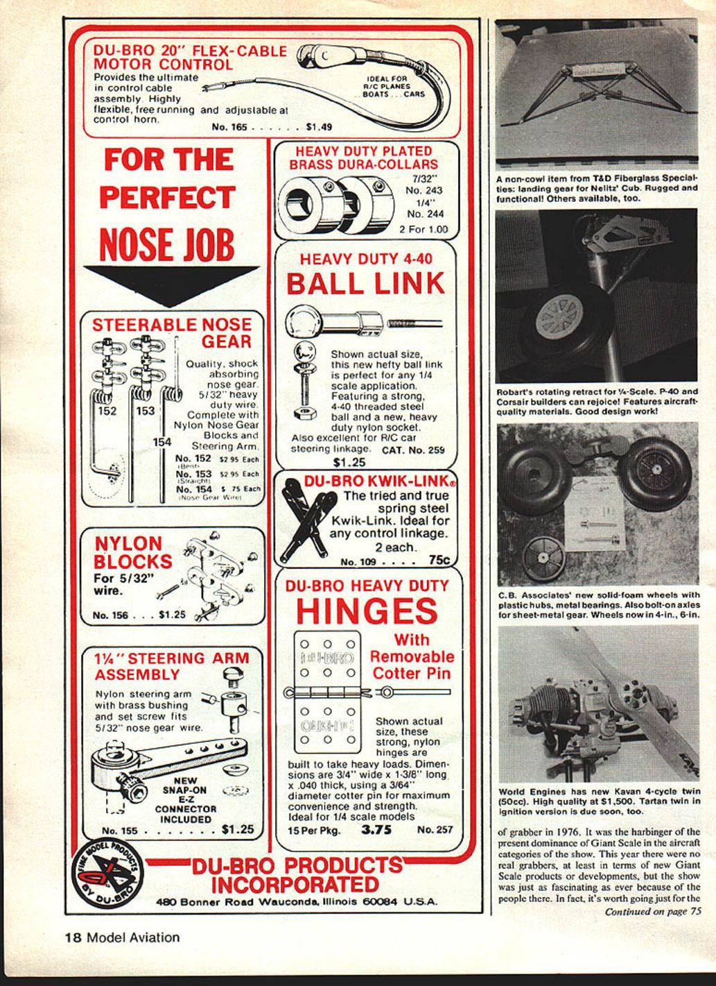 Wow four Kioritz 24 ci engines hung 16 ft wing Bob Campbell RC Kits followed very successful Tigercat B-29 ltthIS flies half well F7F itll spectacular THIS MAKES third year row have reported Giant Scale interests annual Weak Signals Radio Control Exposition fantastic panorama clown-withoutgreasepaint corner Jim Walkerlike glider stunts fabulous frantic frenetic frenzy Swap Shop far corner annex building something everyone overriding theme being Radio Controland slips bit time time Some years developments new products grab everyones attention Andy Shebers big green-and-white Pitts kind 16 Model Aviation Lansass Multicrati Model Products beautiful Spitfire has glass fuselage Firm has ac tive Helicopters now Giant Scale Kealistic oaers xunson Voyager has con- Nick Ziroli rolled out latest North Amen struction mods since Bob built Changing can AT-6 Retracts Aeromarine rear keel balsa other steps shaved 2 lb plans fiberglass fuselage available ueautusuuly aeIauea ana sunisneu inipmunk Dons Custom Models features fiberglass fuselage Too bad photo isnt color Wendell Hostetler again new Art Chester halfthe awards given out Toledo year Theres another batch likethis otherJeep racer fascinates also flies well Cowl side Wouldnt RCer like new system better trophyavailable T&D Fiberglass Specialties VBobBeckman 82 Sullivans Pylon Brand newest gasoline-proof tank stopper fuel pickup line 4-40 threaded rods big fittings ball-end hex wrench B&B Specialties new 4-40 balI socket Its few items available makes reasonable servo arm connector Giant Scale Aerolite has goodies wire rigging cable control systems Bob thinks cable systems scalelike safer pushrods J&Z Products keeps adding new Zinger props line New ones have higher pitch absorb power also Giant-size pushers Aerolite Products importing Canadian Clark props Send new catalog features needed items great new buildiig materials T&D Fiberglass Specialties new cowl Bob iotherB&B item pushrodendsforaluminumNelitz Cedarbridge Cub T&D has arrow shafts Two versions 4-40 screw linkcowls thisall exemplary crossbar split-elevator linkageContinued page 18 July 198217 Byron Originals booth just keeps filling up more new airplaneswith Giant Scale category Note Christen Eagle Beech Staggerwing Cub kits/plans outnumber amer aesign New Clipped Wing J-3 versions Sig Kits continue tradition excellence Vito Tomeo well-known HawkerTemp est Heres latest Republic P-47 Tunderbolt Looks outstanding uave IiaTT egaims nis new r-i mustang rrue scaleeven airfoil Kit available -A -B -D versions aircraft DU-BRO 20 FLEX-CABLE c MOTOR CONTROL Provides ultimate IDEAL FOR control cable R/C PLANES assembly Highly BOATS flexible tree running adjustable control horn No 165$149 FOR THE PERFECT NOSE JOB STEERABLE NOSE GEAR 152 153 154 Quality shock absorbing nose gear 5/32 heavy duty wire Complete Nylon Nose Gear Blocks Steering Arm No 152 S2 95 Ben No 153 S2 95 No 154 $ 75 Nose Gea Wre NYLON KS 5/32; s wireVv 1 1A STEERING ASSEMBLY S125 HEAVY DUTY PLATED BRASS DURA-COLLARS 17/321 INo243I 11141 2 1 00 HEAVY DUTY 4-40 BALL LINK tried true spring steel Kwik- Link Ideal control linkage NO 2 2LZSK DU-BRO HEAVY DUTY HINGES ____________________With ARMRemovable Cotter Pin Nylon steering arm brass bushing o set screw fitsn-size 5/32 nose gear wire own actual ng nylon hinges built take heavy loads Dimen SNA sions 3/4 wide x 1-3/8 long P-ONx 040 thick using 3/64 diameter cotter pin maximum -CONNECTORconvenience strength INCLUDEDIdeal 1/4 scale models No 15515 Per Pkg375No 257 DU-BRO PRODUCTS INCORPORATED Banner Road Wauconda Illinois 60084 USA 18 Model Aviation r L noncowl item TAD Fiberglass Special ties landing gear Nelits Cub Rugged functional Others available too Shown actual size new hefty ball link pertect 1/4 scale application IiiFeaturing strong 4 40 threaded Steel ball new heavy duty nylon socket Also excellent R/G car steering linkage CAT No 259 $125 Robarts rotating retract -Scale P-40 Corsair builders can rejoice Features aircraftquality materials Good design work 000 '[L~ C B Associates new solid-foam wheels plastic hubs metal bearings Also bolt-on axles sheet-metal gear Wheels now 4-in. 6-in World Engines has new Kavan 4-cycle twin 50cc High quality $1500 Tartan twin ignition version due soon too grabber 1976 harbinger present dominance Giant Scale aircraft categories show year no real grabbers least terms new Giant Scale products developments show just fascinating ever because people fact its worth going just Continued page 7S mounted Slow Combat model mild engine blade hurled ground very close some spectators first time weve heard type incident have asked follow-up determine some kind special problem type prop Since posi tion tests controlled environment loss go would like ask readers help hope problem can detect establish ing pattern incidents reported have experienced case propeller blade separation other contact ground other solid object please let us know about interested failures propellers brand material size possible include following information Propellen Brand name size material Any mods prop Engine Brand name size rpm full throttle known Type Model eg RC Pattern CL Stunt etc Weather conditions time incident eg temperature approximate humidity Age Propellen Months since purchase date approximate number offlights prior abuses crashes Meanwhile let us remind minimize time spend line arc spinning propeller Also alert location bystanders rubber-neckers seem drawn like magnet sound screaming engine Have safe month John Preston 7012 Elvira Court Falls Church VA 22042 Toledo Show/Beckman Continued page 18 people see example look forward year chance have few words Walt Good first met Walt some 30 years ago middle grass field near Milpitas CA contacts since have brief always enjoyable year added pleasure introducing Walt another favorite people George Privateer George famous maybe should infamous editor Stardust newsletter STARS club Olean NY earliest dedicated big bird groups Another 