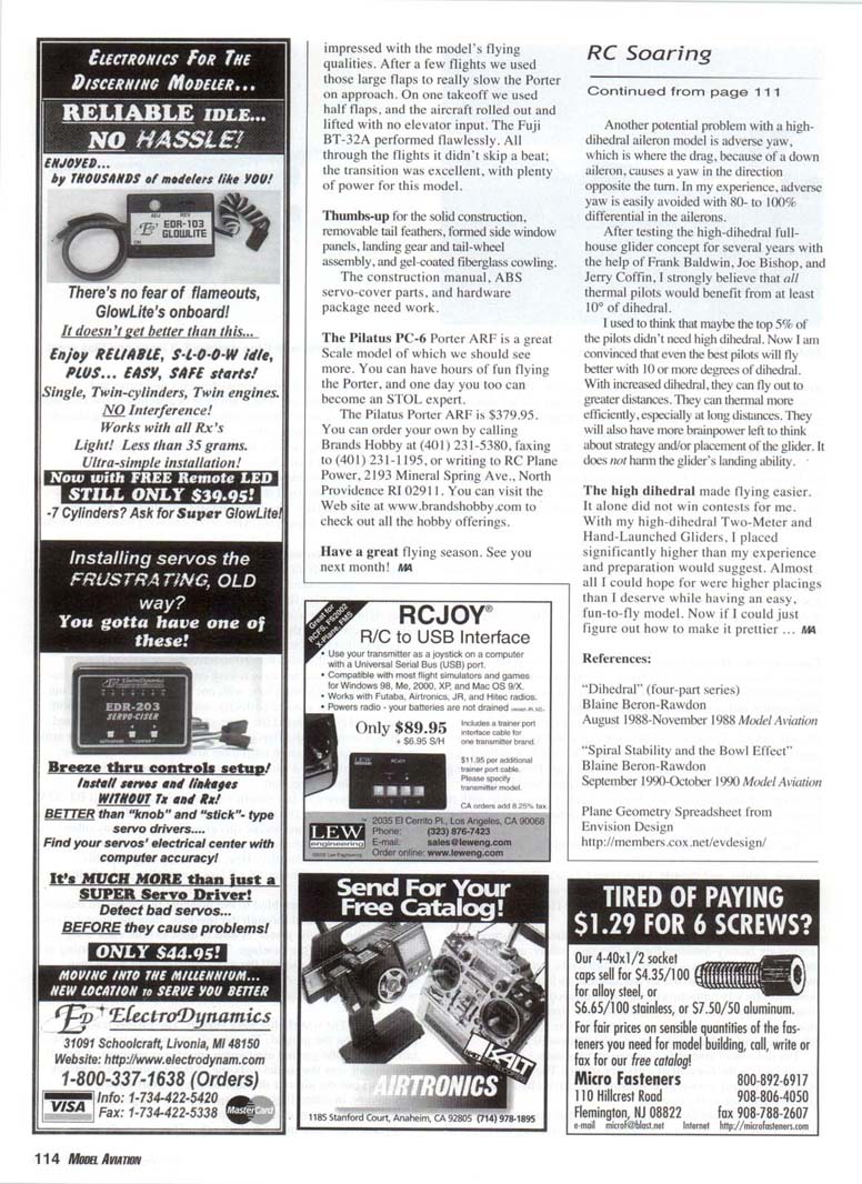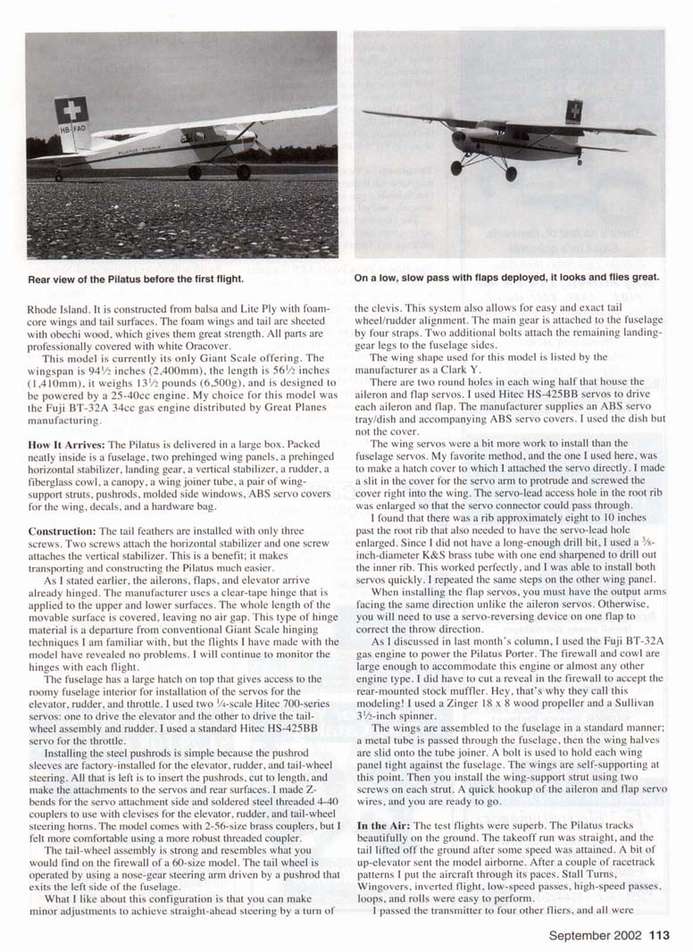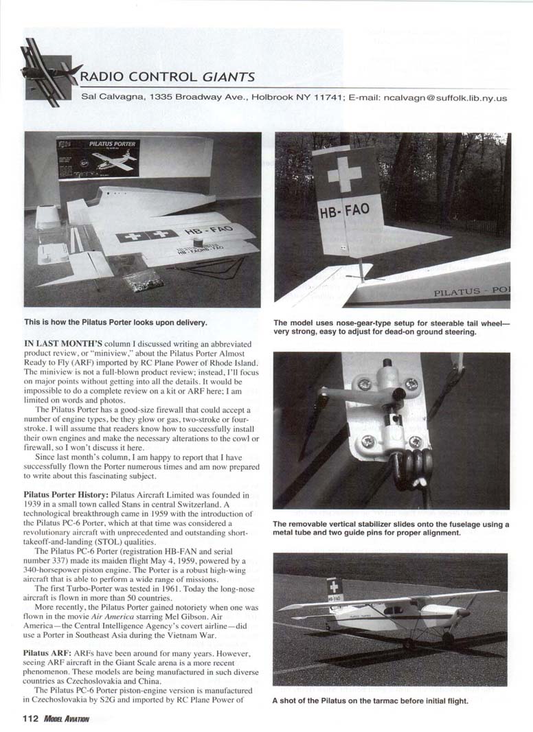 This is how the Pilatus Porter looks upon delivery. IN LAST MONTH'S column I discussed writing an abbreviated product review, or "miniview," about the Pilatus Porter Almost Ready to Fly (ARF) imported by RC Plane Power of Rhode Island. The miniview is not a full-blown product review; instead, I'll focus on major points without getting into all the details. It would be impossible to do a complete review on a kit or ARF here; I am limited on words and photos. The Pilatus Porter has a good-size firewall that could accept a number of engine types, be they glow or gas, two-stroke or four-stroke. I will assume that readers know how to successfully install their own engines and make the necessary alterations to the cowl or firewall, so I won't discuss it here. Since last month's column, I am happy to report that I have successfully flown the Porter numerous times and am now prepared to write about this fascinating subject. Pilatus Porter History: Pilatus Aircraft Limited was founded in 1939 in a small town called Stans in central Switzerland. A technological breakthrough came in 1959 with the introduction of the Pilatus PC-6 Porter, which at that time was considered a revolutionary aircraft with unprecedented and outstanding short-takeoff-and-landing (STOL) qualities. The Pilatus PC-6 Porter (registration HB-FAN and serial number 337) made its maiden flight May 4. 1959, powered by a 340-horsepower piston engine. The Porter is a robust high-wing aircraft that is able to perform a wide range of missions. The first Turbo-Porter was tested in 1961. Today the long-nose aircraft is flown in more than 50 countries. More recently, the Pilatus Porter gained notoriety when one was flown in the movie Air America starring Mel Gibson. Air America —the Central Intelligence Agency's covert airline —did use a Porter in Southeast Asia during the Vietnam War. Pilatus ARF: ARFs have been around for many years. However, seeing ARF aircraft in the Giant Scale arena is a more recent phenomenon. These models are being manufactured in such diverse countries as Czechoslovakia and China. The Pilatus PC-6 Porter piston-engine version is manufactured in Czechoslovakia by S2G and imported by RC Plane Power of The model uses nose-gear-type setup for steerable tail wheel-very strong, easy to adjust for dead-on ground steering. The removable vertical stabilizer slides onto the fuselage using a metal tube and two guide pins for proper alignment. A shot of the Pilatus on the tarmac before initial flight. Rear view of the Pilatus before the first flight. On a low, slow pass with flaps deployed, it looks and flies great. Rhode Island. It is constructed from balsa and Lite Ply with foam-core wings and tail surfaces. The foam wings and tail are sheeted with obechi wood, which gives them great strength. All parts are professionally covered with white Oracover. This model is currently its only Giant Scale offering. The wingspan is 94'/2 inches (2,400mm), the length is 561/: inches (1,410mm), it weighs 13'/2 pounds (6,500g), and is designed to be powered by a 25-40cc engine. My choice for this model was the Fuji BT-32A 34cc gas engine distributed by Great Planes manufacturing. How It Arrives: The Pilatus is delivered in a large box. Packed neatly inside is a fuselage, two prehinged wing panels, a prehinged horizontal stabilizer, landing gear, a vertical stabilizer, a rudder, a fiberglass cowl, a canopy, a wing joiner tube, a pair of wing-support struts, pushrods, molded side windows. ABS servo covers for the wing, decals, and a hardware bag. Construction: The tail feathers are installed with only three screws. Two screws attach the horizontal stabilizer and one screw attaches the vertical stabilizer. This is a benefit; it makes transporting and constructing the Pilatus much easier. As I stated earlier, the ailerons, flaps, and elevator arrive already hinged. The manufacturer uses a clear-tape hinge that is applied to the upper and lower surfaces. The whole length of the movable surface is covered, leaving no air gap. This type of hinge material is a departure from conventional Giant Scale hinging techniques I am familiar with, but the flights I have made with the model have revealed no problems. I will continue to monitor the hinges with each flight. The fuselage has a large hatch on top that gives access to the roomy fuselage interior for installation of the servos for the elevator, rudder, and throttle. I used two '/t-scale Hitec 700-series servos: one to drive the elevator and the other to drive the tailwheel assembly and rudder. I used a standard Hitec HS-425BB servo for the throttle. Installing the steel pushrods is simple because the pushrod sleeves are factory-installed for the elevator, rudder, and tail-wheel steering. All that is left is to insert the pushrods. cut to length, and make the attachments to the servos and rear surfaces. I made Z-bends for the servo attachment side and soldered steel threaded 4-40 couplers to use with clevises for the elevator, rudder, and tail-wheel steering horns. The model comes with 2-56-size brass couplers, but I felt more comfortable using a more robust threaded coupler. The tail-wheel assembly is strong and resembles what you would find on the firewall of a 60-size model. The tail wheel is operated by using a nose-gear steering arm driven by a pushrod that exits the left side of the fuselage. What I like about this configuration is that you can make minor adjustments to achieve straight-ahead steering by a turn of the clevis. This system also allows for easy and exact tail wheel/rudder alignment. The main gear is attached to the fuselage by four straps. Two additional bolts attach the remaining landing-gear legs to the fuselage sides. The wing shape used for this model is listed by the manufacturer as a Clark Y. There are two round holes in each wing half that house the aileron and flap servos. I used Hitec HS-425BB servos to drive each aileron and flap. The manufacturer supplies an ABS