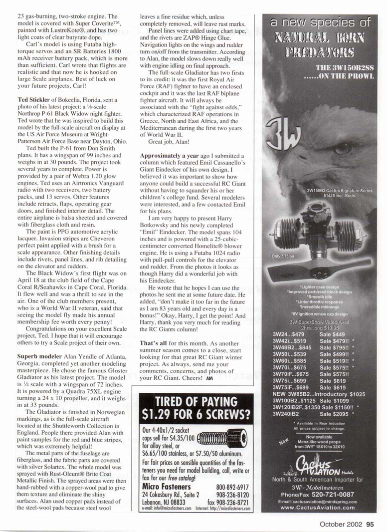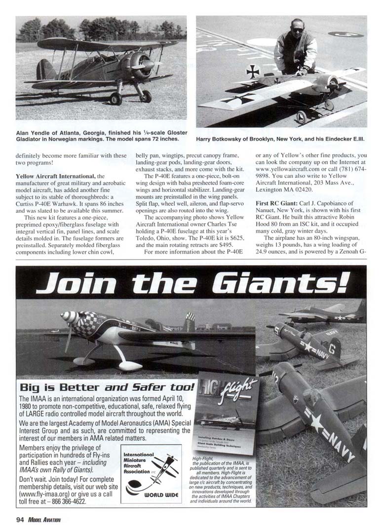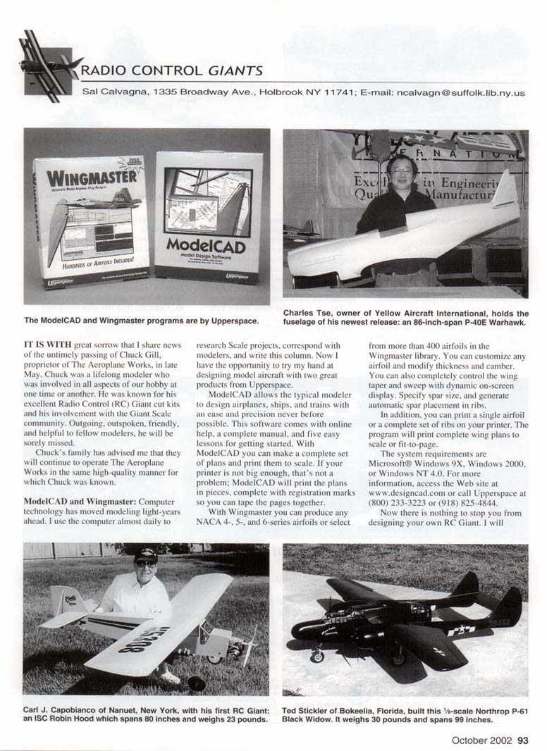 IT IS WITH great sorrow that I share news of the untimely passing of Chuck Gill, proprietor of The Aeroplane Works, in late May. Chuck was a lifelong modeler who was involved in all aspects of our hobby at one time or another. He was known for his excellent Radio Control (RC) Giant cut kits and his involvement with the Giant Scale community. Outgoing, outspoken, friendly, and helpful to fellow modelers, he will be sorely missed. Chuck's family has advised me that they will continue to operate The Aeroplane Works in the same high-quality manner for which Chuck was known. ModelCAD and Wingmaster: Computer technology has moved modeling light-years ahead. I use the computer almost daily to research Scale projects, correspond with modelers, and write this column. Now I have the opportunity to try my hand at designing model aircraft with two great products from Upperspace. ModelCAD allows the typical modeler to design airplanes, ships, and trains with an ease and precision never before possible. This software comes with online help, a complete manual, and five easy lessons for getting started. With ModelCAD you can make a complete set of plans and print them to scale. If your printer is not big enough, that's not a problem; ModelCAD will print the plans in pieces, complete with registration marks so you can tape the pages together. With Wingmaster you can produce any NACA 4-, 5-, and 6-series airfoils or select from more than 4(X) airfoils in the Wingmaster library. You can customize any airfoil and modify thickness and camber. You can also completely control the wing taper and sweep with dynamic on-screen display. Specify spar size, and generate automatic spar placement in ribs. In addition, you can print a single airfoil or a complete set of ribs on your printer. The program will print complete wing plans to scale or fit-to-page. The system requirements are Microsoft® Windows 9X, Windows 2000. or Windows NT 4.0. For more information, access the Web site at www.designcad.com or call Upperspace at (800) 233-3223 or (918) 825-4844. Now there is nothing to stop you from designing your own RC Giant. I will definitely become more familiar with these two programs! Yellow Aircraft International, the manufacturer of great military and aerobatic model aircraft, has added another fine subject to its stable of thoroughbreds: a Curtiss P-40E Warhawk. It spans 86 inches and was slated to be available this summer. This new kit features a one-piece, preprimed epoxy/fiberglass fuselage with integral vertical fin, panel lines, and scale details molded in. The fuselage formers are preinstalled. Separately molded fiberglass components including lower chin cowl, belly pan, wingtips, precut canopy frame, landing-gear pods, landing-gear doors, exhaust stacks, and more come with the kit. The P-40E features a one-piece, bolt-on wing design with balsa presheeted foam-core wings and horizontal stabilizer. Landing-gear mounts are preinstalled in the wing panels. Split flap, wheel well, aileron, and flap-servo openings are also routed into the wing. The accompanying photo shows Yellow Aircraft International owner Charles Tse holding a P-40E fuselage at this year's Toledo, Ohio, show. The P-40E kit is $625, and the main rotating retracts are $495. For more information about the P-40E or any of Yellow's other fine products, you can look the company up on the Internet at www.yellowaircraft.com or call (781) 674-9898. You can also write to Yellow Aircraft International, 203 Mass Ave., Lexington MA 02420. First RC Giant: Carl J. Capobianco of Nanuet, New York, is shown with his first RC Giant. He built this attractive Robin Hood 80 from an ISC kit, and it occupied many cold, gray winter days. The airplane has an 80-inch wingspan, weighs 13 pounds, has a wing loading of 24.9 ounces, and is powered by a Zenoah G-23 gas-burning, two-stroke engine. The model is covered with Super Coverite™, painted with LustreKote®, and has two light coats of clear butyrate dope. Carl's model is using Futaba high-torque servos and an SR Batteries 1800 mAh receiver battery pack, which is more than sufficient. Carl wrote that flights are realistic and that now he is hooked on large Scale airplanes. Best of luck on your future projects. Carl! Ted Stickler of Bokeelia, Florida, sent a photo of his latest project: a '/fi-scale Northrop P-61 Black Widow night fighter. Ted wrote that he was inspired to build this model by the full-scale aircraft on display at the US Air Force Museum at Wright-Patterson Air Force Base near Dayton, Ohio. Ted built the P-61 from Don Smith plans. It has a wingspan of 99 inches and weighs in at 30 pounds. The project took several years to complete. Power is provided by a pair of Webra 1.20 glow engines. Ted uses an Airtronics Vanguard radio with two receivers, two battery packs, and 13 servos. Other features include retracts, flaps, operating gear doors, and finished interior detail. The entire airplane is balsa sheeted and covered with fiberglass cloth and resin. The paint is PPG automotive acrylic lacquer. Invasion stripes are Cheveron perfect paint applied with a brush for a scale appearance. Other finishing details include rivets, panel lines, and rib detailing on the elevator and rudders. The Black Widow's first flight was on April 18 at the club field of the Cape Coral R/Seahawks in Cape Coral, Florida. It flew well and was a thrill to see in the air. One of the club members present, who is a World War II veteran, said that seeing the model fly made his annual membership fee worth every penny! Congratulations on your excellent Scale project, Ted. I hope that it will encourage others to try a Scale project of their own. Superb modeler Alan Yendle of Atlanta, Georgia, completed yet another modeling masterpiece. He chose the famous Gloster Gladiator as his latest project. The model is '/4 scale with a wingspan of 72 inches. It is powered by a Quadra 75XL engine turning a 24 x 10 propeller, and it weighs in at 33 poun