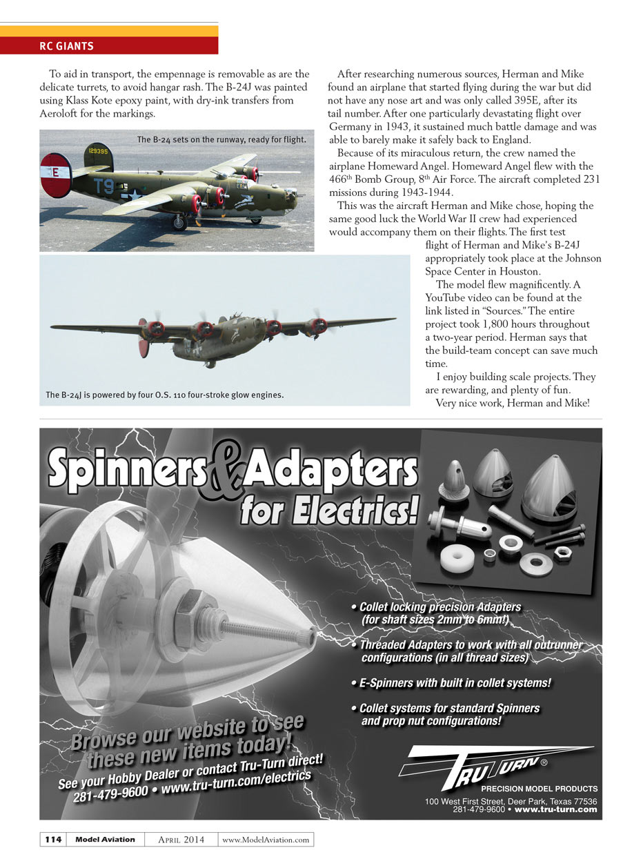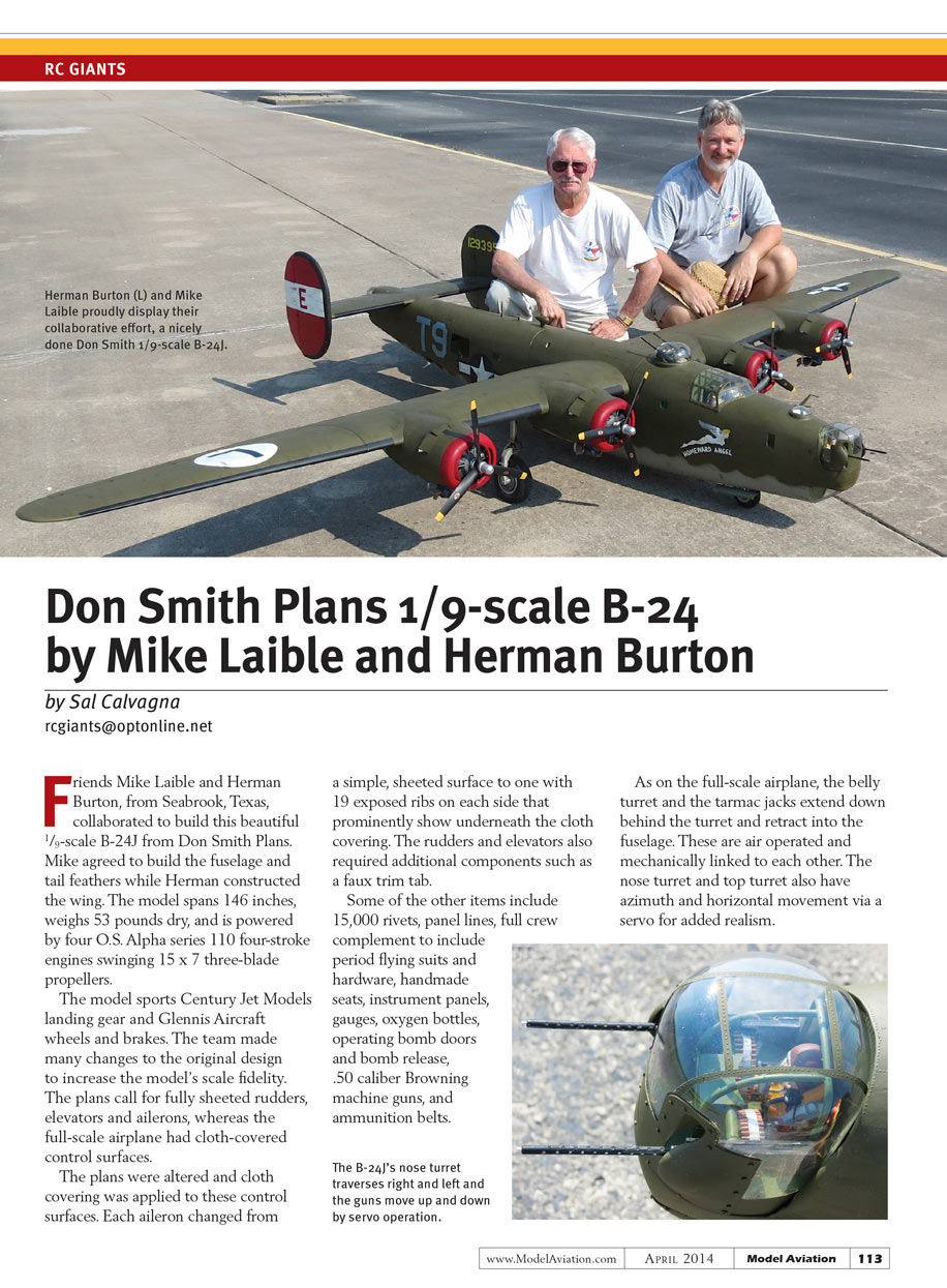 Friends Mike Laible and Herman Burton, from Seabrook, Texas, collaborated to build this beautiful 1/9-scale B-24J from Don Smith Plans. Mike agreed to build the fuselage and tail feathers while Herman constructed the wing. The model spans 146 inches, weighs 53 pounds dry, and is powered by four O.S. Alpha series 110 four-stroke engines swinging 15 x 7 three-blade propellers.