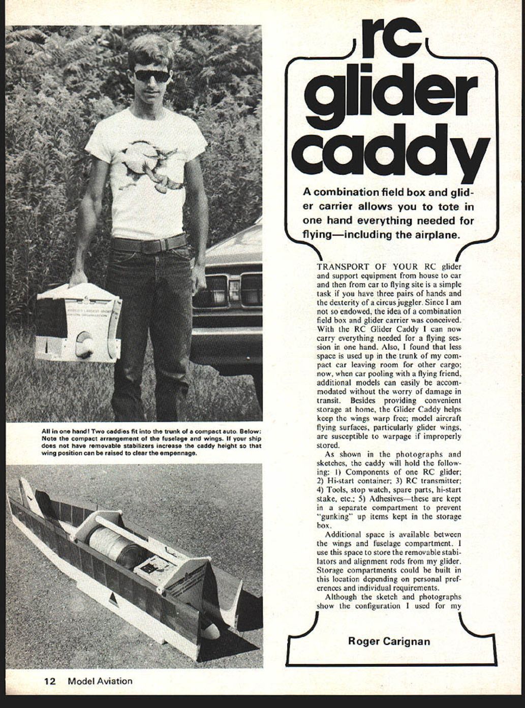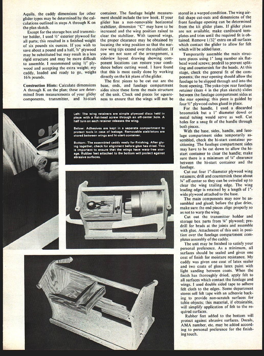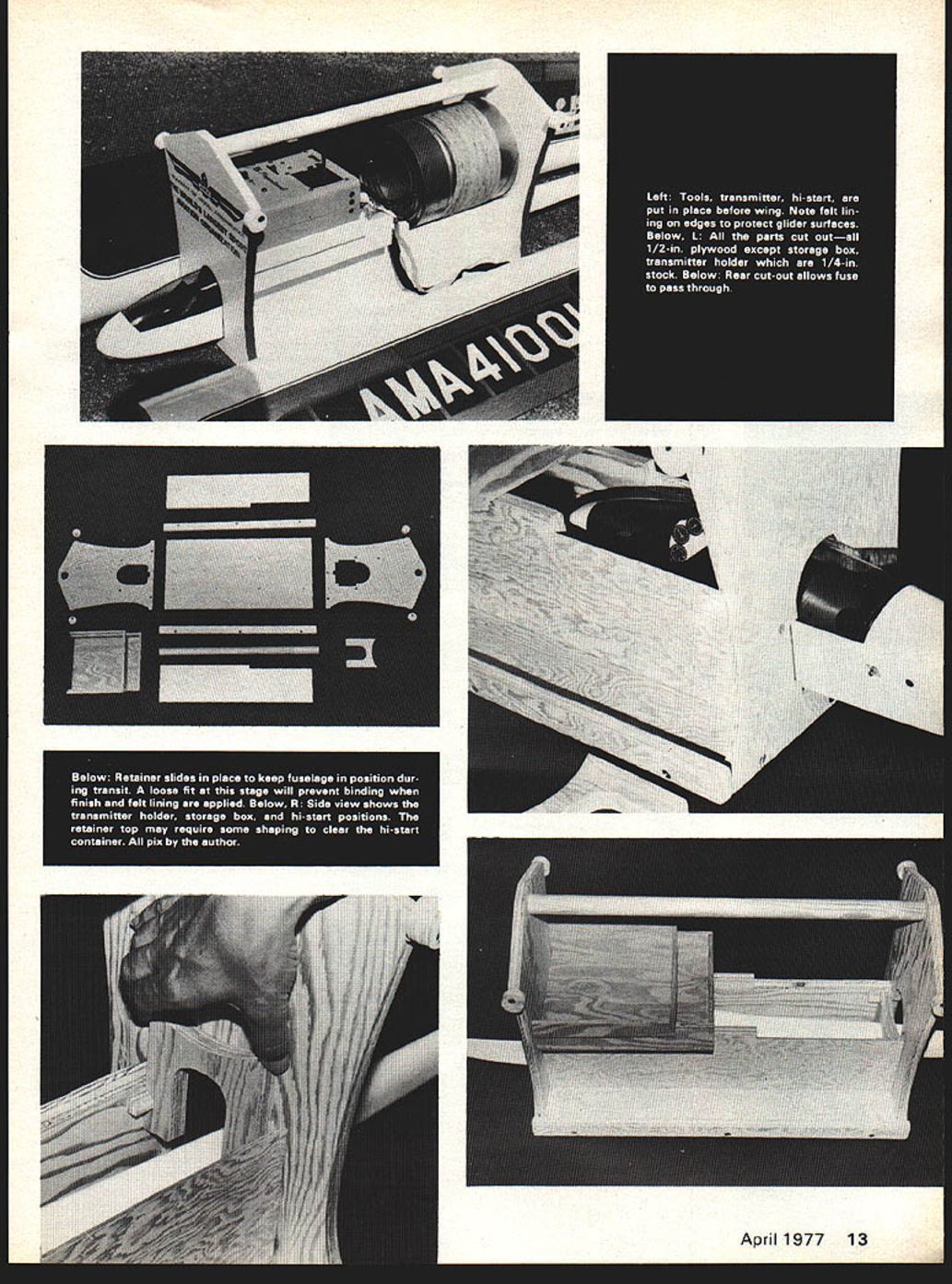12 Model Aviation glider caddy combination field box glid er carrier allows tote hand everything needed lane TRANSPORT OF YOUR RC glider support equipment house car car flying site simple task have three pairs hands dexterity circus juggler Since am endowed idea combination field box glider carrier conceived RC Glider Caddy can now carry everything needed flying ses sion hand Also found less space used up trunk com pact car leaving room other cargo now car pooling flying friend additional models can easily accom modated worry damage transit Besides providing convenient storage home Glider Caddy helps keep wings warp free model aircraft flying surfaces particularly glider wings susceptible warpage improperly stored As shown photographs sketches caddy will hold follow ing 1 Components RC glider 2 Hi-start container 3 RC transmitter 4 Tools stop watch spare parts hi-start stake etc 5 Adhesivesthese kept separate compartment prevent gunking up items kept storage box Additional space available between wings fuselage compartment use space store removable stabi lators alignment rods glider Storage compartments could built location depending personal pref erences individual requirements Although sketch photographs show configuration used Roger Carignan S hand Two caddies fit trunk compact auto Below Note compact arrangement fuselage wings Ship does have removable stabilizers increase caddy height wing position can raised clear empennage April 1977 13 Aquila caddy dimensions other glider types may determined cal culations outlined steps through K plan sketch Except storage box transmit ter holder used rior plywood parts resulted finished weight six pounds six ounces wish save about pound half /8 plywood may substituted may result less rigid structure may difficult assemble recommend using wood accepting extra weight caddy loaded ready go weighs 161/4 pounds Construction Hints Calculate dimensions through K plan deter mined measurements glider components transmitter hi-start container fuselage height measure ment should include tow hook glider has non-removable horizontal stabilizer dimension C may have increased wing position raised clear stabilizer tapered wings proper clearance may obtained locating wing position nar row wing tips extend over stabilizer sure arrangement sideview layout drawing showing com ponent locations can restore confi dence before cutting wood have found easily done working directly kit plans glider first pieces cut out base ends fuselage compartment sides since form main structure unit Check end pieces square ness ensure wings will stored warped condition wing air foil shape cut-outs dimensions front fuselage opening can determined kit glider plans glider plans available make cardboard tem plates trim until required fit ob tained Remove 1/32 extra surfaces contact glider allow felt will added later Temporarily assemble main struc ture pieces using 1 long number six flathead wood screws predrill prevent split ting countersink heads stage check general fit com ponents rear opening should allow fuselage slipped through front opening yoke-type rear fuselage retainer item 4 plan sketch slides between fuselage compartment sides rear opening piece guided four ood cubes glued place handle used discarded broomstick diameter dowel metal tubing would serve well Cut holes snug fit handle through both pieces base sides handle fuse lage compartment sides temporarily sembled check hi-start container po sitioning fuselage compartment sides may have cut down allow histart container clear handle make sure minimum 1/8 clearance between hi-start container fuselage Cut out four l-diameter plywood wing retainers drill countersink about center can swiveled up clear wing trailing edge wing leading edge retained length Iwide plywood attached base main components may now sembled glued before glue dries make sure end pieces align properly warp wing Cut out transmitter holder storage box parts ood pre drill brads joints assemble glue Attachment unit posi tion over fuselage compartment com pletes assembly caddy unit may finished satisfy personal preference As minimum surfaces should sealed given coat finish moisture resistance caddy given coat latex sealer two coats gloss latex paint light sanding between coats finish has thoroughly dried apply felt surfaces contact fuselage wings used double sided tape adhere felt cloth edges Somedepartment stores sell felt tape adhesvie back ing provide non-scratch surfaces table objects material obtainable will simplify application felt re quired surfaces Rubber feet added bottom will protect against abrasive surfaces Decals AMA number etc may added accord ing personal preference finish ing touch STORAGE BOX AND TRANSMITTER HOLDER 1/4 PLYWOOD I, 3 4, PREDRILL FOR BRADS AND ASSEMBLEIDIA HANDLE WITH GLUE COVER SURFACES WHICH CONTACT GLIDER WITH AQUILA OUTLINE I 7 II II U r TRANSMITTER -j ASSEMBLE CADDY WITH 16 FLAT HEAD WOOD SCREWS AND GLUE H ISTART 7 1811 DIMENSIONS ATRANSMITTER WIDTH BTRANSMITTER HEIGHT I/B CMAXIMUM WING CHORD D WING THICKNESS EMAXIMUM FUSELAGE HEIGHT I/B FMAXIMUM FUSELAGE WIDTH 1/8 GHEIGHT OF FUSELAGE AT HISTART LOCATION HHEIGHT OF HSTART CONTAINER JA2xD 4-1/2 K G 4-HC 3 NOTES IALL PARTS EXCEPT STORAGE BOX ARE 1/2 PLYWOOD 2SHAPE TO FIT WING AIRFOIL 3I DIAMETER 1/2 PLYWOOD WING RETAINERS 4REAR FUSELAGE RETAINER REMOVABLE 5FRONT OPENING TO FIT THE FUSELAGE 6REAR OPENING TO CLEAR FUSELAGE 7CUT OUT FOR HISTART V REAR HALF SHOWN__________________ II II U C J -a 01R/C GLIDER CADDY BY ROGER CARIGNAN 0 CD