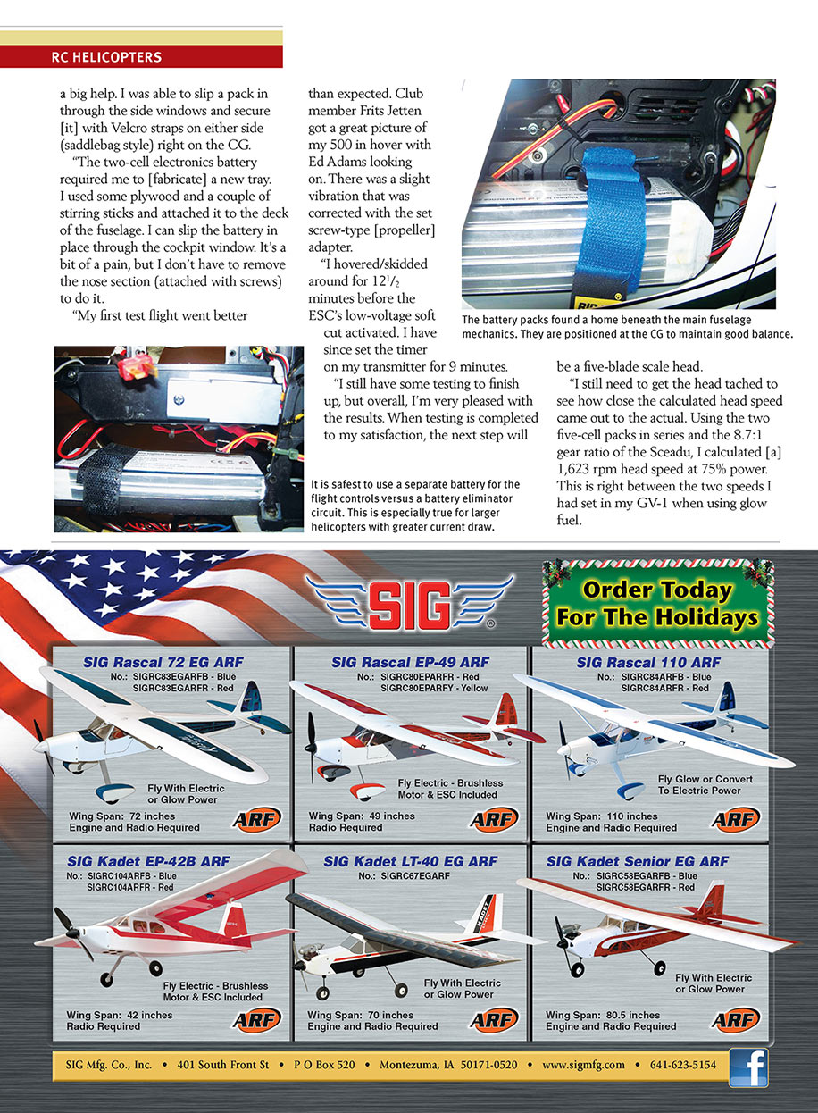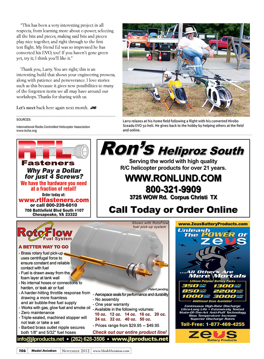 T his is the place for RC helicopter discussion, and I am glad you are here. In this issue’s column, you will learn about a creative conversion that my friend Larry Rogers made. Helicopter pilots are resourceful, and Larry proves that by explaining his recent project. It is a nitro-to-electric power transformation of a popular helicopter kit. I will let him describe the process.
