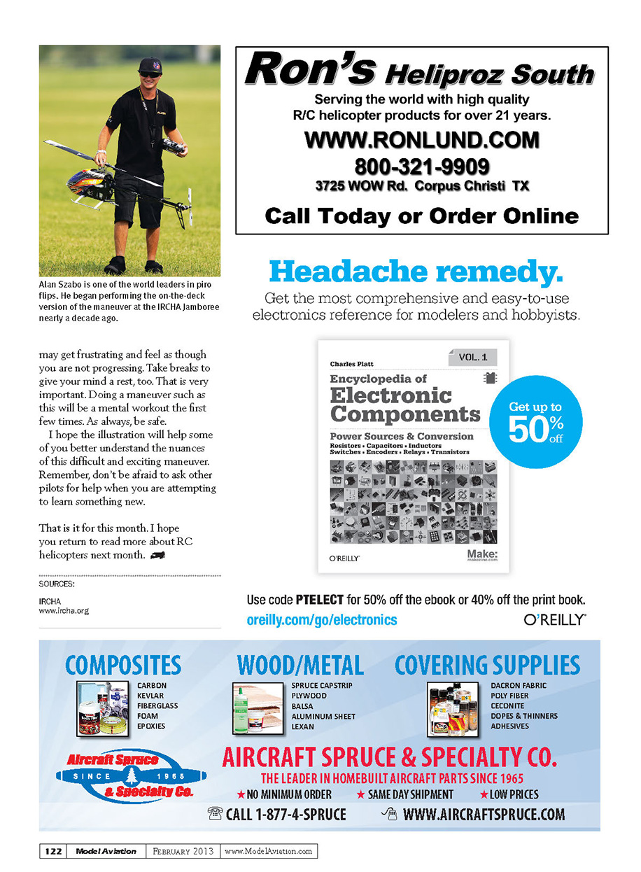 Alan Szabo is one of the world leaders in piro flips. He began performing the on-the-deck version of the maneuver at the IRCHA Jamboree nearly a decade ago. get frustrating and feel as though you are not progressing. Take breaks to give your mind a rest, too. That is very important. Doing a maneuver such as this will be a mental workout the first few times. As always, be safe. I hope the illustration will help some of you better understand the nuances of this difficult and exciting maneuver. Remember, don’t be afraid to ask other pilots for help when you are attempting to learn something new. That is it for this month. I hope you return to read more about RC helicopters next month. SOURCES: IRCHA www.ircha.org122Model Aviation February 2013www.ModelAviation.com119