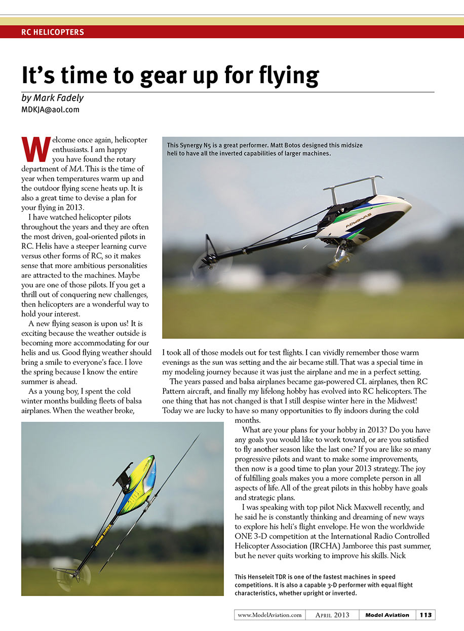Welcome once again, helicopter people. I am happy you have found the Rotary department of MA. This is the time of year when temperatures warm up and the outdoor flying scene heats up. It is also a great time to lay out a plan for your flying in 2013. I have watched helicopter pilots throughout the years and they are often the most driven, goal-orientated pilots in RC. Helis have a steeper learning curve verses other forms of RC, so it makes sense that more ambitious personalities are attracted to the machines. Maybe you are one of those pilots. If you get a thrill out of conquering new challenges, then helis are a wonderful way to keep your interest.