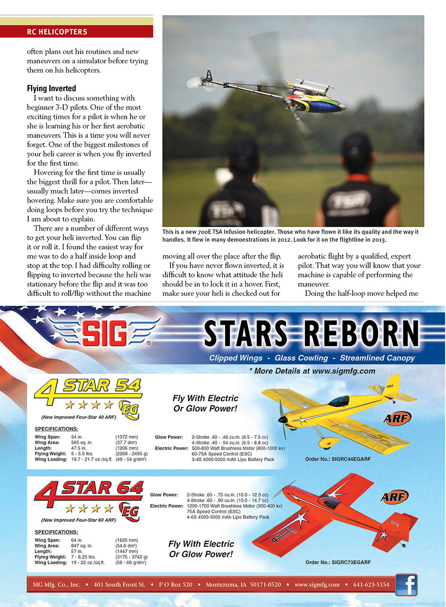 If you feel you are ready to tackle inverted flight then make it a priority for 2013. I guarantee it will be one of the most exciting experiences you could ever have in RC. If you are new to flipping your helicopter upside down, you may want to check with your doctor to see if that much excitement is okay for you—haha. That is funny, but actually somewhat serious.