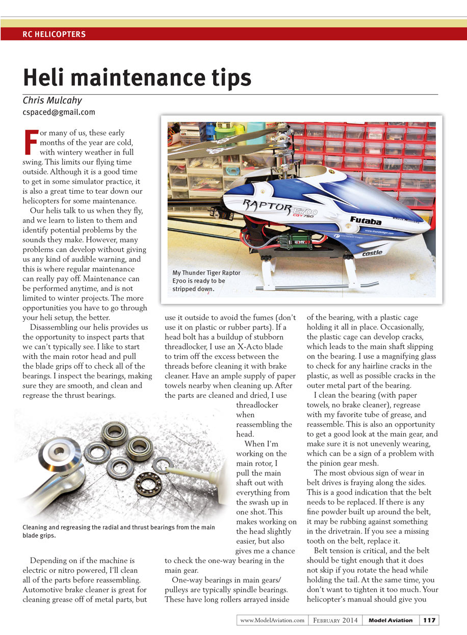 For many of us, these early months of the year are cold, with wintery weather in full swing. This limits our flying time outside. Although it is a good time to get in some simulator practice, it is also a great time to tear down our helicopters for some maintenance.
