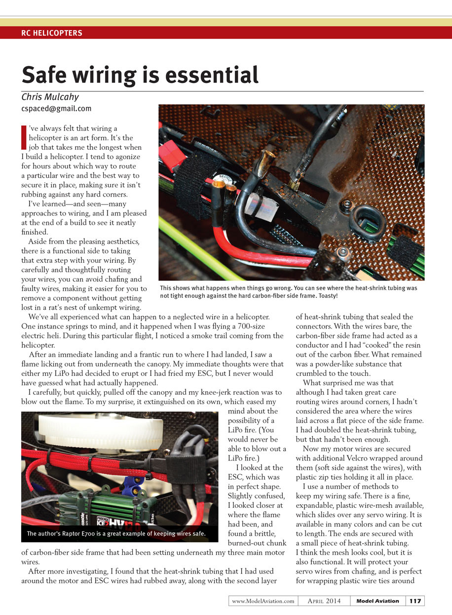 We’ve all experienced what can happen to a neglected wire in a helicopter. One instance springs to mind for me, and it happened when I was flying a 700-size electric heli. During this particular flight, I noticed a smoke trail coming from the helicopter.