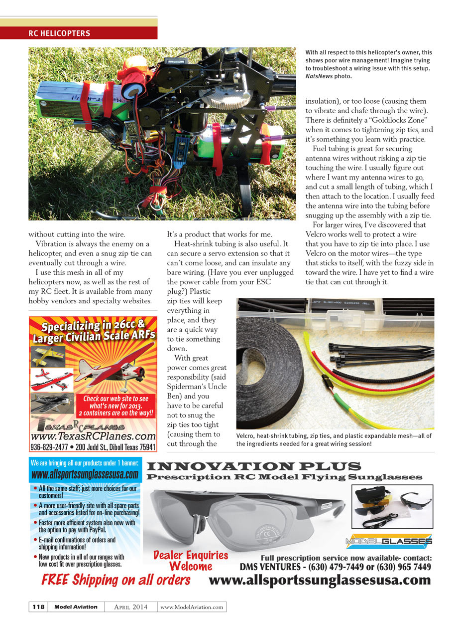 Vibration is always the enemy on a helicopter, and even a snug zip tie can eventually cut through a wire. I use this mesh in all of my helicopters now, as well as the rest of my RC fleet. It is available from many hobby vendors and specialty websites. It’s a product that works for me.