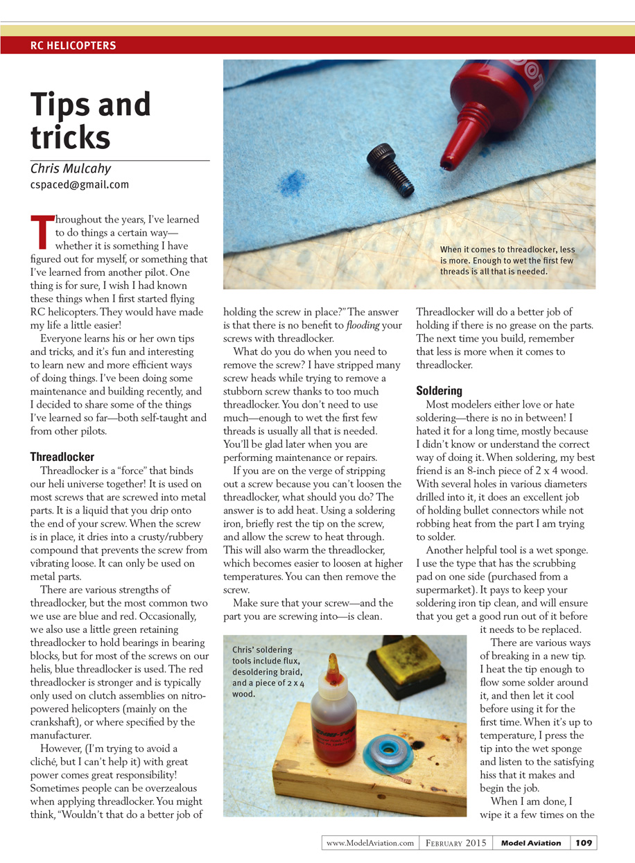 Everyone learns his or her own tips and tricks, and it’s fun and interesting to learn new and more efficient ways of doing things. I’ve been doing some maintenance and building recently, and I decided to share some of the things I’ve learned so far—both self-taught and from other pilots.