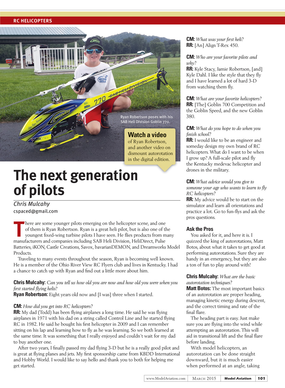 RR: I would like to be an engineer and someday design my own brand of RC helicopters. What do I want to be when I grow up? A full-scale pilot and fly the Kentucky medevac helicopter and drones in the military.