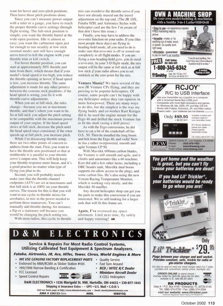 IT'S ANOTHER GREAT month to be enjoying the sport of Radio Control (RC) helicopters! Almost everywhere in the country this is peak flying season. I hope you are all enjoying all the time you get to spend with this great sport and hobby. I've been getting many letters and E-mails lately. Thank you. My requests for input about what topics to cover got exactly the response I expected, and they were roughly evenly divided among "more flying stuff." "more setup stuff," and "more product stuff." I've been writing long enough to know that you can't please everyone with every column, so I'll keep trying to give some coverage to all three of those areas and a few other things as best I can. From all those I received, the following is an "average" letter from Dave Stafford. "I'm an avid reader of your column in MA and I noticed your request for input in the latest issue. Having started fixed wing RC back in 1970, I guess I could be classified as an old-timer, but my experience with RC helicopters only goes back five or six years. In that time, I've learned how to fly my entry-level Shuttle ZX in FF, nose-in hover, out-front 360s as well as stall turns (only about 60 degrees nose up, however), horizontal 8s, constant-rate descents to landing, etc. "Not all that long ago I would've been happy with those skills, but now I'm getting bored. I would like to improve my flying skills, but realize that I must master the proper setup of the so-called Idle Up modes before going much further. "I'm having a difficult time getting my radio programmed for Idle Up flying. I would prefer that there be no noticeable change when hitting the switch while in a hover. I've accomplished that part of the setup, but run into trouble in the realm of 0 degrees pitch and below. "The first time I used Idle Up I, the helicopter flew okay until I started a shallow descent, whereupon I experienced a large rotor overspeed and yaw to the left. By the time I got the nose under control and hit the switch back to Normal, the main rotor had been overstressed for maybe 5 seconds or more. "Now I'm a little intimidated about this realm of flight. Maybe you could shed some light on the ins and outs of the Idle Up modes in one of your future columns. "Many thanks for your fine efforts! (Shuttle ZX, RD6000 radio, O.S. .32 SX-H, JR 120BB gyro. TT muffler. NMP 550 Razors)" I like this letter because it gives me a lot of information about equipment and pilot skills and experience. It's much more useful than the E-mails that arrive with something like, "Why can't I get my Raptor to climb inverted?" It seems as though the transition from nonaerobatic flying and hovering to the more advanced aerobatics and 3-D flying is a major sticking point for many pilots. At my shop we get calls every day from pilots who are lost at this stage of the game. So I'm going to rehash prior comments here in hopes that I can take some of the difficulty out of this challenging phase of helicopter flight. When I first started using "idle-up" modes, I too was uncomfortable with the fact that in "normal" mode I hovered at midstick (the old "tradition") and in my idle-up modes I hovered at three-quarters stick. Among other things, it meant that switching into idle up from the normal mode while in hover was never smooth and precise. I either watched the helicopter drop as the pitch changed from hover pitch to zero pitch or I overcorrected and the helicopter shot up as I advanced the stick to three-quarters when I activated the idle up. So I changed my setup to allow more consistency in hovering between the various flight modes—and between upright and inverted hovering. The typical V-shaped 3-D throttle curve was inarguably the only way to go for the idle-up night mode, so I changed my setup in 24—L> normal mode to have zero pitch at •.;;;•'!••• midstick and hover pitch at three-quarters stick. I also changed my throttle-hold pitch curve to have zero pitch at midstick, leaving the top and bottom points alone. No matter what flight mode is active, I know that midstick is zero pitch in the main blades and that hover will be at approximately three-quarters stick. Whether I'm hovering or in forward flight, I can change flight modes transparently without the helicopter dropping or jumping. (For those uninterested in aerobatics, there is no advantage to this style of setup. In fact, it compresses the throttle/collective response to stick travel from hover to full stick, which makes the throttle/collective h; more sensitive in that region. So if you are mainly interested in precision hovering, it's probably best to stay with the traditional "hover at midstick" setup.) You will need to adjust the throttle curves to match your new pitch curve. If you are used to hovering at midstick and you change to zero pitch at midstick, obviously the throttle setting at midstick will need to be lowered. That brings up another advantage of the setup I describe: since all modes are zero pitch at midstick, the correct throttle setting for all flight modes is the same for midstick through full stick unless you want to run different head speeds between the different modes. In setting the throttle curves, remember this: you can measure the pitch, and you cannot measure the power. So you should set the pitch curves first, using a pitch gauge to ensure that you have the settings you want for hover and zero-pitch positions. Then leave those pitch positions alone. Since you can't measure power output with a ruler or a gauge, you have to reach the proper throttle-curve settings through flight testing. The full-stick position is simple: you want the throttle barrel at the wide-open position. Idle is almost as easy; you want the carburetor open just far enough to run steadily at low stick (normal mode) and still have enough servo travel to kill the engine with your throttle trim or kill switch. For hover throttle position, you can start at approximately 50% throttle and tune from there, which 