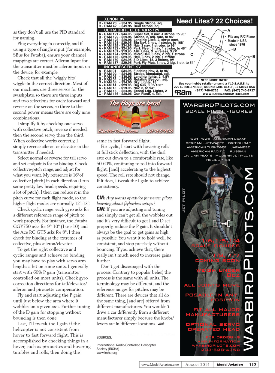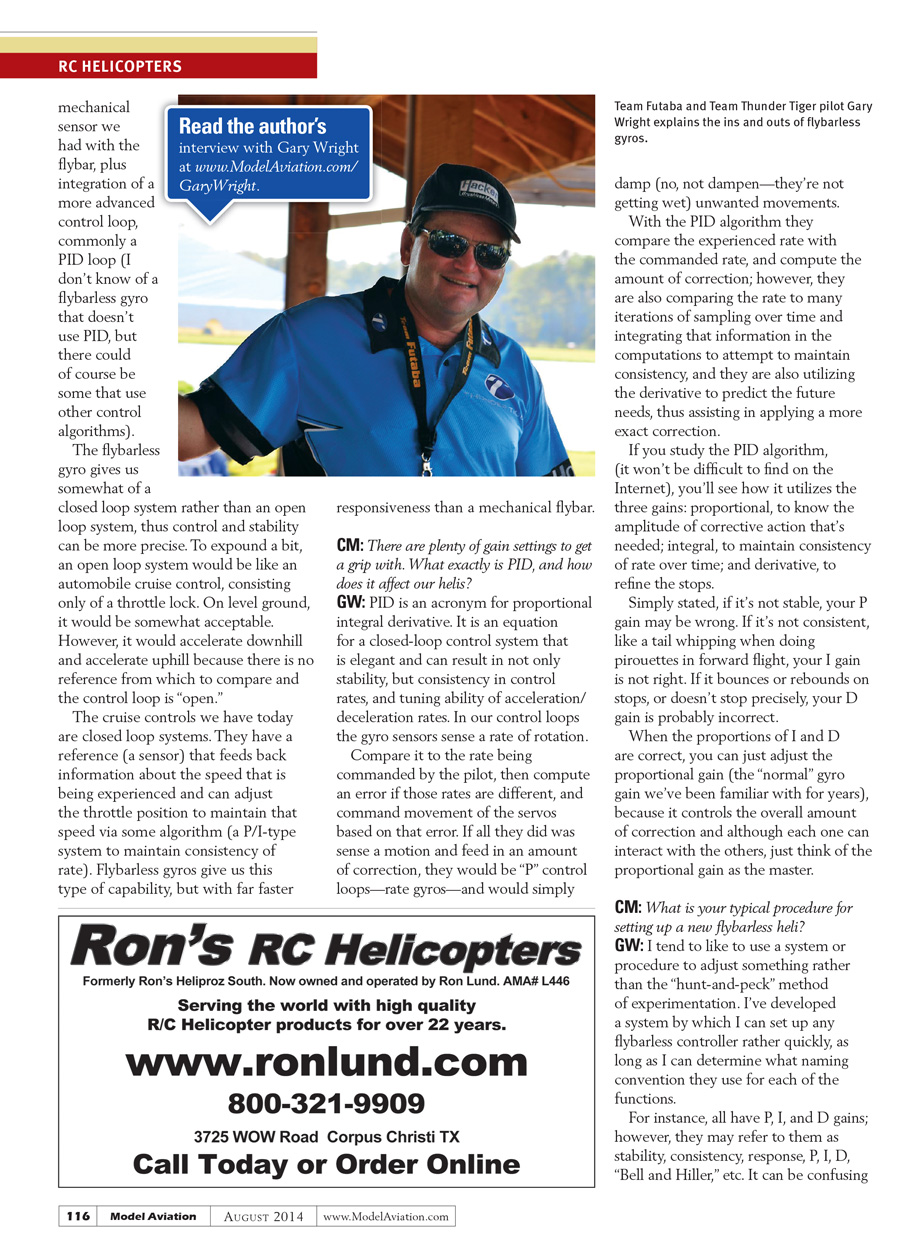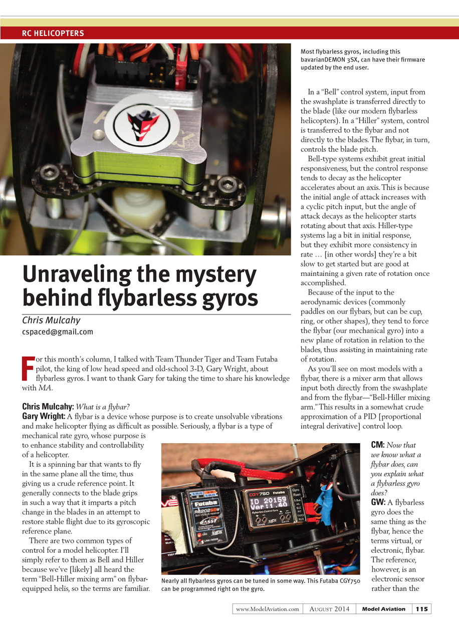 For this month’s column, I talked with Team Thunder Tiger and Team Futaba pilot, the king of low head speed and old-school 3-D, Gary Wright, about flybarless gyros. I want to thank Gary for taking the time to share his knowledge with MA.