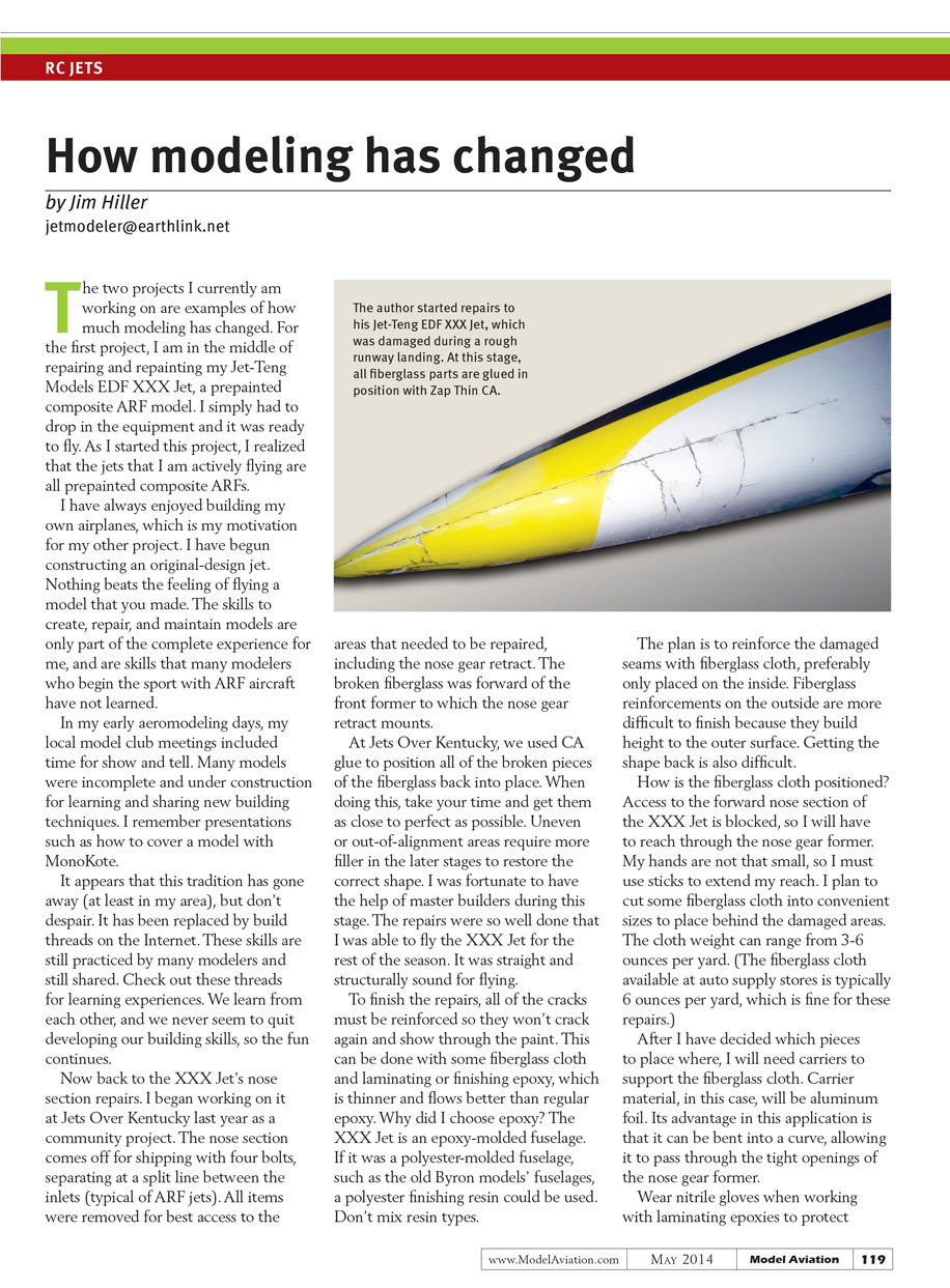 The two projects I currently am working on are examples of how much modeling has changed. For the first project, I am in the middle of repairing and repainting my Jet-Teng Models EDF XXX Jet, a prepainted composite ARF model. I simply had to drop in the equipment and it was ready to fly. As I started this project, I realized that the jets that I am actively flying are all prepainted composite ARFs.