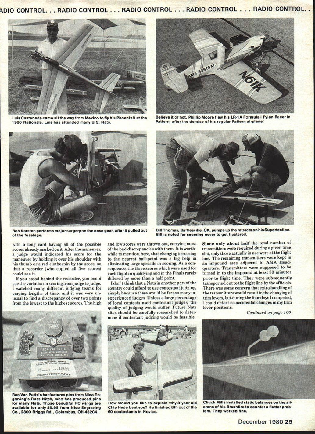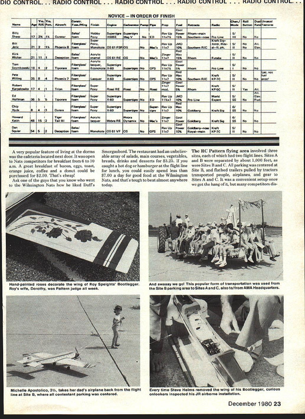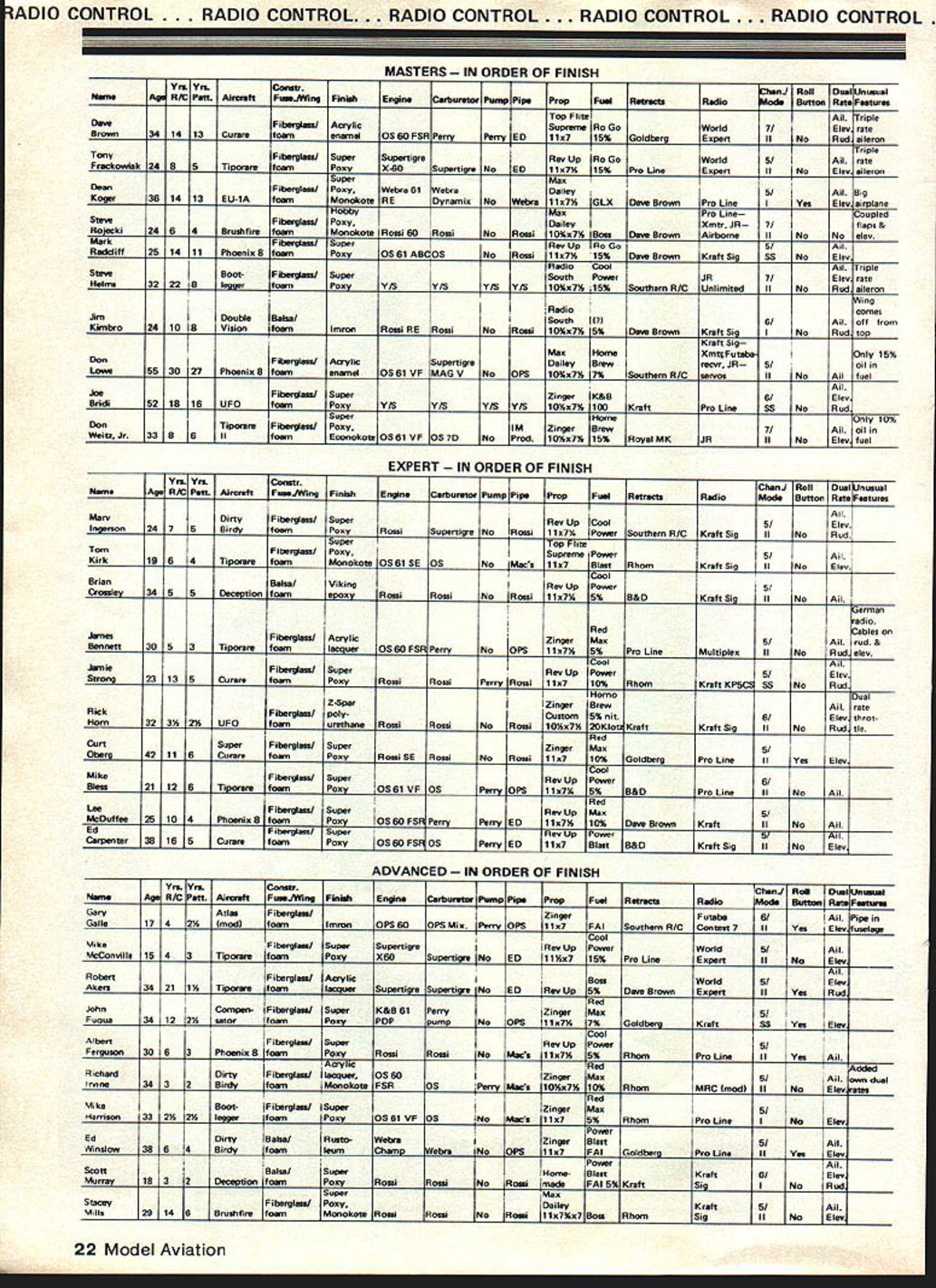 RADIO CONTROL. RADIO CONTROL. RADIO CONTROL . RADIO CONTROL. RADIO CONTROL RC Pattern Ron Van Putte NO TWO Nats ever seem same 1980 Nats no exception Wilmington OH site lot offer its limitations too Unfortunately events like RC Soaring RC Helicopters Free Flight held Wright Field WrightPatterson AFB about 35 m away However pattern fliers rare opportunity watch CL Aerobatics Speed competition since circles about 100 yards away two three RC Pattern sites Nevertheless competitors 20 Model Aviation didnt consider rare opportunity Jet Speed job fired up middle maneuver personally missed seeing Indoor compe foreground columnist/Pattern-flier Ron Van Putte puts tour duty contestant judge Bill Ridenbaugh sits alongside tition since held Cincinnati Indoor flying saw 1978 Nats Lake Charles great looked forward seeing again just too far go Billy Sharp nau iu mau emergonuy repair after nose gear problems reward earn ing first place Novice neres no nesa r.Ilrr rtiau now ne reels about placing Masters qualifying ht-year-old Chip Hyde shared airplane n uennett uses cabies operate 00th thewith dad crafts unusual feature ruader elevators Tiporare Jimuses separate servos aileron placed fourth Expert Patternelevator half has saved model once far Team Brown does again Dave edged Out Tony Frackowiak capture Masters crown yet another year H Tony Frackowiak 2nd Dave Brown 1 st Dean Koger 3rd DIO CONTROL. RADIO CONTROL . RADIO CONTROL . RADIO CONTROL. RADIO CONTROL. As far living accomodations concerned dormitories left lot desired Air Force dormitories brought back old memories late 1950s early 1960s Air Force ROTC cadet later lieutenant Unfortunately dorms well maintained windows neither venetian blinds nor drapes made coed nature dorms very difficult females Since sheets pillow cases towels provided windows ended up sheet makeshift drape rooms air-conditioned occupants left doors open promote cross-ventila tion privacy matter personal courtesy situation grim appears because people get used incon veniece weather did cool off mid-900 weather faced first day end week living together like seasoned veterans few complaints heard except CL pilot chose make engine test run room 200 am late week December 1980 21 bcotx irray almost iost tfle stick flis trans mitter screw came loose saved Ins World Engines gang displaytheirtrophies airplanes radios tnat maoetnelrwlnnlng airplane went finish 9th Advanced performances possible Poppa John Maloney World Engines owner looks wonder Jamie Strong really felt relaxed awaited last RC chief judge Ti Ginnis confers U JA president Howard qualifying flight Expert finished fifthCrispin Dick McGraw Travis also District IX AMA vice-president n~y raI1uu mis wamnum transmitter tray sucn traysEd Izzo displays finger saddles has using histrans neck-straps use 80 Nationalsmitter sticks years Ed sells youre interested ADIO CONTROL RADIO CONTROL O CONTROL RADIO CONTROL . RADIO CONTROL MASTERS RDER OF FINISH VIL ViiComicImnJ Roll Dm1 nmual WanR Putt Alreiift FuaJWlng FinidiEngineCarbwetor Pump Pup PropFoal ResistsRadio[Buttoss Rat Features Top FinefAll riple DaveFberglaaa/ AcrylicSupreme Ro GoWorld7/ IElev rote Brown34 14 13 CuratefoamenamelOSBOPSAPerryParry ED11x715% GoldbergExpertIINoRud aileron Iriple TonyFibaaglass/ SuperSupartigreRev Up Ro GoI World5/ IAll rate Frackowiak24 8 5TiporareSuperEDaileron FoxyX-60Supertie No11x71 15% Pro LineExpertIINo Max DeanFiberglaaslFoxyWebra 61WebraDailey5/AllBit Koger3614 13EU-lAfoamMonokotsRE DynamixNo Webra11x716I~I.XGLXDave BrownPro LineII YeaElav airplane Hobby Pro LineCoupled StevePibarglass/FoxyDaileyXmtr JR71flaps & Rojacki246 4BrushfirefoamMonolsoteRossi 60 RosalNo Road10%x71tBoss Dave Brown Airborne II No No elan MarkjI-iberglaas/Super UpRoGo5/All Radcliff2514Phoenix BfoamFoxyOSBIINO RossiliaTh15% aw Brown KraftSig 55 No Elen 1i {RadioCool riple SteveBoot-FiierglassjSuperjJSouthPowerJR7/Elev rate Halma32228 anPoxV/S Y/SV/S V/S10%x7%15% Southern R/C Unlimited II No Rud aileron mg IIIRadiocomes Jim bleIBalsa/South1716/Auoff Klmbro2410 6VisionfoamlmronRossi RERowNoRossi10%x71k15%ave BrownKraft SigII NoRd 1Kraft Sit MaxHomeXmttPuOnly 15% DonPiberglasslAorylicSupertigreDaileyBrewrecvr IR5/Oh Lowe55 Phoeoix8 foamenamelOSBI VP MAGV No OPS 10%x7%p%5outhemR/C servosIINoAu fuel fIAll IPiberglasslSuperZinger1556/Elan Biidl52iLtLUPOjfoamFoxyV/SV/SV/SV/S10%x7fl100KrxftPro LineSSNoRod ISuperHomeOnly 10% Don orare jFiberglass/PonyIMZingerBrew7/Alloil Waltz Jr338 tBIIIfownSoonokoix0561 VF057DNoProd10flx71k15%Royal MKJRIINoElanfuel EXPERT RDER OF FINISH RamAge R/C Patt Aircraft PsaejWlng FinWaEngineCarburetor Pump Pipe PropRetractsRadioMode Button Rate Features MareY Vrx1ComirjfTiiFl3l nasoal Ingerson2475En-dyfoamPonyRossSupertigre No Rossi11x7~PowerSouthern R/CKraft SitIINoROd DirtyFeberglass/SuperRev UpCoal5/ Super opFlitaTomFiberglass/Pony premePower5/All Kirk1964TiporarefoamMonokoteIS 61 SEOS11x7 Blast Rhom Kraft Sit II INO INoAll CooElan1 BrianEalsa/VikingI ev UpPower5/ Croasley34 5 5foamaooxRossiRosalNo jRossi11s7t5%B&DKraft SigII 1]1errnan Red bins ionesFiberglass/AcrylicZingerMan5/Allrod & Bennett3053foaml9OSBO FSRPerryNoOPSllx7fl5%Pro LineMultiplesIINoRudelan CoolAll JanleFiberglass/SuperRev UpPower5/Elen Strong23135CurarefoamPoxyRossiRossiPerry Rossi11x710%RhomKraftKSSNoRod HornoDual Z-SparIZingerBrewAllrate RickPiberglass/poly-Custom5% nit6/Elanthrot Horn32 3I 2I UFOfoamuretlsane RossiRossiNo Rood 10%x7lk 20Kb KraftKraftSigIINoRod tIe CurtSuperSuperI/ 42 11 6CureFoxyRossi SE RossiNo1x710% GoldbergPro LineIIElan Bless21 12 6 foamFoxy}0S61 VP 051x7I 5%B&DPro LineIINoAll MikxFiberglass/ SuperPower6/ LeaI Piberglsss/SuperRev UpMax5I McDoffaa25 10 4foamPony10560P5 PerryPerry EDllx7th10%Dave BrowisKraftIINoAll EdFiberglass/Super jRev UpPowerCarpenter38 16 5CurareFoxyOSBOPS OSPerry ED11a7Blast B&DKraftSigIINo Elan 7 orretves ___ ADVANCED RDER OF FINISH Irliheni Roll Dual masal PueaJWing PlnsjCarbseeIPsss Pipe PropFuel RetractsRadioMod 5f54PeatsNea ll17AtlasF