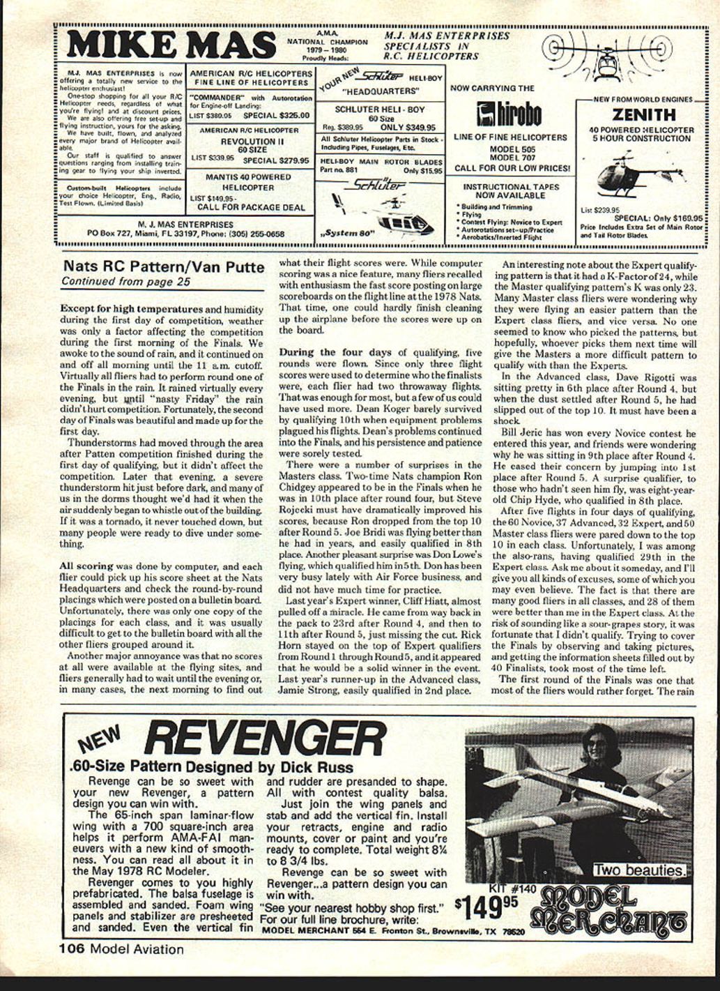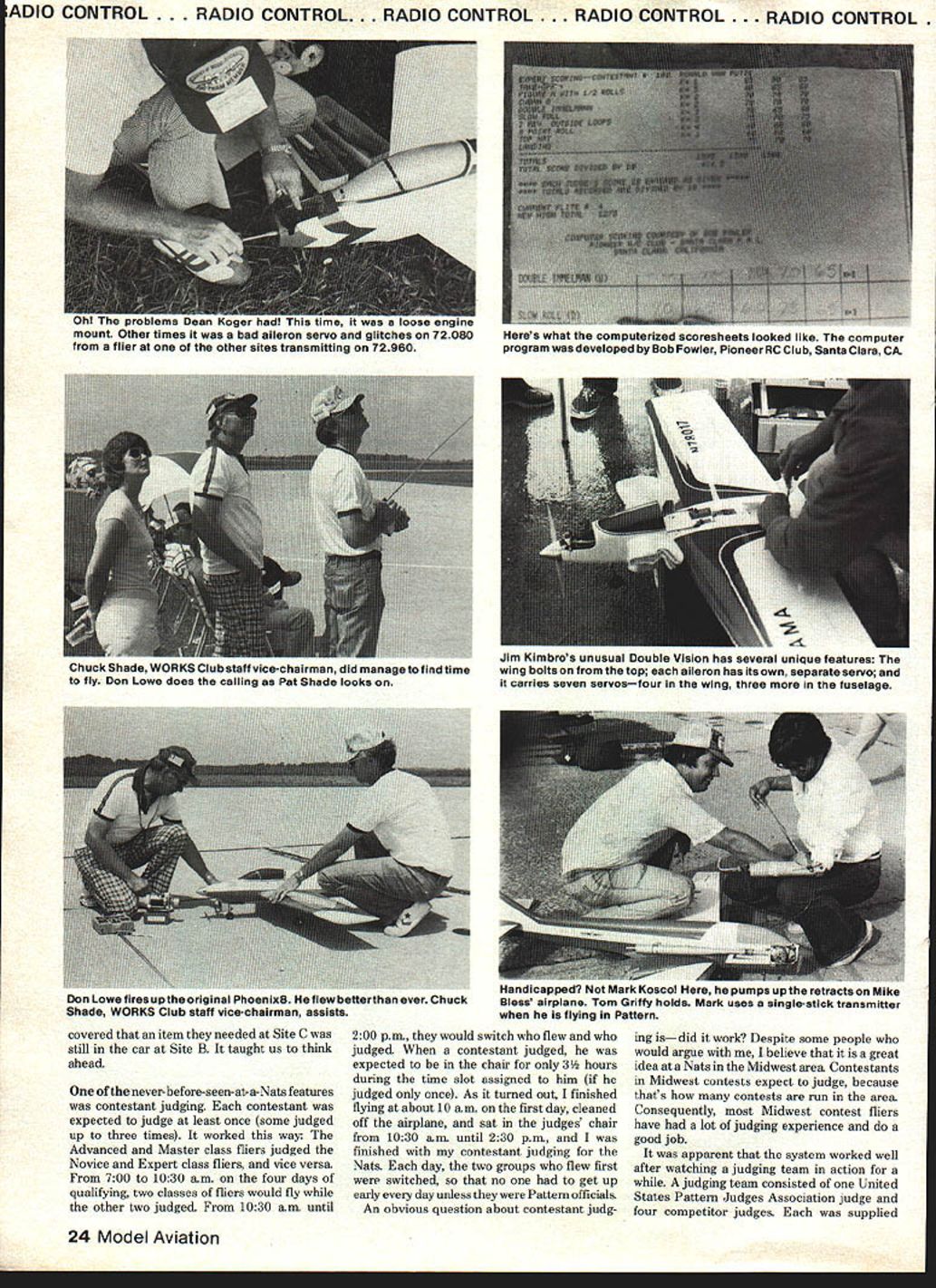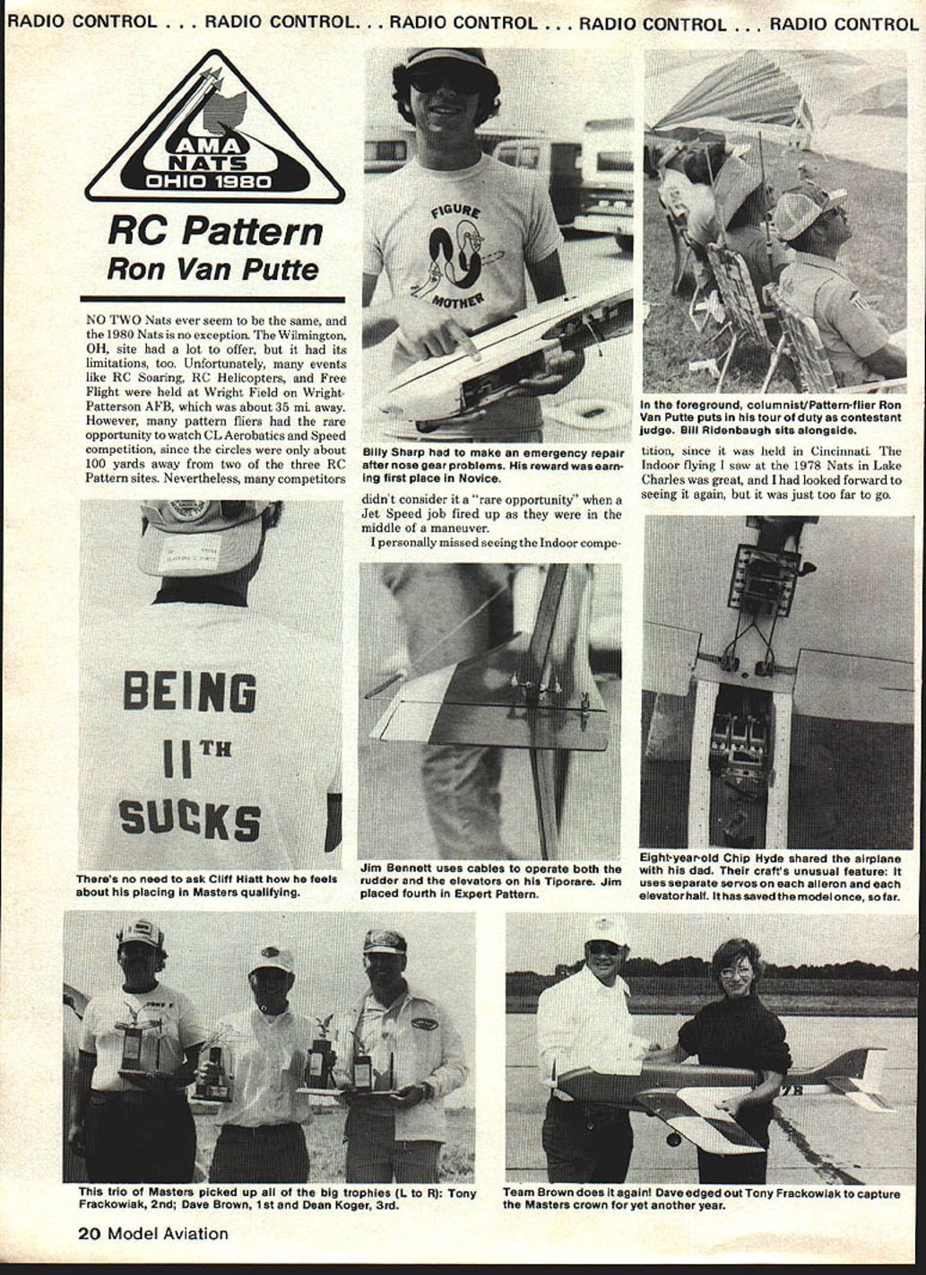 RADIO CONTROL. RADIO CONTROL. RADIO CONTROL . RADIO CONTROL. RADIO CONTROL RC Pattern Ron Van Putte NO TWO Nats ever seem same 1980 Nats no exception Wilmington OH site lot offer its limitations too Unfortunately events like RC Soaring RC Helicopters Free Flight held Wright Field WrightPatterson AFB about 35 m away However pattern fliers rare opportunity watch CL Aerobatics Speed competition since circles about 100 yards away two three RC Pattern sites Nevertheless competitors 20 Model Aviation didnt consider rare opportunity Jet Speed job fired up middle maneuver personally missed seeing Indoor compe foreground columnist/Pattern-flier Ron Van Putte puts tour duty contestant judge Bill Ridenbaugh sits alongside tition since held Cincinnati Indoor flying saw 1978 Nats Lake Charles great looked forward seeing again just too far go Billy Sharp nau iu mau emergonuy repair after nose gear problems reward earn ing first place Novice neres no nesa r.Ilrr rtiau now ne reels about placing Masters qualifying ht-year-old Chip Hyde shared airplane n uennett uses cabies operate 00th thewith dad crafts unusual feature ruader elevators Tiporare Jimuses separate servos aileron placed fourth Expert Patternelevator half has saved model once far Team Brown does again Dave edged Out Tony Frackowiak capture Masters crown yet another year H Tony Frackowiak 2nd Dave Brown 1 st Dean Koger 3rd DIO CONTROL. RADIO CONTROL . RADIO CONTROL . RADIO CONTROL. RADIO CONTROL. As far living accomodations concerned dormitories left lot desired Air Force dormitories brought back old memories late 1950s early 1960s Air Force ROTC cadet later lieutenant Unfortunately dorms well maintained windows neither venetian blinds nor drapes made coed nature dorms very difficult females Since sheets pillow cases towels provided windows ended up sheet makeshift drape rooms air-conditioned occupants left doors open promote cross-ventila tion privacy matter personal courtesy situation grim appears because people get used incon veniece weather did cool off mid-900 weather faced first day end week living together like seasoned veterans few complaints heard except CL pilot chose make engine test run room 200 am late week December 1980 21 bcotx irray almost iost tfle stick flis trans mitter screw came loose saved Ins World Engines gang displaytheirtrophies airplanes radios tnat maoetnelrwlnnlng airplane went finish 9th Advanced performances possible Poppa John Maloney World Engines owner looks wonder Jamie Strong really felt relaxed awaited last RC chief judge Ti Ginnis confers U JA president Howard qualifying flight Expert finished fifthCrispin Dick McGraw Travis also District IX AMA vice-president n~y raI1uu mis wamnum transmitter tray sucn traysEd Izzo displays finger saddles has using histrans neck-straps use 80 Nationalsmitter sticks years Ed sells youre interested ADIO CONTROL RADIO CONTROL O CONTROL RADIO CONTROL . RADIO CONTROL MASTERS RDER OF FINISH VIL ViiComicImnJ Roll Dm1 nmual WanR Putt Alreiift FuaJWlng FinidiEngineCarbwetor Pump Pup PropFoal ResistsRadio[Buttoss Rat Features Top FinefAll riple DaveFberglaaa/ AcrylicSupreme Ro GoWorld7/ IElev rote Brown34 14 13 CuratefoamenamelOSBOPSAPerryParry ED11x715% GoldbergExpertIINoRud aileron Iriple TonyFibaaglass/ SuperSupartigreRev Up Ro GoI World5/ IAll rate Frackowiak24 8 5TiporareSuperEDaileron FoxyX-60Supertie No11x71 15% Pro LineExpertIINo Max DeanFiberglaaslFoxyWebra 61WebraDailey5/AllBit Koger3614 13EU-lAfoamMonokotsRE DynamixNo Webra11x716I~I.XGLXDave BrownPro LineII YeaElav airplane Hobby Pro LineCoupled StevePibarglass/FoxyDaileyXmtr JR71flaps & Rojacki246 4BrushfirefoamMonolsoteRossi 60 RosalNo Road10%x71tBoss Dave Brown Airborne II No No elan MarkjI-iberglaas/Super UpRoGo5/All Radcliff2514Phoenix BfoamFoxyOSBIINO RossiliaTh15% aw Brown KraftSig 55 No Elen 1i {RadioCool riple SteveBoot-FiierglassjSuperjJSouthPowerJR7/Elev rate Halma32228 anPoxV/S Y/SV/S V/S10%x7%15% Southern R/C Unlimited II No Rud aileron mg IIIRadiocomes Jim bleIBalsa/South1716/Auoff Klmbro2410 6VisionfoamlmronRossi RERowNoRossi10%x71k15%ave BrownKraft SigII NoRd 1Kraft Sit MaxHomeXmttPuOnly 15% DonPiberglasslAorylicSupertigreDaileyBrewrecvr IR5/Oh Lowe55 Phoeoix8 foamenamelOSBI VP MAGV No OPS 10%x7%p%5outhemR/C servosIINoAu fuel fIAll IPiberglasslSuperZinger1556/Elan Biidl52iLtLUPOjfoamFoxyV/SV/SV/SV/S10%x7fl100KrxftPro LineSSNoRod ISuperHomeOnly 10% Don orare jFiberglass/PonyIMZingerBrew7/Alloil Waltz Jr338 tBIIIfownSoonokoix0561 VF057DNoProd10flx71k15%Royal MKJRIINoElanfuel EXPERT RDER OF FINISH RamAge R/C Patt Aircraft PsaejWlng FinWaEngineCarburetor Pump Pipe PropRetractsRadioMode Button Rate Features MareY Vrx1ComirjfTiiFl3l nasoal Ingerson2475En-dyfoamPonyRossSupertigre No Rossi11x7~PowerSouthern R/CKraft SitIINoROd DirtyFeberglass/SuperRev UpCoal5/ Super opFlitaTomFiberglass/Pony premePower5/All Kirk1964TiporarefoamMonokoteIS 61 SEOS11x7 Blast Rhom Kraft Sit II INO INoAll CooElan1 BrianEalsa/VikingI ev UpPower5/ Croasley34 5 5foamaooxRossiRosalNo jRossi11s7t5%B&DKraft SigII 1]1errnan Red bins ionesFiberglass/AcrylicZingerMan5/Allrod & Bennett3053foaml9OSBO FSRPerryNoOPSllx7fl5%Pro LineMultiplesIINoRudelan CoolAll JanleFiberglass/SuperRev UpPower5/Elen Strong23135CurarefoamPoxyRossiRossiPerry Rossi11x710%RhomKraftKSSNoRod HornoDual Z-SparIZingerBrewAllrate RickPiberglass/poly-Custom5% nit6/Elanthrot Horn32 3I 2I UFOfoamuretlsane RossiRossiNo Rood 10%x7lk 20Kb KraftKraftSigIINoRod tIe CurtSuperSuperI/ 42 11 6CureFoxyRossi SE RossiNo1x710% GoldbergPro LineIIElan Bless21 12 6 foamFoxy}0S61 VP 051x7I 5%B&DPro LineIINoAll MikxFiberglass/ SuperPower6/ LeaI Piberglsss/SuperRev UpMax5I McDoffaa25 10 4foamPony10560P5 PerryPerry EDllx7th10%Dave BrowisKraftIINoAll EdFiberglass/Super jRev UpPowerCarpenter38 16 5CurareFoxyOSBOPS OSPerry ED11a7Blast B&DKraftSigIINo Elan 7 orretves ___ ADVANCED RDER OF FINISH Irliheni Roll Dual masal PueaJWing PlnsjCarbseeIPsss Pipe PropFuel RetractsRadioMod 5f54PeatsNea ll17AtlasF
