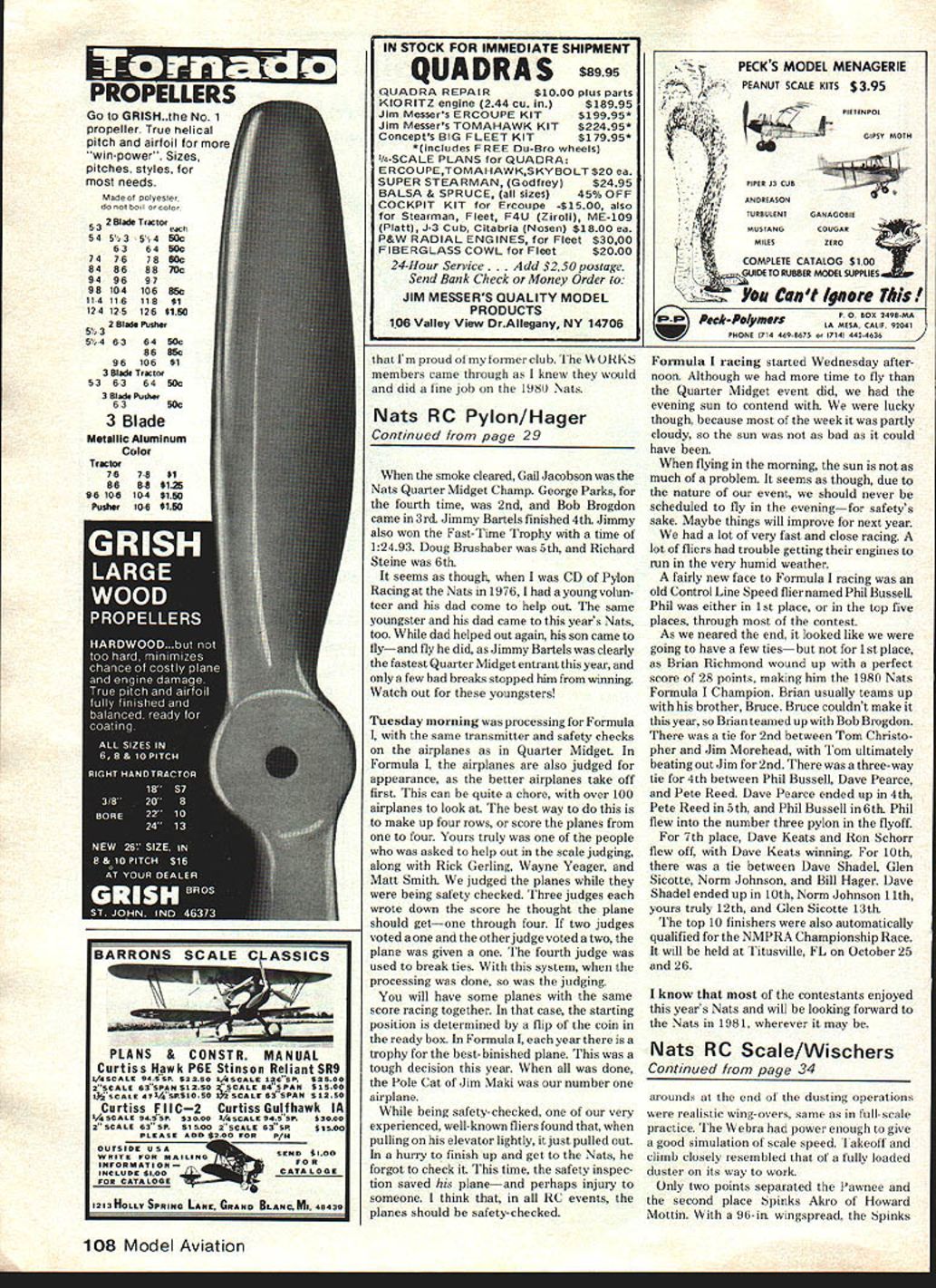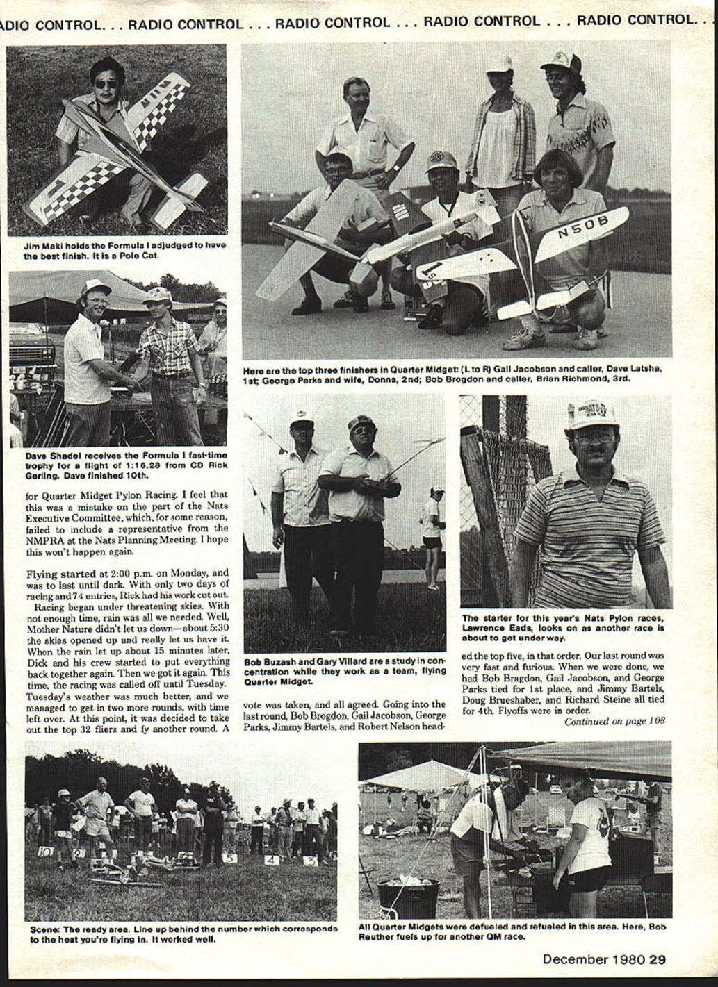 ADIO CONTROL. RADIO CONTROL. RADIO CONTROL. RADIO CONTROL . RADIO CONTROL RC Pylon Racing Bill Hager THIS years Pylon Racing Nats held Ohio former Clinton County Air Force Base air base located just outside small farm community Wilmington Wilmington didnt have lot offer way lodging short drive took Dayton Cincinnati Kings Island plenty motels fine restaurants contestants brought families along plenty Kings Island largest amusement parks world could also go Cin cinnati Reds baseball game go Air Force Museum Dayton just plenty things family strange feeling year go Ohio attend Nets Just last year moved family Dayton OH Garland TX Over past several years seems though best-attended Nats has has located eastern mid western part country think 1976 Nats held Dayton OH successful best attended So surprised large turnout year 71 entries Formula 74 entered Quarter Midget Contest Director year Rick Gerling Rick Quincy IL done lot work preparing job seemed pay off helped him did fantastic job got started Sunday afternoon processing transmitters Quarter Midgets contestant transmitter checked proper frequency Next planes checked proper wing area weight etc important check safety hinge connections servo installations receiver battery protection pushrod hook ups devises control horns general construction checked know lot competitors build new airplanes Nats haste last-minute work sometimes overlook something know year built new Quarter Midget Nats upon being checked found correctly hooked up elevator pushrod safety check saved both plane possible injury someone year two days allowed 28 Model Aviation arethetop 10 finIshers Formula Front rowLto R Brian Richmond Tom Christopher Jim Moorhead Dave Pearce Pete Reed Back rowLtoR Phil Bussell Dave Keats caller Dave Timcoe Ron Schorr Bob Brogdon Dave Shadel s ruinlUld muouw uaing Ins 00SF looking pick best Some jobTom Christopher ponders what going 2nd Formula Bob Brogdon Brian Richmond worked team both Formula Richard Oliver left Phil Bussell makes good team Formula Phil Quarter Midget Both did well Brian winning Formula land Bob went finish 6th old-time CL Speed flier takIng 3rd Quarter Midget kDIO CONTROL. RADIO CONTROL. RADIO CONTROL. RADIO CONTROL. RADIO CONTROL. Quarter Midget Pylon Racing feel mistake part Nats Executive Committee some reason failed include representative NMPRA Nats Planning Meeting hope wont happen again Flying started 200 pm Monday last until dark two days racing 74 entries Rick work cut out Racing began under threatening skies enough time rain needed Well Mother Nature didnt let us downabout 530 skies opened up really let us have rain let up ahout 15 minutes later Dick crew started put everything back together again got again time racing called off until Tuesday Tuesdays weather much better managed get two rounds time left over point decided take out top 32 fliers fy another round vote taken agreed Going last round Bob Brogdon Gail Jacobson George Parks Jimmy Bartels Robert Nelson headDecember 1980 29 Jim Maki holds Formula adjudged have best finish Pole Cat top three finishers Quarter Midget L R Gail Jacobson caller Dave Latsha 1st George Perks wife Donna 2nd Bob Brogdon caller Brian Richmond 3rd Dave Shadel receives Formula fast-time trophy flight 11628 CD Rick Gerling Dave finished 10th starter years Nats Pylon races Lawnnce Eads looks another race about get under way Bob euzasn ana usry vliiara ares sxuay con-edthe top five order last round centratlon work team flyingvery fast furious done Quarter Midgethad Bob Bragdon Gail Jacobson George Parks tied 1st place Jimmy Bartels Doug Brueshaber Richard Steine tied 4th Flyoffs order Continued page 108 cene resay area ine up osnina inc numoer wnicn corresponasAll Quarter Midgets defueled refueled area Bob heat youre flying worked wellReuther fuels up another QM race Im proud ol former club heW ORK members came through knew would did line job 196U Nat Nats RC Pylon/Hager Continued page 29 smoke cleared Gail Jacobson Nats Quarter Midget Champ George Parks fourth time 2nd Bob Brogdon came 3rd Jimmy Bartels finished 4th Jimmy also won Fast-Time Trophy time 12493 Doug Brushaber 5th Richard Steine 6th seems though CD Pylon Racing Nats 1976 young volun teer dad come help out same youngster dad came years Nats too dad helped out again son came flyand fly did Jimmy Bartels clearly fastest Quarter Midget entrant year few bad breaks stopped him winning Watch out youngsters Tuesday morning processing Formula same transmitter safety checks airplanes Quarter Midget Formula airplanes also judged appearance better airplanes take off first can quite chore over 100 airplanes look best way to make up four rows score planes four Yours truly people asked help out scale judging along Rick Gerling Wayne Yeager Matt Smith judged planes being safety checked Three judges wrote down score thought plane should getone through four two judges voted otherjudge voted two plane given fourth judge used break ties system processing done judging will have some planes same score racing together case starting position determined flip coin ready box Formula year trophy best-binished plane tough decision year done Pole Cat Jim Maki number airplane being safety-checked very experienced well-known fliers found pulling elevator lightly just pulled out hurry finish up get Nats forgot check Ihis time safety inspec tion saved planeand perhaps injury someone think RC events planes should safety-checked PECKS MODEL MENAGERIE PEANUT SCALE KITS $395 PIPER J3 CUB U ANOREASON UGANAGOBIE MUSTANGCOUGAR COMPLETE CATALOG $1 GUIDE TO RUBBER MODEl SUPPLIES Yea Cuat 1g. P 0 BOX 2498-MA LA MESA CALIF 92041 WPMONB 1714 409-0075 o 17141 442-4630 Formula racing started Wednesday after noon Although time fly Quarter Midget event did evening sun contend lucky though because week partly cloudy sun bad could have flying morning sun much problem seems though due nature event should never scheduled fly eveningfor safetys sake Maybe things will improve next