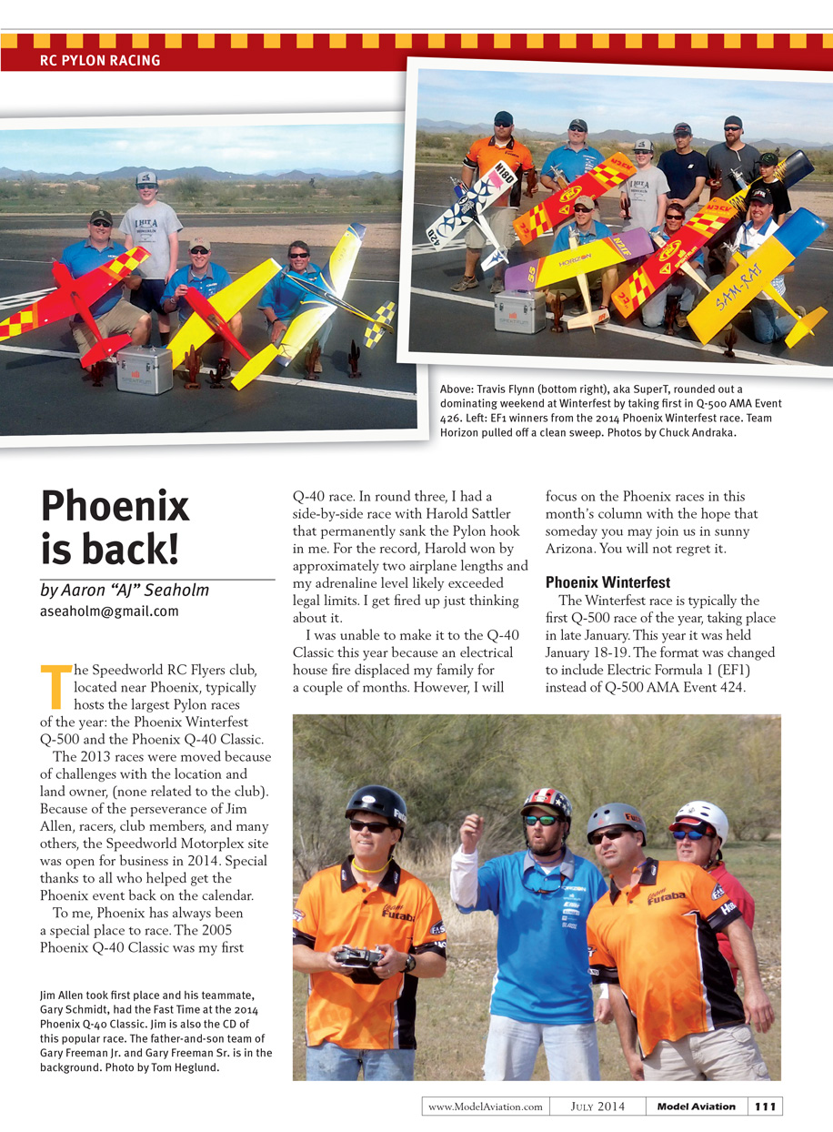 To me, Phoenix has always been a special place to race. The 2005 Phoenix Q-40 Classic was my first Q-40 race. In round three, I had a side-by-side race with Harold Sattler that permanently sank the Pylon hook in me. For the record, Harold won by approximately two airplane lengths and my adrenaline level likely exceeded legal limits. I get fired up just thinking about it.