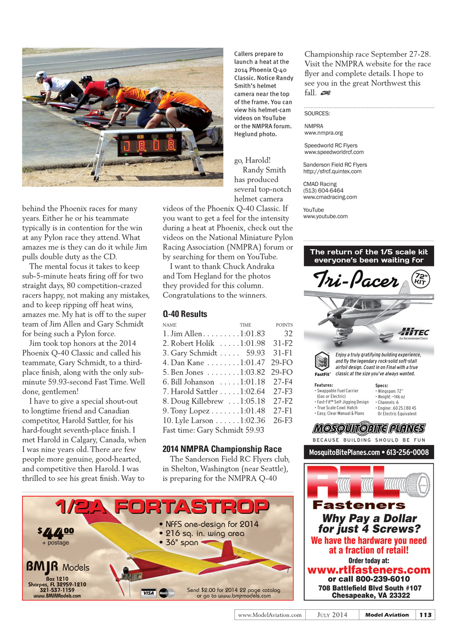 Randy Smith has produced several top-notch helmet camera videos of the Phoenix Q-40 Classic. If you want to get a feel for the intensity during a heat at Phoenix, check out the videos on the National Miniature Pylon Racing Association (NMPRA) forum or by searching for them on YouTube.