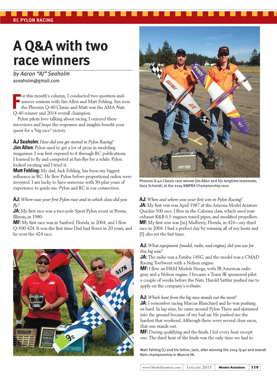 For this month’s column, I conducted two question-and-answer sessions with Jim Allen and Matt Fehling. Jim won the Phoenix Q-40 Classic and Matt was the AMA Nats Q-40 winner and 2014 overall champion.