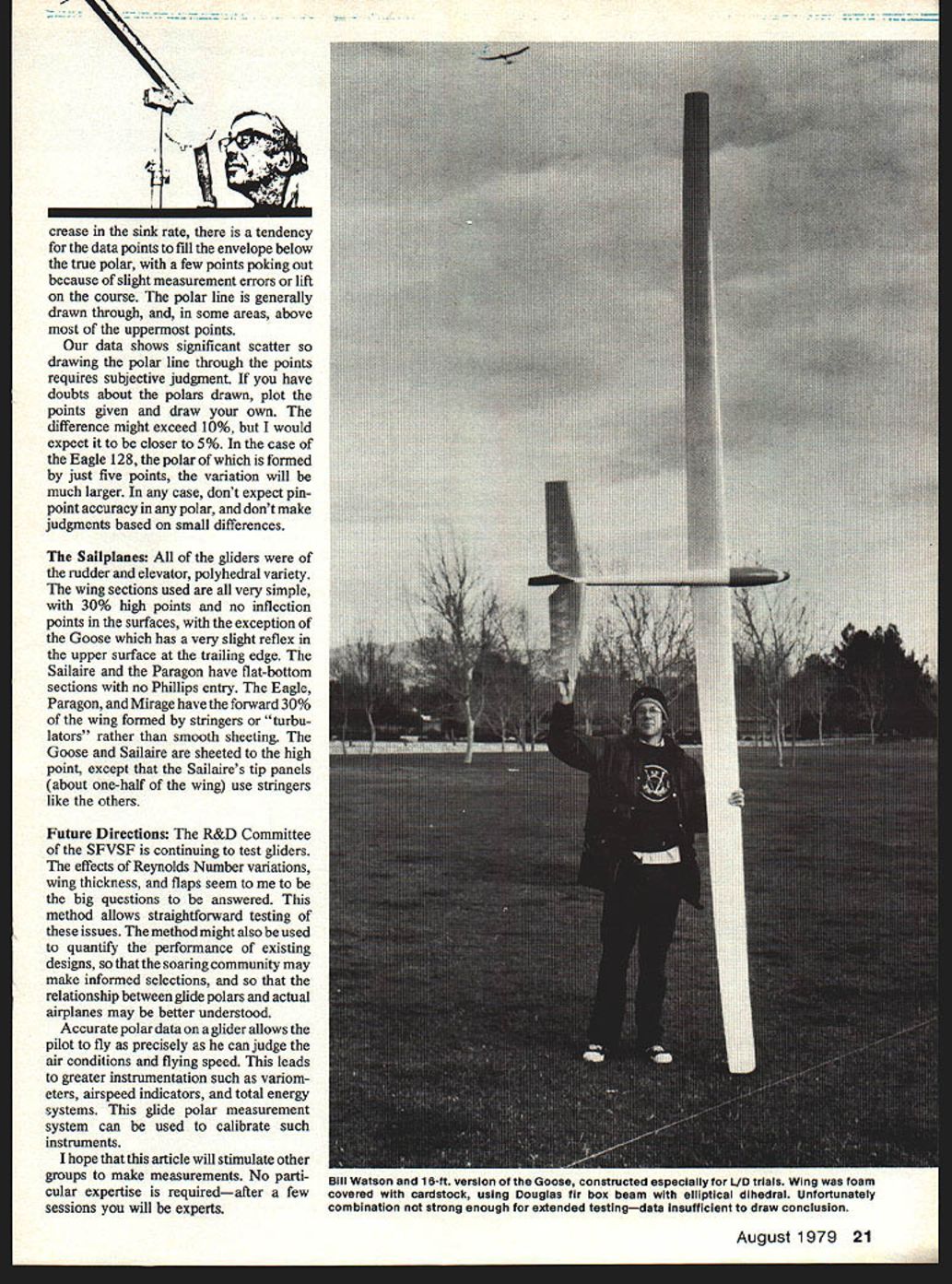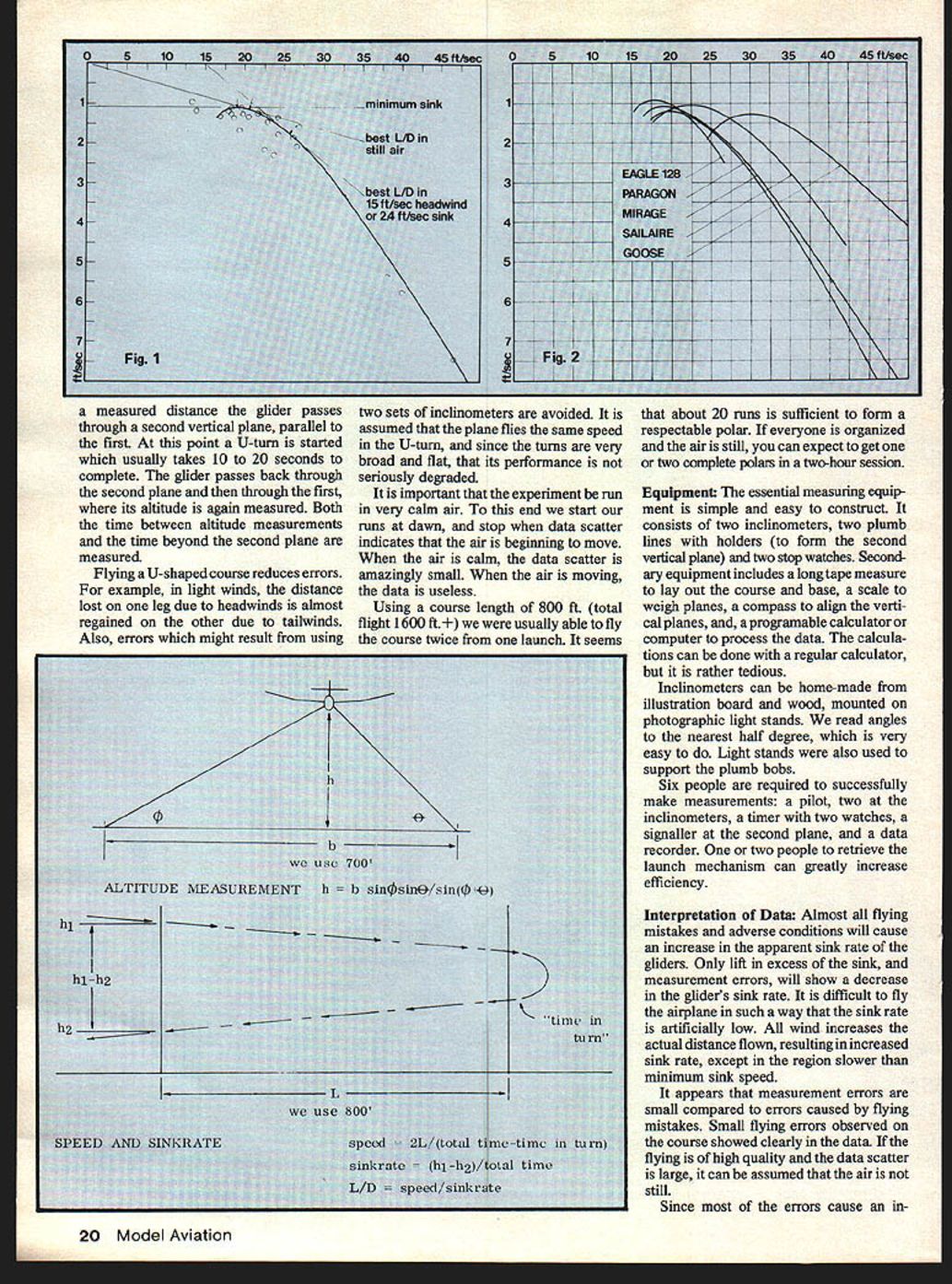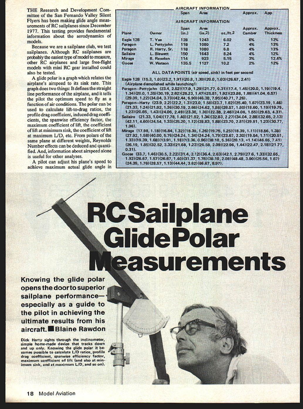 THE Research Development Com mittee San Fernando Valley Silent Flyers has making glide angle meas urements RC saliplanes since December 1977 testing provides fundamental information about aerodynamics models Because sailplane club test sailplanes Although RC sailplanes probably easiest type model measure other RC airplanes large free-flight models mini RC gear installed could also tested glide polar graph relates airplanes airspeed its sink rate graph does two things defines straight line performance airplane tells pilot optimum speed fly function air conditions polar can used calculate lift-to-drag ratios profile drag coefficient induced drag coeffi cients spanwise efficiency factor maximum coefficient lift coefficient lift minimum sink coefficient lift maximum LID etc polars same plane different weights Reynolds Number effects can deduced quanti fied information about airspeed alone useful other analyses pilot can adjust planes speed achieve maximum actual glide angle 0 T Ye L Pett R Har L Blew B Rav WWats ALL Di 153 1 demoliansa Deffyplm 2 0 13530 IU 12213404 Haty 124H sjuO65 14s1tz 21331041 196 Mirage 17981 2792 16844juu [ 331193916811 2619 18513252 157 31 @0e 337 146W 439 1 7628b esp Dick Harty sights through inclinc simple home-made device up Knowing comas possible calculate drag coefficient spanwise maximum cofficient lift imum sink maximum 18 Model Aviation Laying out tne course 100-it tape Also ShOwn tfle two Inclinometers mounted photo light stands different air conditions knows planes polar method measure ment provides complete ac curate glide polar relatively short time devised Bill Watson author during very short brainstonning session method would useless continuing interest participation members R&D committee Measurement Procedure polar idealized graph formed data points relating sink rate airspeed data point result flight constant speed through measured course time course altitude lost course measured altitude measured glider passes through imaginary vertical plane Two inclinometers measured distance apart record angles glider forms horizon latitude calculated means ofatrigonometric formula end course altitude measured again difference between two altitudes course altitude lost Airspeed length course divided time course Sinkrate altitude lost divided time between altitude measurements fly straight line rather U-shaped course glider first passes through vertical measurement plane ume urine iiau group Fernando Valley Flyers four tested sailplanes L R Bob Sutton Bill Watson Goose Ted Yee close facsimile Eagle 128 Rich Harty Dick Harty Paragon Michael Bame Chris Adams authors Mirage Lorin Blewett bob-tail Sailaire picture August 1979 19 05101520 25 30 35 40 4Sftmc051015 20 25 3o 40 ASftlsec measured distance glider passes through second vertical plane parallel first point U-turn started usually takes 10 20 seconds complete glider passes back through second plane through first its altitude again measured Both time between altitude measurements time beyond second plane measured Flying U-shaped course reduces errors example light winds distance lost leg due headwinds almost regained other due tailwinds Also errors might result using two sets inclinometers avoided assumed plane flies same speed U-turn since turns very broad flat its performance seriously degraded important experiment run very calm air end start runs dawn stop data scatter indicates air beginning move air calm data scatter amazingly small air moving data useless Using course length 800 ft total flight 1600 fL usually able fly course twice launch seems about 20 runs sufficient form respectable polar everyone organized air still can expect get two complete polars two-hour session Equipment essential measuring equip ment simple easy construct consists two inclinometers two plumb lines holders form second vertical plane two stop watches Second ary equipment includes long tape measure lay out course base scale weigh planes compass align verti cal planes programable calculator computer process data calcula tions can done regular calculator rather tedious Inclinometers can home-made illustration board wood mounted photographic light stands read angles nearest half degree very easy Light stands also used support plumb bobs Six people required successfully make measurements pilot two inclinometers timer two watches signaller second plane data recorder two people retrieve launch mechanism can greatly increase efficiency Interpretation Data Almost flying mistakes adverse conditions will cause increase apparent sink rate gliders Only lift excess sink measurement errors will show decrease gliders sink rate difficult fly airplane such way sink rate artificially low wind increases actual distance flown resulting increased sink rate except region slower minimum sink speed appears measurement errors small compared errors caused flying mistakes Small flying errors observed course showed clearly data flying high quality data scatter large can assumed air still Since errors cause in20 Model Aviation 1 __________________ minimum sink 2 3 24 ftiec sink 1-- - - 2 aEAGLE128 4MIRAGE SAILAIRE _4G0E 6i--- - * jFIg2v-i ------- 1~ usc 700 ALTITUDE MEASUREMENT h n0sin9/sin(74 hi K time h2 -h2 turn L use 800 speed otal time-time turn SPEED AND SINKRATE slnkrate h-h2/total time L/D speed/sinkrate "N crease sink rate tendency data points fill envelope below true polar few points poking out because slight measurement errors lift course polar line generally drawn through some areas above uppermost points data shows significant scatter drawing polar line through points requires subjective judgment have doubts about polars drawn plot points given draw own difference might exceed 10% would expect closer 5% case Eagle 128 polar formed just five points variation will much larger case dont expect pin point accuracy polar dont make judgments based small differences SaiIpIane gliders rudder elevator polyhedral variety wing sections used very simple 30% high
