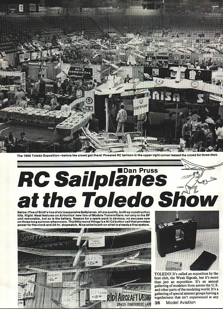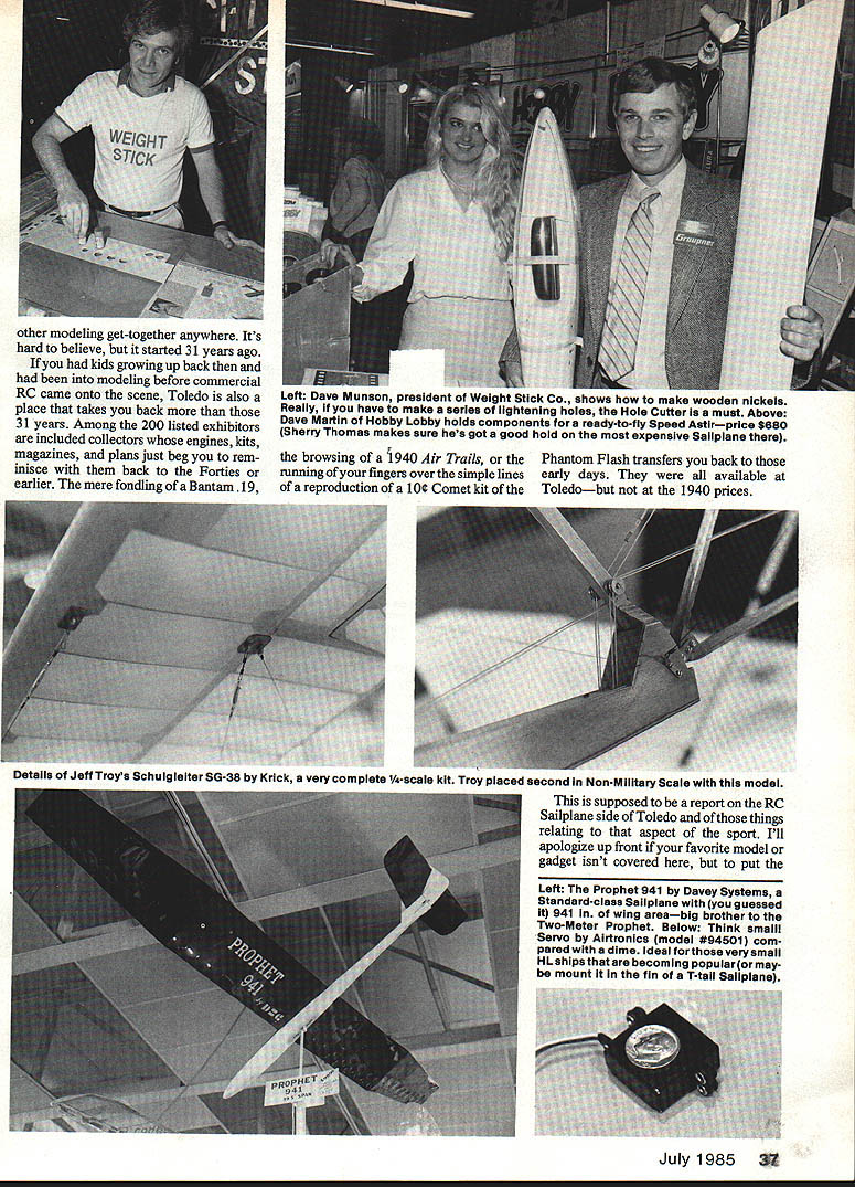 The 1985 Toledo ExposItIonbefore crowd got Powered RC balloon upper right corner teased crowd three days EDan Pru RC Sailplanes r Toledo Show Below Five Bridis line six inexpensive Salipianes quality buiitup construction kits Right Neat features Airtronics new line Module Transmitters RF unit removable battery Reason spare pack obvious no excuses now long summerafternoons little round thingy isa NiCd button cell provides power forthe clock 24hr stopwatch Nice extra touch what aireadys fine system TOLEDO Its called exposition host club Weak Signals its just exposition Its annual gathering modelers across US other parts modeling world Its gathering special interest groups having togetherness isnt experienced 36 Model Aviation other modeling get-together anywhere Its hard believe started 31 years ago kids growing up back modeling before commercial RC came onto scene Toledo also place takes back 31 years Among 200 listed exhibitors included collectors engines kits magazines plans just beg rem inisce back Forties earlier mere fondling Bantam 19 Left Dave Munson president Weight Stick Co shows now make Wooden nickels Reaiiy have make series lightening hoies Hoie Cutter must Above Dave Martin Hobby Lobby hoids components ready-to-fiy Speed Astirprice $680 Sherry Thomas makes sure hes got good hoid moat expensive Salipiane browsing l940 Air Trails Phantom Flash transfers back running fingers over simple lines early days available reproduction 1Oi Comet kit Toledobut 1940 prices July 1985 . gieiter SG-38 Krick very complete -scaie kit Troy piaced second Non-Mliitary Scaie modei supposed report RC Sailplane side Toledo things relating aspect sport Ill apologize up front favorite model gadget isnt covered put Left Prophet 941 Davey Systems Standard-ciass Salipiane guessed 941 wing areabig brother Two-Meter Prophet Beiow Think smaiil Servo Airtronics modei #94501 com pared dime idesi forthose very smali HL ships becoming popuiaror may mount fin T-tail Sailplane show perspective some statis tics show runs three days wasnt cubbyhole left late exhibitor missed sign-up deadline could open valise ran Al Doig writes RC Soaring col umn RC Modeler Sunday morning last 10000 sample maga zines handed out oneat-a-time shoulder-to-shoulder crowds three days its hard imagine guys gals able see exhibits talk com pany representatives Nonetheless two things certain its worthwhile event attend its fun counted no fewer 14 manufactur ers Sailplanes ranged most-affordable hand-launch variety Scale model Speed Astir price tag nearly $700 radio line latest Ace Airtronics Kraft Futaba JR MRC shown can have choice FM Pulse Code Modulation PCM units meet 1991 standards Thats operation 10 kHz spacing youre mixing functions especially F3B type machines new rigs Airtronics Futaba will mix just about everything bread dough highlights saw made rounds show SR Batteries noted specialized battery packs showed bolt-on-the-back 1200 mAh pack attaches transmitter no special tooling fuss ing pack also comes jumper connection runs transmitters battery lead Its really painless way get capacity long-duration ffights wont revolutionize model building ever have cut lightening hole sheet balsa Dave Munson brought Weight Stick back has made life easier Youll have no frayed chewed-out holes mismatch Hole Cutters come two diameters 34 1 Nice gadgets Glitch Buster item featured February March issues magazine Its available Jomar speak radio have nothing praise idea package quote instruction sheet Glitch Buster effective device available re duce radio interference caused long leads heavy-duty high-power servos combines three different types proven techniques small package 2 x 1 optical isolation signal lines separate battery power servo signal buffer similar Ace EMS glitch stops Bottom line youre running long servo leads just might want consider Glitch Buster airborne installation Al-Tee Spoilers Americanmade spoilers market double acting top bottom wing, separate unit can snap $t Model Aviation ped together longer spoiler Its great Highlights some other models manu idea available through Ace RC facturers include Throw Tantrum No no its ploy Alrtronlcs Adante Cumic distract timekeeper former multi-task Sailplane foam catchiest advertising lines show wings sheeting included fiberglass fuseTantrum Sailplanehand-launch va- lage complete hardware package riety Clever though cleverness doesnt Cumic conventional construc stop polyhedral wing tips fold tion also has fiberglass fuselage its under main panels held place designed Thermal Soaring servo-actuated pins top th BridL said cant afford RC toss/launch tweak up-elevator unfolds Soaring check Bridis line kits wings 21 normal 42-in six ranging hand-launch Tercel span Its kind like stunt Ken Olsen 100-in Windsurfer standard pulled now its Two-Meter bird type built-up construction Prices go now its 100-in span model Gordon $1995 $4995 Pearson LSF Tournament afew years Davey Systems Prophet Prophet back Tantrum available Off 941 Two-Meter Standard-class Sailthe Ground Models 606C W Anthony planes top-quality kits Dr Urbana IL 61801 Continued page 129 Lazy Bird Midwest Products Co all-Toam WITfl narawoog upur crutch Nice iines great filer wing piece bolt spanning two meters Very popular kit special Interest groups highlight League Silent Plight always Secretary Ken Bates Treasurer Cal Sobczynskl present mounted Level V vouchers Cal Posthuma John Hoover John Cal 38th 38th attain top level 39 have attained level John Cal congratulated Spoilers byAl-Tec Ace ThesearetwoseParate unitathatwere snapped togetherto form long spoilernice feature smooth action Note double actuating i LIONS BONN Ultimate Fun Fly Competition Model Ideal Sunday Flyer Excellent OS 65 PS ptIonally slow land ing speed le enough 1st AIleron model easily framed less U hrs. balsa raft plywood construction ed full sise plans EngIne45 61 Wingspan62 Length OA54 WIng Area850 sq Weight Sf 6 Lbs Wing LoadIng15 17 ox Designed Uob Lame kit market sold