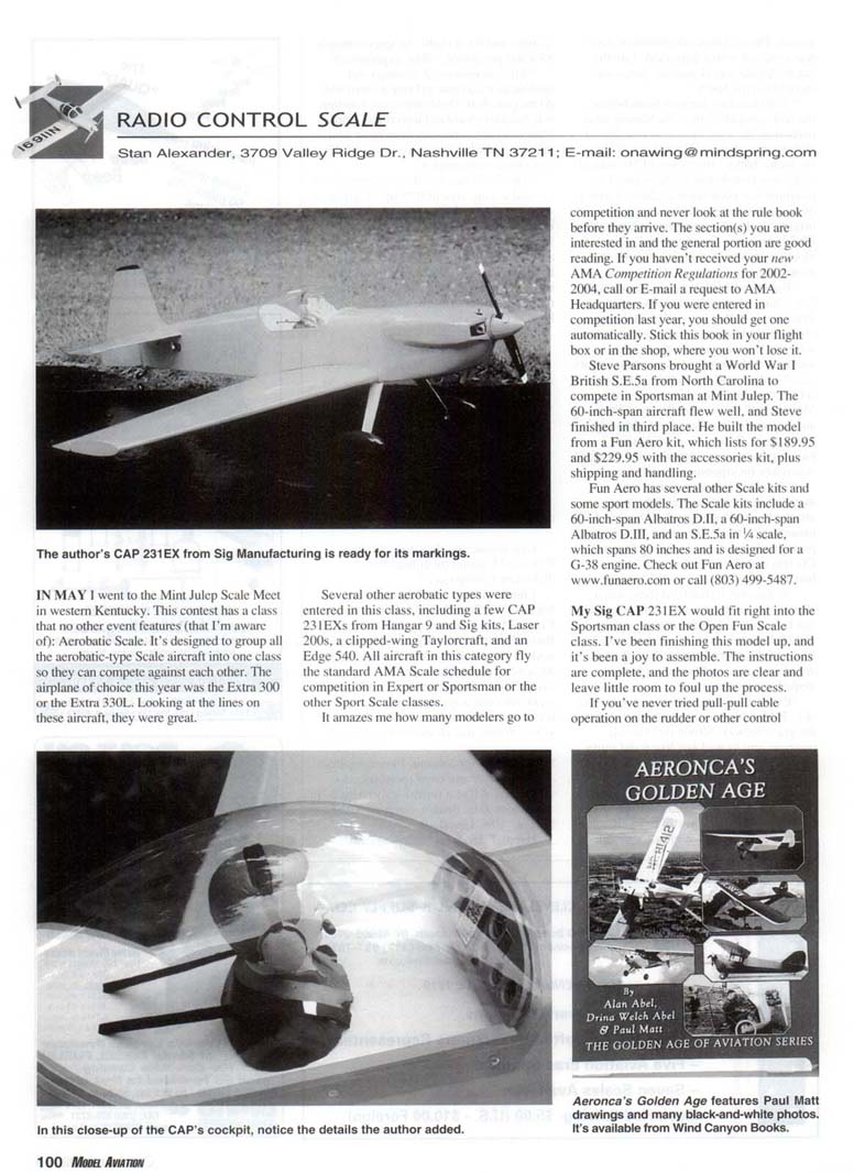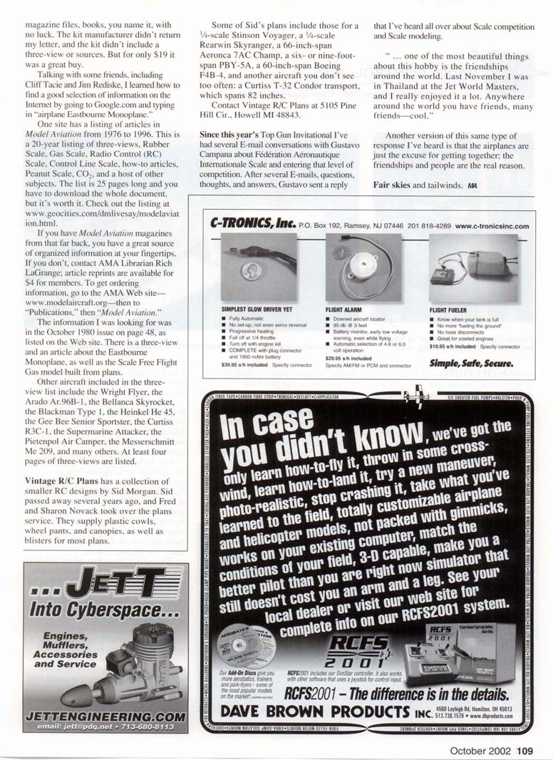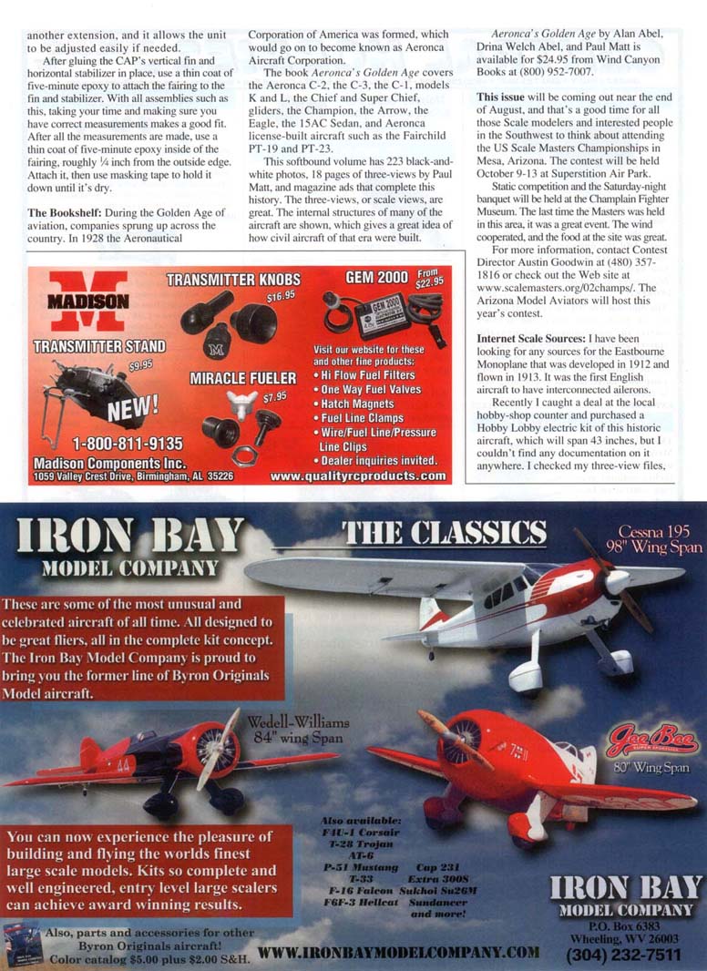 Several other aerobatic types were entered in this class, including a few CAP 231 EXs from Hangar 9 and Sig kits, Laser 200s, a clipped-wing Taylorcraft, and an Edge 540. All aircraft in this category fly the standard AMA Scale schedule for competition in Expert or Sportsman or the other Sport Scale classes. It amazes me how many modelers go to competition and never look at the rule book before they arrive. The section(s) you are interested in and the general portion are good reading. If you haven't received your new AMA Competition Regulations for 2002-2004. call or E-mail a request to AMA Headquarters. If you were entered in competition last year, you should get one automatically. Stick this book in your flight box or in the shop, where you won't lose it. Steve Parsons brought a World War I British S.E.5a from North Carolina to compete in Sportsman at Mint Julep. The 60-inch-span aircraft flew well, and Steve finished in third place. He built the model from a Fun Aero kit. which lists for $189.95 and $229.95 with the accessories kit, plus shipping and handling. Fun Aero has several other Scale kits and some sport models. The Scale kits include a 60-inch-span Albatros D.II, a 60-inch-span Albatros D.III. and an S.E.Sa in (4 scale, which spans 80 inches and is designed for a G-38 engine. Check out Fun Aero at www.funaero.com or call (803) 499-5487. My Sig CAP 231 EX would fit right into the Sportsman class or the Open Fun Scale class. I've been finishing this model up, and it's been a joy to assemble. The instructions are complete, and the photos are clear and leave little room to foul up the process. If you've never tried pull-pull cable operation on the rudder or other control functions, it's easy. It might look scary at first, but it's a simple process. I installed the canopy and cockpit with 30-minute epoxy, using masking tape to seal the edges. I did add the plastic 4-40 screws to the canopy per the instructions. Cleaning the canopy is just common sense because of handling, body oils, and mold release agents from the manufacturing process that stick to the plastic. You don't want the canopy to blow off in flight. Al Kretz brought this Do 23G to the Mint Julep Scale Meet in Kentucky in May. A surprise with this kit is that it comes with good hardware—not the usual junk that ends up in the box or in the trash and never sees the light of day. From the best I can tell and from the booklet, the CAP comes with Du-Bro hardware. Control horns, different brackets, throttle cable, engine mount, fuel tank, spinner, wheel pants, tires, tail gear, and screws are supplied to finish the kit. As recommended, I added the heavy-duty Du-Bro output servo arms. One item that doesn't come with the kit is the elevator splitter for the two elevator servos. Get a Y harness six-inch reverser from the local hobby shop or from Horizon Hobby (part EXRA320) to obtain a mirror image on the two elevator surfaces. Using 16-inch servo extensions on the elevator servos allows you to put the splitter or reverser in the area where the unit can be plugged into the receiver directly without using another extension, and it allows the unit to be adjusted easily if needed. After gluing the CAP's vertical fin and horizontal stabilizer in place, use a thin coat of five-minute epoxy to attach the fairing to the fin and stabilizer. With all assemblies such as this, taking your time and making sure you have correct measurements makes a good fit. After all the measurements are made, use a thin coat of five-minute epoxy inside of the fairing, roughly '/i inch from the outside edge. Attach it, then use masking tape to hold it down until it's dry. The Bookshelf: During the Golden Age of aviation, companies sprung up across the country. In 1928 the Aeronautical Corporation of America was formed, which would go on to become known as Aeronca Aircraft Corporation. The book Aeronca's Golden Age covers the Aeronca C-2, the C-3, the C-l, models K and L, the Chief and Super Chief, gliders, the Champion, the Arrow, the Eagle, the 15AC Sedan, and Aeronca license-built aircraft such as the Fairchild PT-19andPT-23. This softbound volume has 223 black-and-white photos, 18 pages of three-views by Paul Matt, and magazine ads that complete this history. The three-views, or scale views, are great. The internal structures of many of the aircraft are shown, which gives a great idea of how civil aircraft of that era were built. 1E800-811-9135 Madison Components Incl 1059 Valley Crest Drive, BirminghamrAL 35226 GEM 2000 r website for these er fine products: • Hi Flow Fuel Filters One Way Fuel Valves Hatch Magnets - Fuel Line Clamps * Wire/Fuel Line/Pressure : Line Clips 1 Dealer inquiries invited. www.qualityrcproducts.com Aeronca's Golden Age by Alan Abel, Drina Welch Abel, and Paul Matt is available for $24.95 from Wind Canyon Books at (800) 952-7007. This issue will be coming out near the end of August, and that's a good time for all those Scale modelers and interested people in the Southwest to think about attending the US Scale Masters Championships in Mesa, Arizona. The contest will be held October 9-13 at Superstition Air Park. Static competition and the Saturday-night banquet will be held at the Champlain Fighter Museum. The last time the Masters was held in this area, it was a great event. The wind cooperated, and the food at the site was great. For more information, contact Contest Director Austin Goodwin at (480) 357-1816 or check out the Web site at www.scalemasters.org/02champs/. The Arizona Model Aviators will host this year's contest. Internet Scale Sources: I have been looking for any sources for the Eastbourne Monoplane that was developed in 1912 and flown in 1913. It was the first English aircraft to have interconnected ailerons. Recently I caught a deal at the local hobby-shop counter and purchased a Hobby Lobby electric kit of this historic aircraft, which will span 43 inches, but I couldn't find any documentation on it anywhere.