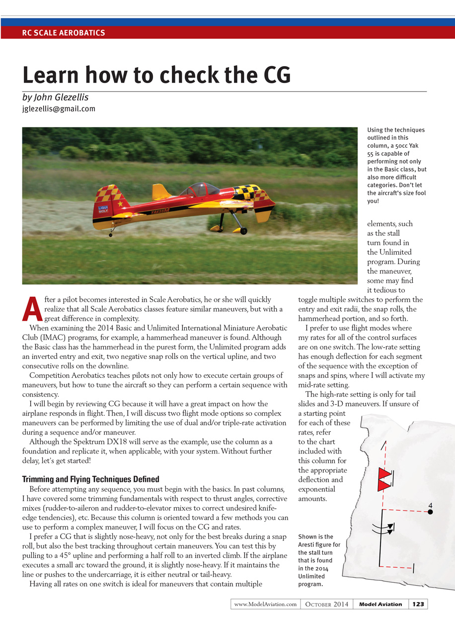 I will begin by reviewing CG because it will have a great impact on how the airplane responds in flight. Then, I will discuss two flight mode options so complex maneuvers can be performed by limiting the use of dual and/or triple-rate activation during a sequence and/or maneuver.
