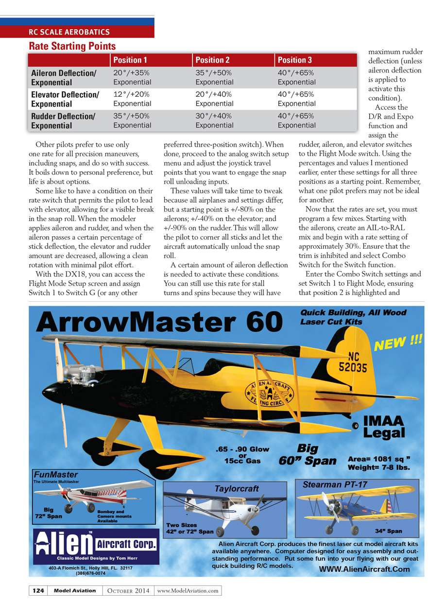 I prefer to use flight modes where all of my rates for all control surfaces are on one switch. The low-rate setting has enough deflection for each segment of the sequence with the exception of snaps and spins, where I will activate my mid-rate setting.