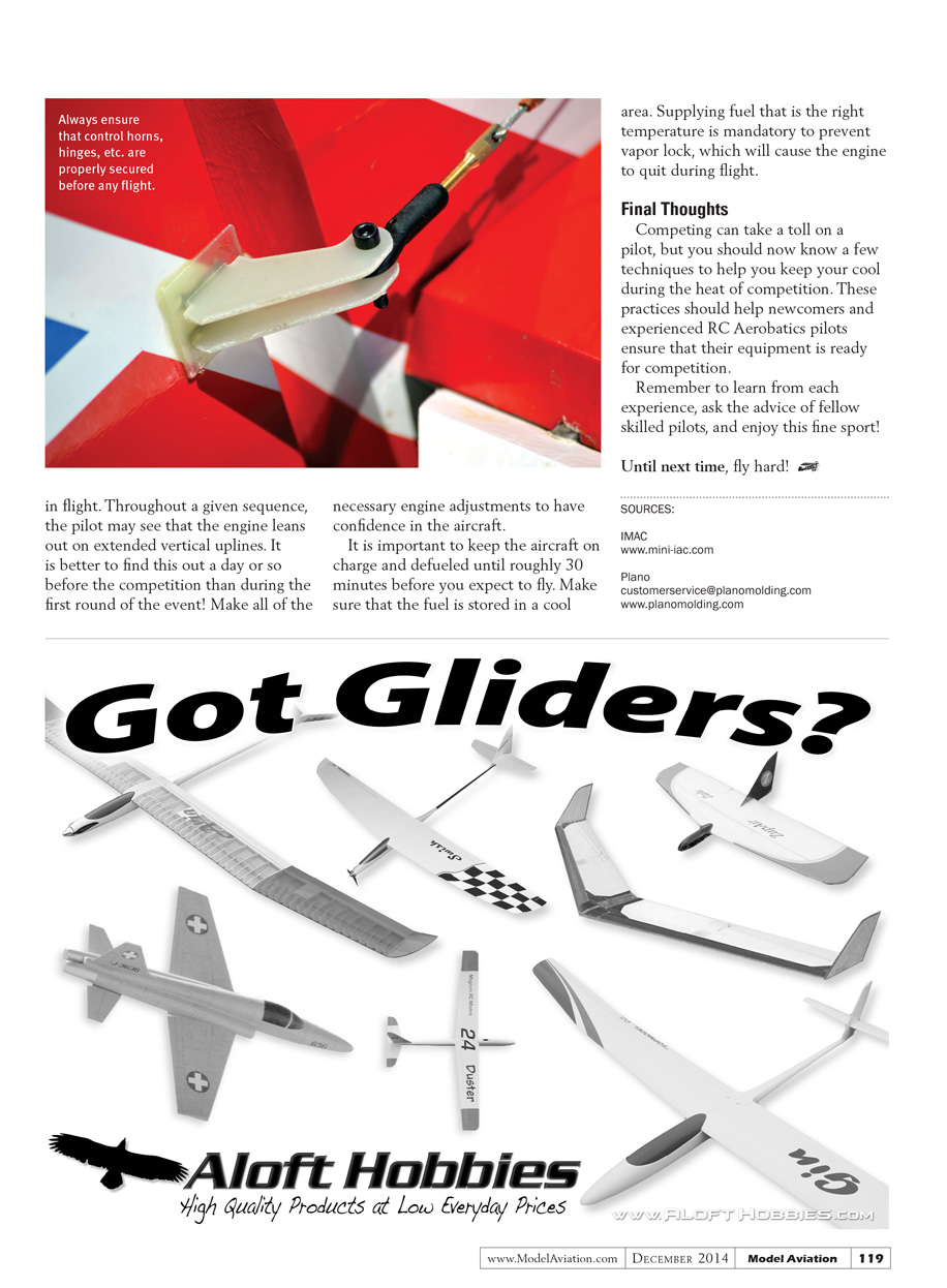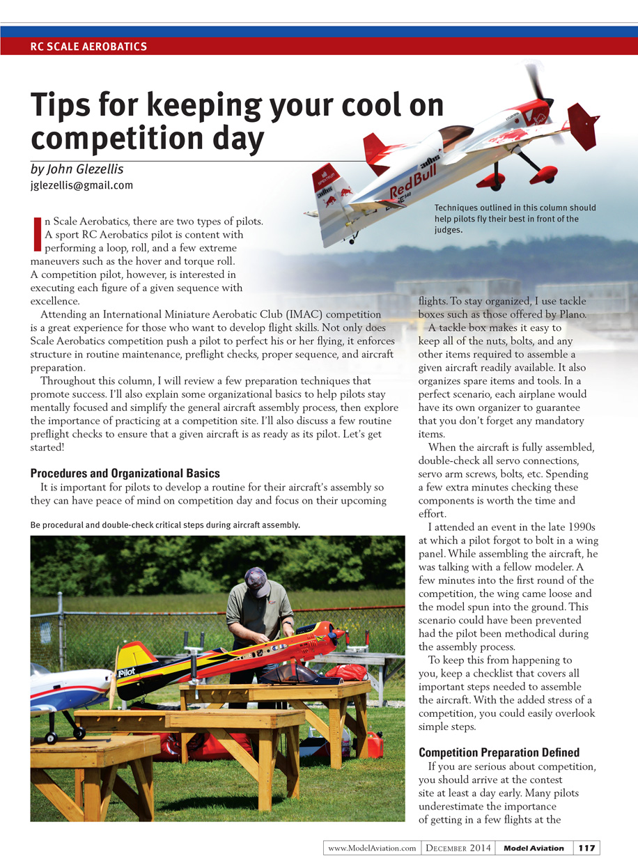 Competing can take a toll on a pilot, but you should now know a few techniques to help you keep your cool during the heat of competition. These practices should help newcomers and experienced Aerobatics pilots ensure that their equipment is ready for competition.