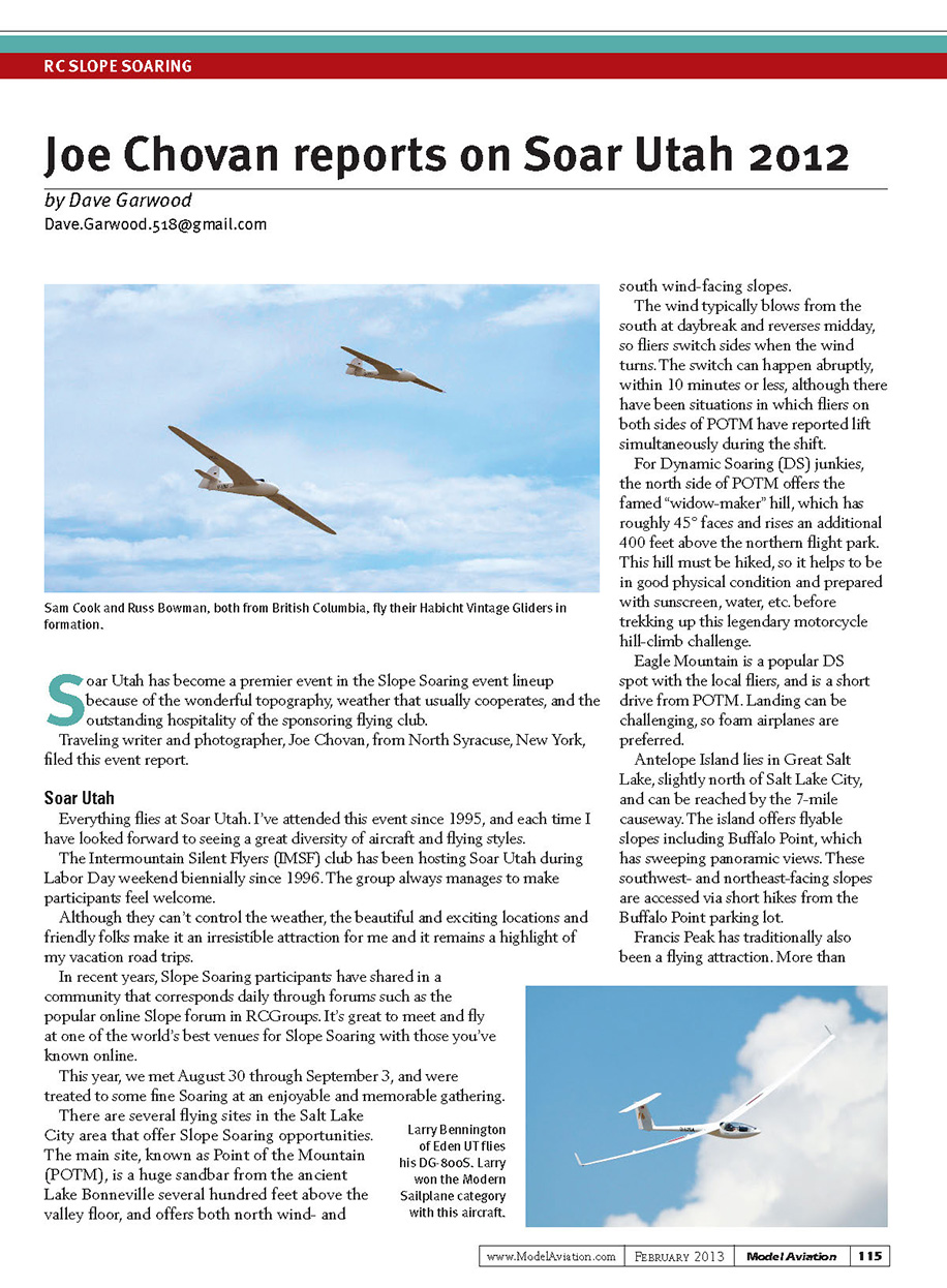Larry Bennington of Eden UT flies his DG-800S. Larry won the Modern Sailplane category with this aircraft.Sam Cook and Russ Bowman, both from British Columbia, fly their Habicht Vintage Gliders in formation.Joe Chovan reports on Soar Utah 2012by Dave GarwoodDave.Garwood.518@gmail.comSoar Utah has become a premier event in the Slope Soaring event lineup because of the wonderful topography, weather that usually cooperates, and the outstanding hospitality of the sponsoring flying club. Traveling writer and photographer, Joe Chovan, from North Syracuse, New York, filed this event report. Soar Utah Everything flies at Soar Utah. I’ve attended this event since 1995, and each time I have looked forward to seeing a great diversity of aircraft and flying styles. The Intermountain Silent Flyers (IMSF) club has been hosting Soar Utah during Labor Day weekend biennially since 1996. The group always manages to make participants feel welcome. Although they can’t control the weather, the beautiful and exciting locations and friendly folks make it an irresistible attraction for me and it remains a highlight of my vacation road trips. In recent years, Slope Soaring participants have shared in a community that corresponds daily through forums such as the popular online Slope forum in RCGroups. It’s great to meet and fly at one of the world’s best venues for Slope Soaring with those you’ve known online. This year, we met August 30 through September 3, and were treated to some fine Soaring at an enjoyable and memorable gathering. There are several flying sites in the Salt Lake City area that offer Slope Soaring opportunities. The main site, known as Point of the Mountain (POTM), is a huge sandbar from the ancient Lake Bonneville several hundred feet above the valley floor, and offers both north wind- and south wind-facing slopes. The wind typically blows from the south at daybreak and reverses midday, so fliers switch sides when the wind turns. The switch can happen abruptly, within 10 minutes or less, although there have been situations in which fliers on both sides of POTM have reported lift simultaneously during the shift. For Dynamic Soaring (DS) junkies, the north side of POTM offers the famed “widow-maker” hill, which has roughly 45° faces and rises an additional 400 feet above the northern flight park. This hill must be hiked, so it helps to be in good physical condition and prepared with sunscreen, water, etc. before trekking up this legendary motorcycle hill-climb challenge. Eagle Mountain is a popular DS spot with the local fliers, and is a short drive from POTM. Landing can be challenging, so foam airplanes are preferred. Antelope Island lies in Great Salt Lake, slightly north of Salt Lake City, and can be reached by the 7-mile causeway. The island offers flyable slopes including Buffalo Point, which has sweeping panoramic views. These southwest- and northeast-facing slopes are accessed via short hikes from the Buffalo Point parking lot. Francis Peak has traditionally also been a flying attraction. More than 115Model Aviation February 2013www.ModelAviation.comRC SLOPE SOARING115