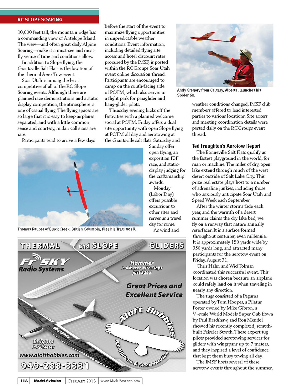 Andy Gregory from Calgary, Alberta, launches his Spider 60.Thomas Rauber of Black Creek, British Columbia, flies his Tragi 801 X.10,000 feet tall, the mountain ridge has a commanding view of Antelope Island. The view—and often great daily Alpine Soaring—make it a must-see and must-fly venue if time and conditions allow. In addition to Slope flying, the Grantsville Salt Flats is the location of the thermal Aero-Tow event. Soar Utah is among the least competitive of all of the RC Slope Soaring events. Although there are planned race demonstrations and a static display competition, the atmosphere is one of casual flying. The flying spaces are so large that it is easy to keep airplanes separated, and with a little common sense and courtesy, midair collisions are rare. Participants tend to arrive a few days before the start of the event to maximize flying opportunities in unpredictable weather conditions. Event information, including detailed flying site access and hotel discount rates procured by the IMSF, is posted within the RCGroups Soar Utah event online discussion thread. Participants are encouraged to camp on the south-facing side of POTM, which also serves as a flight park for paraglider and hang-glider pilots. Thursday evening kicks off the festivities with a planned welcome social at POTM. Friday offers a dual site opportunity with open Slope flying at POTM all day and aerotowing at the Grantsville salt flats. Saturday and Sunday offer open flying, an exposition F3F race, and static-display judging for the craftsmanship awards. Monday (Labor Day) offers possible excursions to other sites and serves as a travel day for some. As wind and weather conditions changed, IMSF club members offered to lead interested parties to various locations. Site access and meeting coordination details were posted daily on the RCGroups event thread. Ted Fraughton’s Aerotow Report The Bonneville Salt Flats qualify as the fastest playground in the world, for man or machine. The miles of dry, open lake extend through much of the west desert outside of Salt Lake City. This prize real estate plays host to a number of adrenaline junkies, including those who anxiously anticipate Soar Utah and Speed Week each September. After the winter storms fade each year, and the warmth of a desert summer claims the dry lake bed, we fly on a runway that nature annually resurfaces. It is a surface formed throughout centuries, even millennia. It is approximately 150 yards wide by 350 yards long, and attracted many participants for the aerotow event on Friday, August 31. Chris Hahn and Wid Tolman coordinated this successful event. This location was chosen because an airplane could safely land on it when traveling in nearly any direction. The tugs consisted of a Pegasus operated by Tom Hoopes, a Pilatus Porter owned by Mike Gibson, a 1/3-scale World Models Super Cub flown by Paul Bradshaw, and Ron Mendel showed his recently completed, scratch-built Feiseler Storch. These expert tug pilots provided aerotowing services for gliders with wingspans up to 7 meters, and they inspired a level of confidence that kept them busy towing all day. The IMSF hosts several of these aerotow events throughout the summer, 116Model Aviation February 2013www.ModelAviation.comRC SLOPE SOARING115