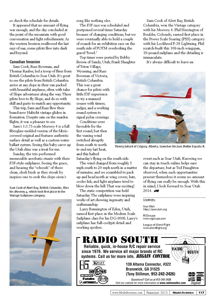 Sam Cook of Alert Bay, British Columbia, flies his Moswey 4, which took first place in the Vintage Sailplane category.Thierry Juliard of Calgary, Alberta, launches his Jaro Muller Espada-R.so check the schedule for details. It appeared that no amount of flying was enough, and the day concluded at the point of the mountain with good conversation and light refreshments. As the western horizon swallowed the last rays of sun, some pilots flew into dusk and beyond. Canadian Invasion Sam Cook, Russ Bowman, and Thomas Rauber, led a troop of fliers from British Columbia to Soar Utah. It’s great to see the pilots from British Columbia arrive at any slope in their van packed with beautiful airplanes, often with tales of Slope adventures along the way. These pilots love to fly Slope, and do so with skill and gusto to match any opportunity. This trip, Sam and Russ flew their brand-new Habicht vintage gliders in formation. Despite rain on the maiden flights, it was a pleasure to see. Sam’s 1:3.75-scale Moswey 4 is a full fiberglass-molded version of the fabric-covered original and features authentic surface detail as well as a custom water-ballast system. Seeing this baby carve up the Utah skies was a treat for me. Sunday, the trio performed memorable aerobatic stunts with their F3F-style sailplanes. Seeing the grace, and hearing the “whoosh” of these clean, sleek birds as they streak by inspires one to seek the slope siren’s song like nothing else. The F3F race was scheduled and postponed several times Saturday because of changing conditions, but we were eventually able to hold a couple of rounds for an exhibition race on the south side of POTM overlooking the gravel “bowl.” Top times were posted by Bobby Brown of Sandy, Utah; Frank Slaughter of Teton Village, Wyoming; and Russ Bowman of Victoria, British Columbia. This was a great chance for pilots with little F3F experience to try a manned course with timers, judges, and a working sound system to signal pylon crossings. Conditions were favorable for the first round, but then the waning wind switched abruptly from south to north to end my last heat, and this halted Saturday’s flying on the south side. The wind changed from roughly 5 mph south to 20 mph north in a matter of minutes, and we scrambled to pack up and head north as wing covers, hats, cooler lids, and light airplanes tried to blow down the hill. That was exciting! The static competition was held Saturday. The sailplanes were inspiring works of art showing ingenuity and craftsmanship. Larry Bennington of Eden, Utah, earned first place in the Modern Scale Sailplane class for his DG-800S. Larry’s sailplane has full-cockpit detail and working spoilers. Sam Cook of Alert Bay, British Columbia, won the Vintage category with his Moswey 4. Phil Herrington of Boulder, Colorado, earned first place in the Power Scale Soaring (PSS) category with his Lockheed P-38 Lightning. Phil scratch-built this 108-inch wingspan, 19-pound sailplane and the detailing is immaculate. It’s always difficult to leave an event such as Soar Utah. Knowing we can stay in touch online helps ease the departure, but as Ted Fraughton observed, when such opportunities present themselves it seems no amount of flying can really be enough. With this in mind, I look forward to Soar Utah 2014. SOURCES: Soar Utahhttp://soarutah.org RCGroupswww.rcgroups.com League of Silent Flightwww.silentflight.org117Model Aviation February 2013www.ModelAviation.com115