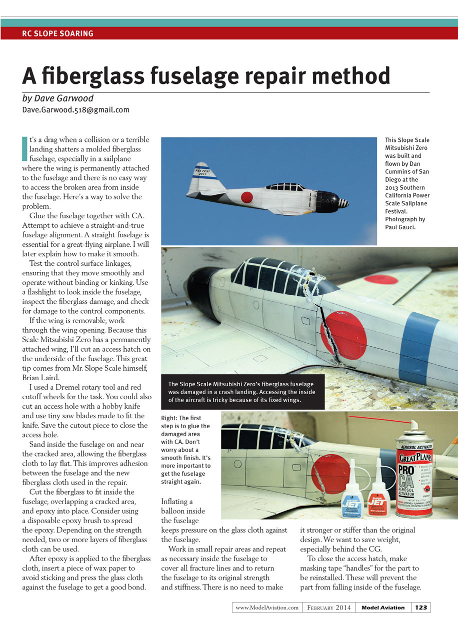 It’s a drag when a collision or a terrible landing shatters a molded fiberglass fuselage, especially in a sailplane where the wing is permanently attached to the fuselage and there is no easy way to access the broken area from inside the fuselage. Here’s a way to solve the problem.