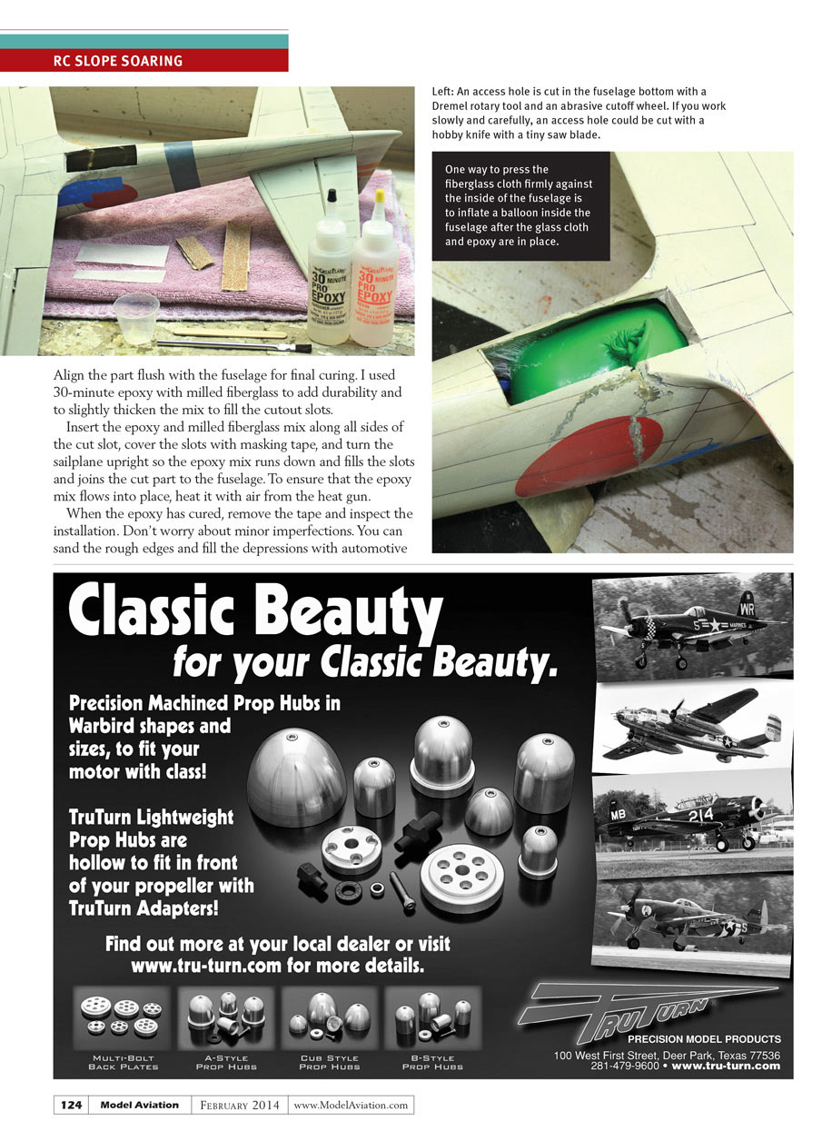 Insert the epoxy and milled fiberglass mix along all sides of the cut slot, cover the slots with masking tape, and turn the sailplane upright so the epoxy mix runs down and fills the slots and joins the cut part to the fuselage. To ensure that the epoxy mix flows into place, heat it with air from the heat gun.