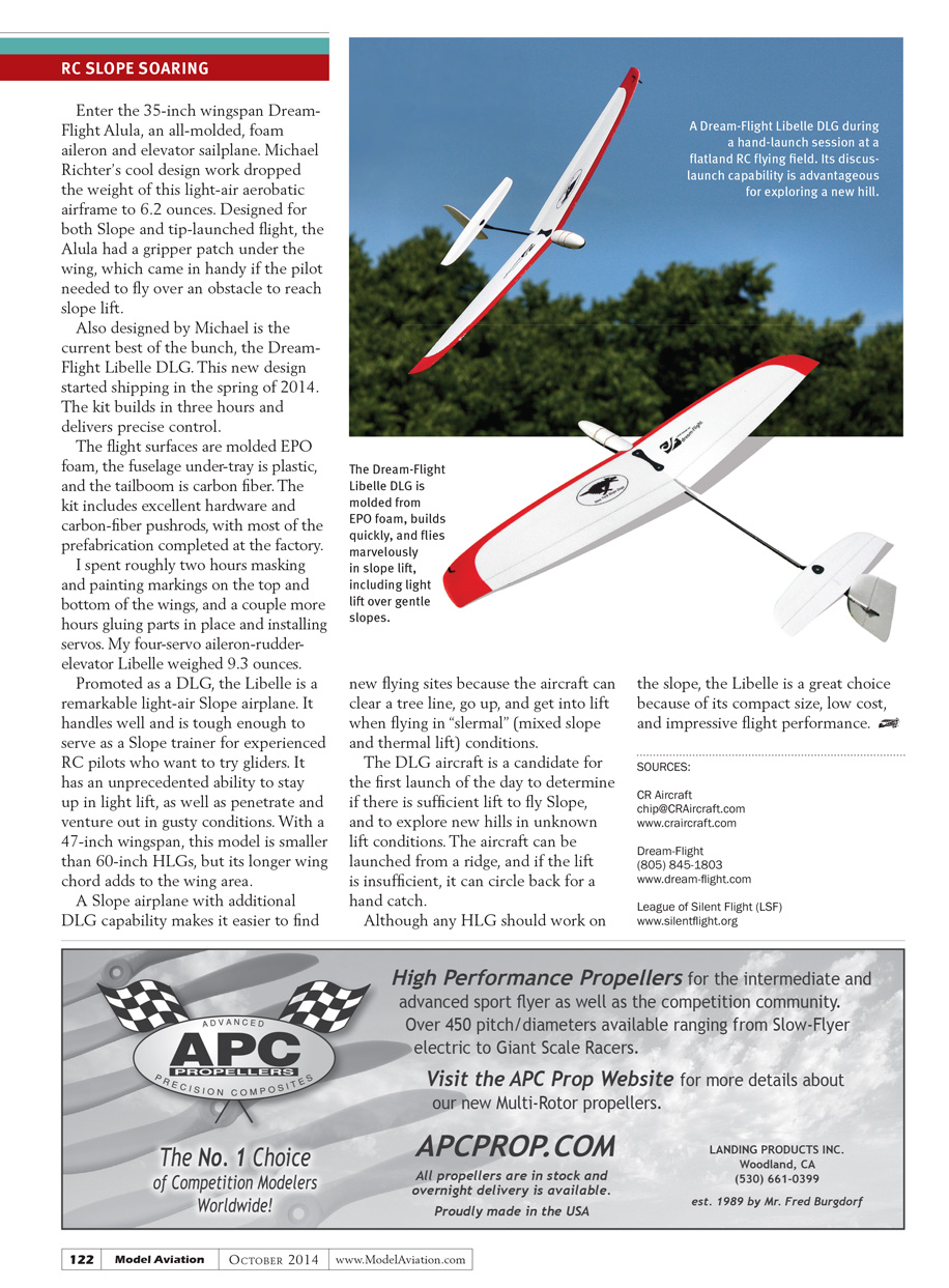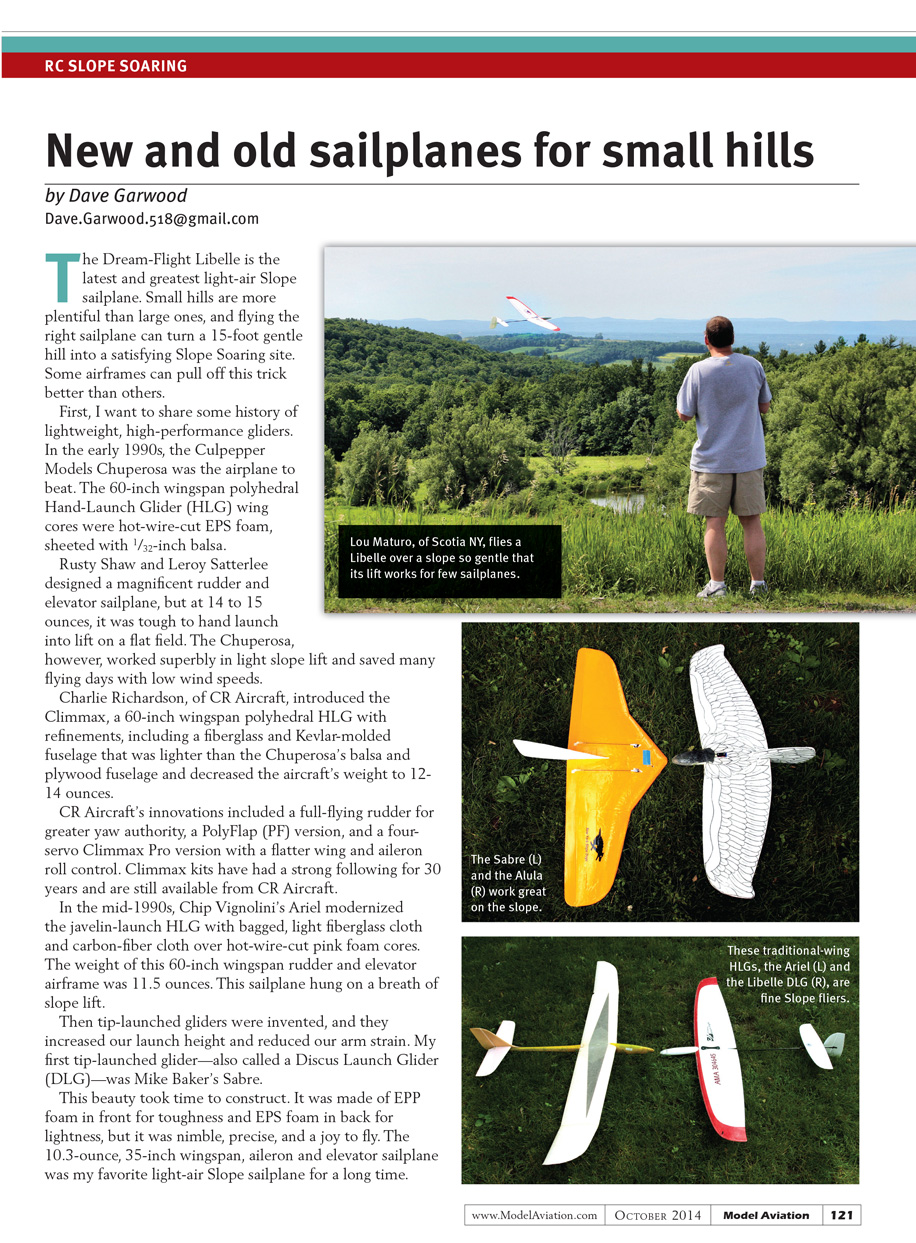 The Dream-Flight Libelle is the latest and greatest light-air Slope sailplane. Small hills are more plentiful than large ones, and flying the right sailplane can turn a 15-foot gentle hill into a satisfying Slope Soaring site. Some airframes can pull off this trick better than others.