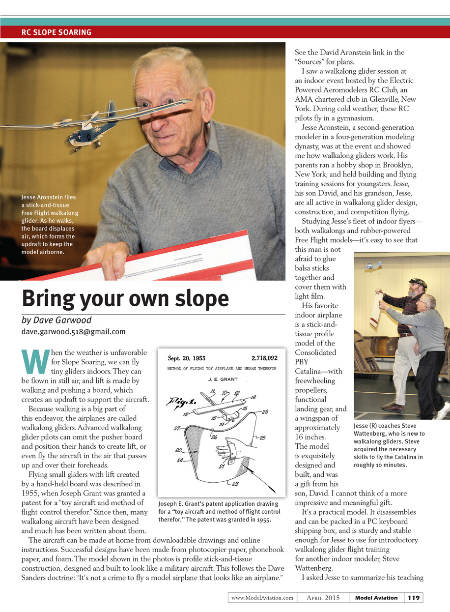 Jesse Aronstein, a second-generation modeler in a four-generation modeling dynasty, was at the event and showed me how walkalong gliders work. His parents ran a hobby shop in Brooklyn, New York, and held building and flying training sessions for youngsters. Jesse, his son David, and his grandson, Jesse, are all active in walkalong glider design, construction, and competition flying.