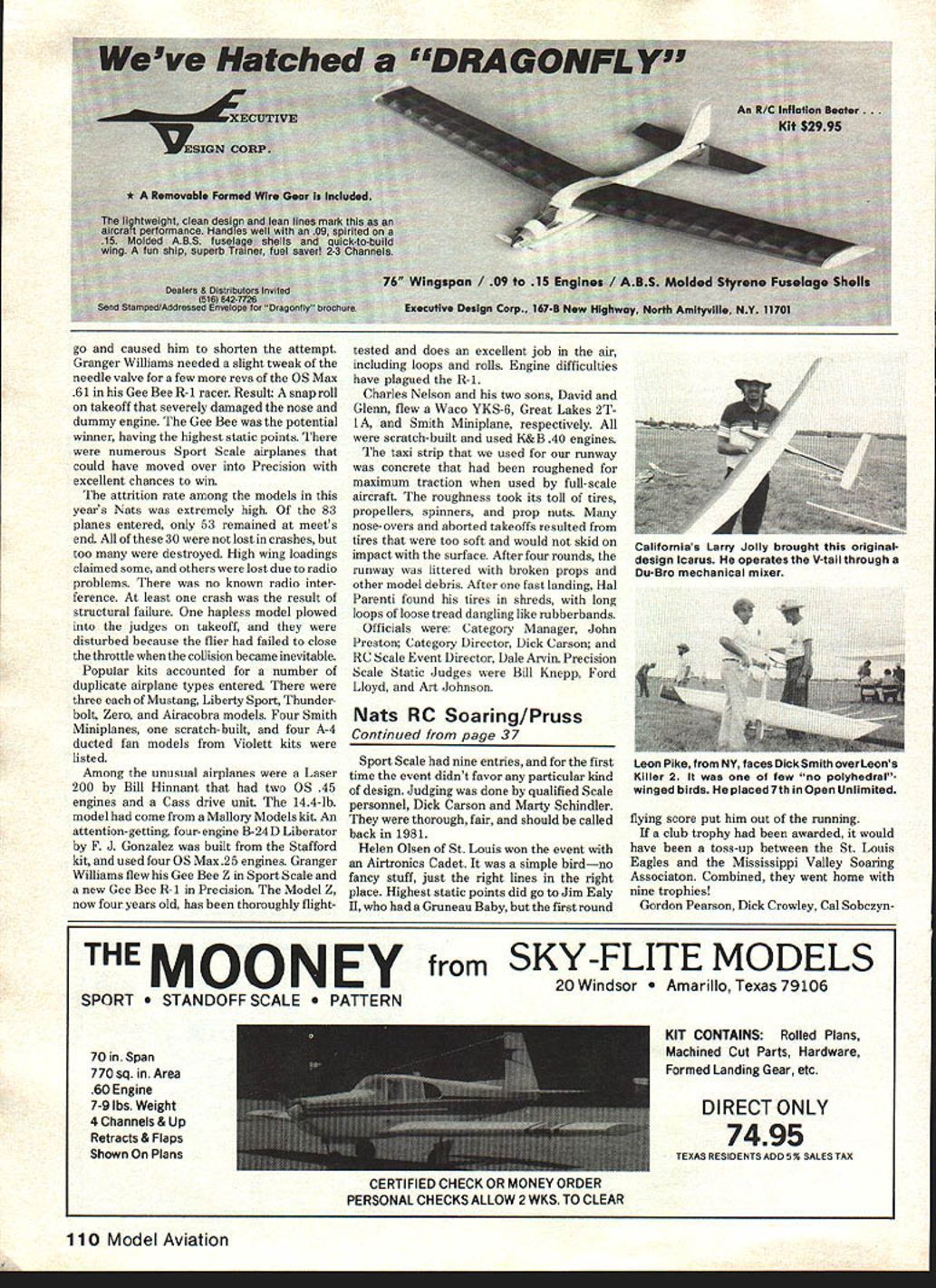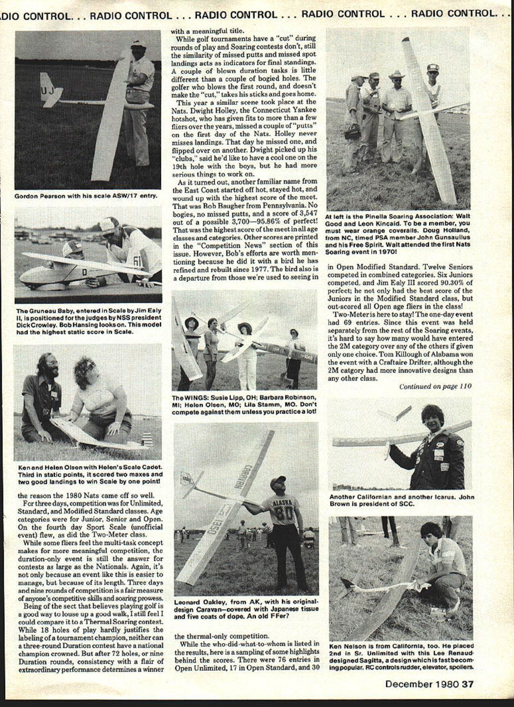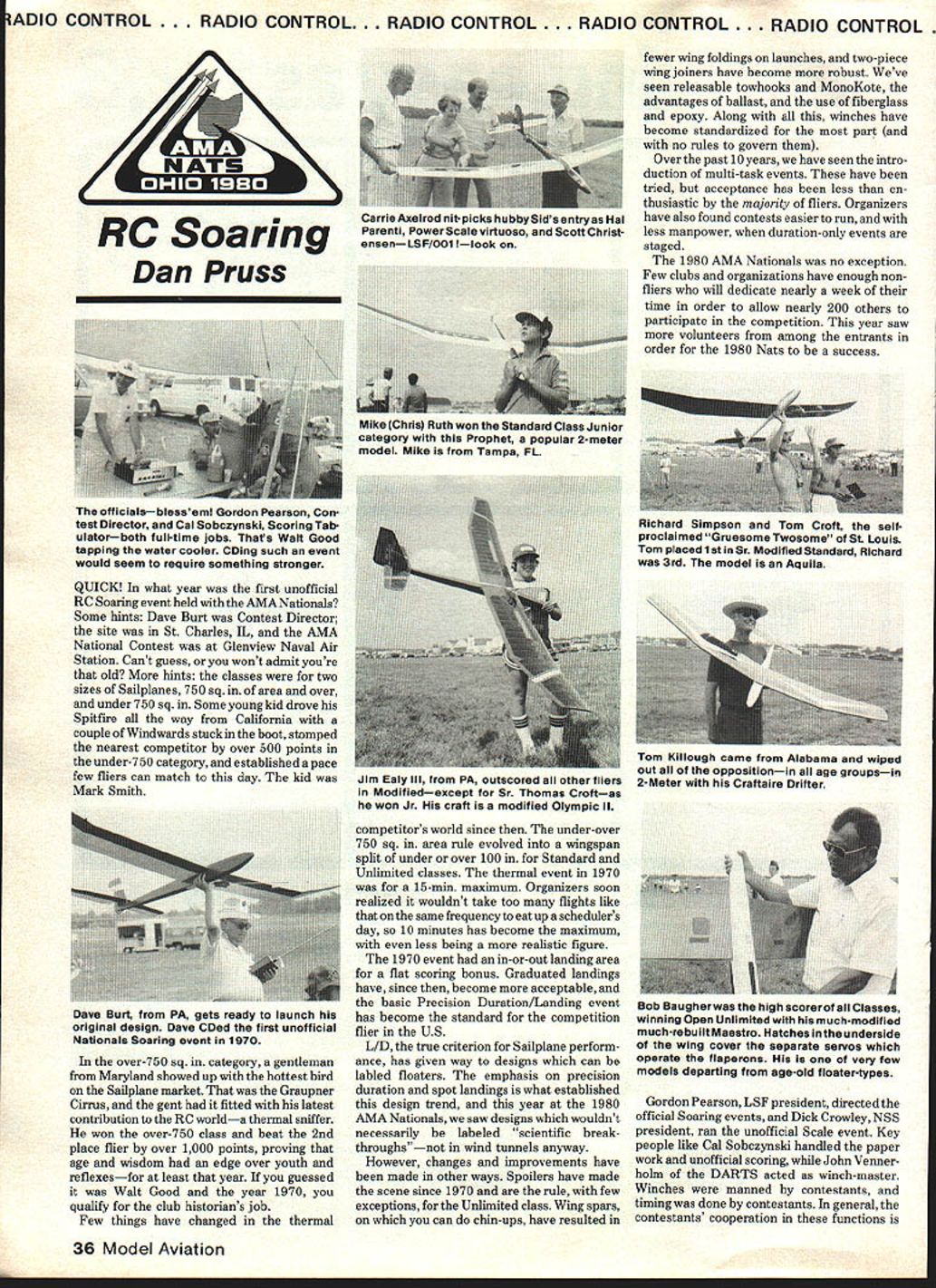 ADIO CONTROL. RADIO CONTROL. RADIO CONTROL . RADIO CONTROL . RADIO CONTROL QUICK what year first unofficial RC Soaring event held AMA Nationals Some hints Dave Burt Contest Director site St Charles IL AIVIA National Contest Glenview Naval Air Station Cant guess wont admit youre old hints classes two sizes Sailplanes 750 sq area over under 750 sq Some young kid drove Spitfire way California couple Windwards stuck boot stomped nearest competitor over 500 points under-750 category established apace few fliers can match day kid Mark Smith over-750 sq category gentleman Maryland showed up hottest bird Sailplane market Graupner Cirrus gent fitted latest contribution RC worlda thermal sniffer won over-750 class beat 2nd place flier over 1000 points proving age wisdom edge over youth reflexesfor least year guessed Walt Good year 1970 qualify club historians job Few things have changed thermal competitors world since under-over 750 sq area rule evolved wingspan split under over 100 Standard Unlimited classes thermal event 1970 15-mm maximum Organizers soon realized wouldnt take too flights like same frequency eat up schedulers day 10 minutes has become maximum less being realistic figure 1970 event in-or-out landing area flat scoring bonus Graduated landings have since become acceptable basic Precision Duration/Landing event has become standard competition flier US LID true criterion Sailplane perform ance has given way designs can labled floaters emphasis precision duration spot landings what established design trend year 1980 AMA Nationals saw designs wouldnt necessarily labeled scientific break throughsnot wind tunnels anyway However changes improvements have made other ways Spoilers have made scene since 1970 rule few exceptions Unlimited class Wing spars can chin-ups have resulted fewer wing foldings launches two-piece wing joiners have become robust Weve seen releasable towhooks MonoKote advantages ballast use fiberglass epoxy Along winches have become standardized part no rules govern Over past 10 years have seen intro duction multi-task events have tried acceptance has less en thusiastic majority fliers Organizers have also found contests easier run less manpower duration-only events staged 1980 AMA Nationals no exception Few clubs organizations have enough nonfliers will dedicate nearly week time order allow nearly 200 others participate competition year saw volunteers among entrants order 1980 Nats success Gordon Pearson LSF president directed official Soaring events Dick Crowley NSS president ran unofficial Scale event Key people like Cal Sobczynski handled paper work unofficial scoring John Venner hoim DARTS acted winch-master Winches manned contestants timing done contestants general contestants cooperation functions 36 Model Aviation Carrie Axeirod flit-picks hubbySids entryas Hal Parenti PowerScale virtuoso Scott Christ RC Soarin ensenLSF/O01 llook Dan Pruss Mike Chris Ruth won Standard Class Junior category Prophet popular 2-meter model Mike Tampa FL officialsblesseml Gordon Pearson Con test Director Cal Sobczynski Scoring Tab ulatorboth lull-time jobs Thats Walt Good tapping water cooler COing such event would seem require something stronger Richard Simpson Tom Croft selfproclaimed Gruesome Twosome St Louis Tom placed 1st Sr Modified Standard Richard 3rd model Aquila Jim Ealy Ill PA outscored other fliers Modifiedexcept Sr Thomas Croftas won Jr craft isa modified Olympic II Tom Killough came Alabama wiped out oppositionin age groupsin 2-Meter Craftaire Drifter Dave Burt PA gets ready launch original design Dave CDed first unofficial Nationals Soaring event 1970 Bob Baugher high scorer Classes winning Open Unlimited much-modified much-rebuilt Maestro Hatches underside wing cover separate servos operate flaperons very few models departing age-old floater-types DIO CONTROL. RADIO CONTROL . RADIO CONTROL . RADIO CONTROL. RADIO CONTROL. reason 1980 Nats came off well three days competition Unlimited Standard Modified Standard classes Age categories Junior Senior Open fourth day Sport Scale unofficial event flew did Two-Meter class some fliers feel multi-task concept makes meaningful competition duration-only event still answer contests large Nationals Again its because event like easier manage because its length Three days nine rounds competition fair measure anyones competitive skills soaring prowess Being sect believes playing golf good way louse up good walk still feel could compare Thermal Soaring contest 18 holes play hardly justifies labeling tournament champion neither can three-round Duration contest have national champion crowned after 72 holes nine Duration rounds consistency flair extraordinary performance determines winner meaningful title golf tournaments have cut during rounds play Soaring contests dont still similarity missed putts missed spot landings acts indicators final standings couple blown duration tasks little different couple bogied holes golfer blows first round doesnt make cut takes sticks goes home year similar scene took place Nats Dwight Holley Connecticut Yankee hotshot has given fits few fliers over years missed couple putts first day Nats Holley never misses landings day missed flipped over another Dwight picked up clubs said hed like have cool 19th hole boys serious things work As turned out another familiar name East Coast started off hot stayed hot wound up highest score meet Bob Baugher Pennsylvania No bogies no missed putts score 3547 out possible 37009586% perfect highest score meet age classes categories Other scores printed Competition News section issue However Bobs efforts worth men tioning because did bird has refined rebuilt since 1977 bird also departure used seeing thermal-only competition who-did-what-to-whom listed results sampling some highlights behind scores 76 entries Open Unlimited 17 Open Standard 30 Open Modified Standard Twelve Seniors competed combined categories Six Juniors competed Jim Ealy III scored 9030% perfect best score 