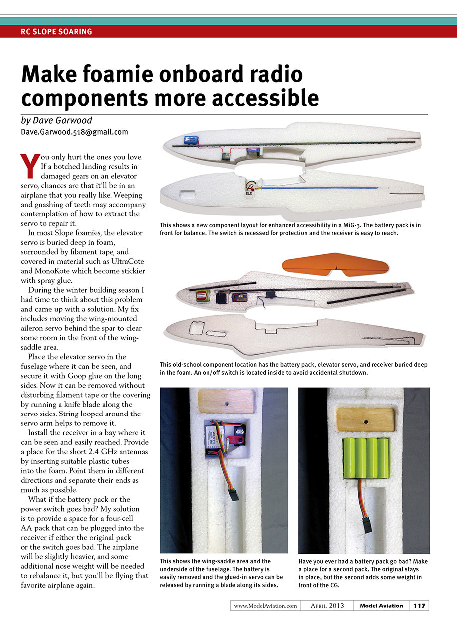 What if the battery pack or the power switch goes bad? My solution is to provide a space for a four-cell AA pack that can be plugged into the receiver if either the original pack or the switch goes bad. The airplane will be slightly heavier, and some additional nose weight will be needed to rebalance it, but you’ll be flying that favorite airplane again.