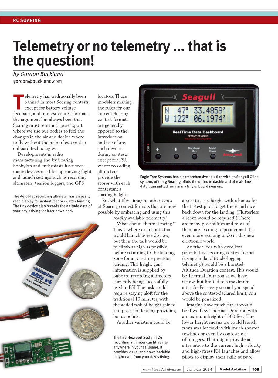 Developments in radio manufacturing and by Soaring hobbyists and enthusiasts have seen many devices used for optimizing flight and launch settings such as recording altimeters, tension loggers, and GPS locators. Those modelers making the rules for our current Soaring contest formats are generally opposed to the introduction and use of any such devices during contests except for F5J, where recording altimeters provides the scorer with each contestant’s starting height.