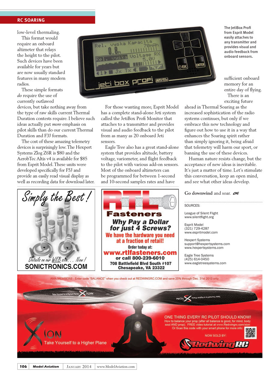 There is an exciting future ahead in Thermal Soaring as the increased sophistication of the radio systems continues, but only if we embrace this new technology and figure out how to use it in a way that enhances the Soaring spirit rather than simply ignoring it, being afraid that telemetry will harm our sport, or banning the use of these devices.