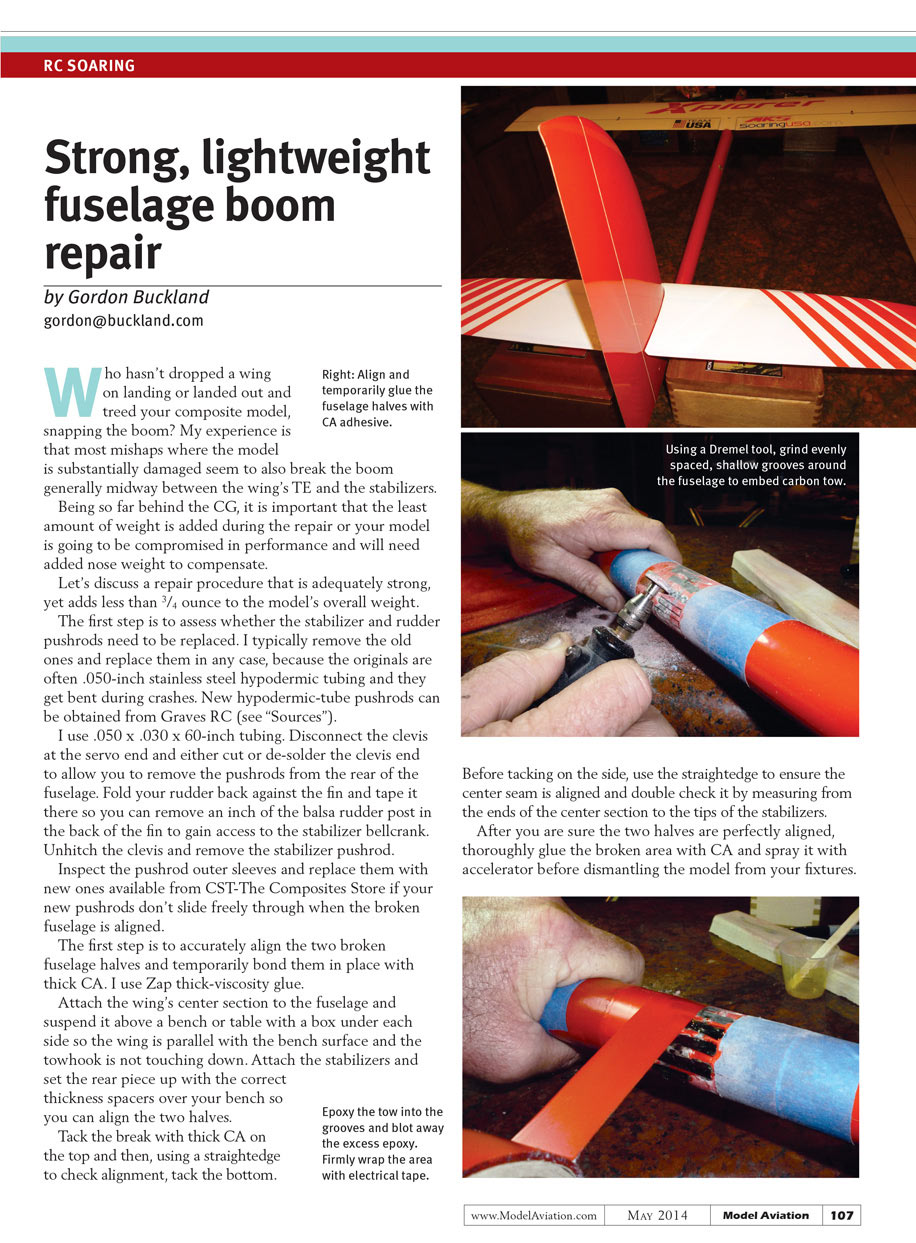 Who hasn’t dropped a wing on landing or landed out and treed your composite model, snapping the boom? My experience is that most mishaps where the model is substantially damaged seem to also break the boom generally midway between the wing’s TE and the stabilizers.