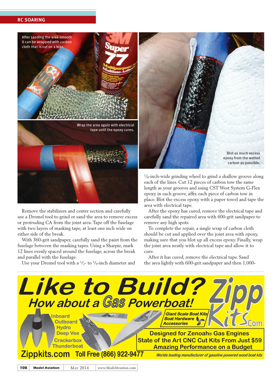 Remove the stabilizers and center section and carefully use a Dremel tool to grind or sand the area to remove excess or protruding CA from the joint area. Tape off the fuselage with two layers of masking tape, at least one inch wide on either side of the break.