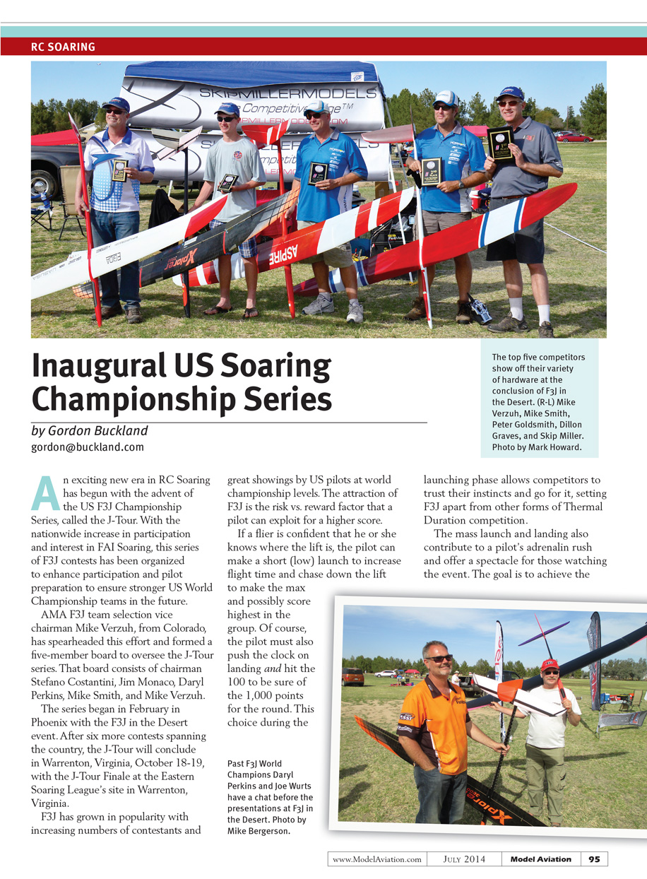 An exciting new era in RC Soaring has begun with the advent of the US F3J Championship Series, called the J-Tour. With the nationwide increase in participation and interest in FAI Soaring, this series of F3J contests has been organized to enhance participation and pilot preparation to ensure stronger US World Championship teams in the future.