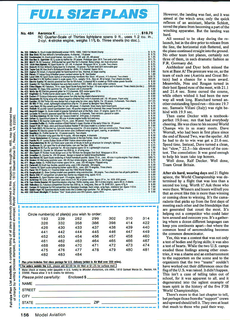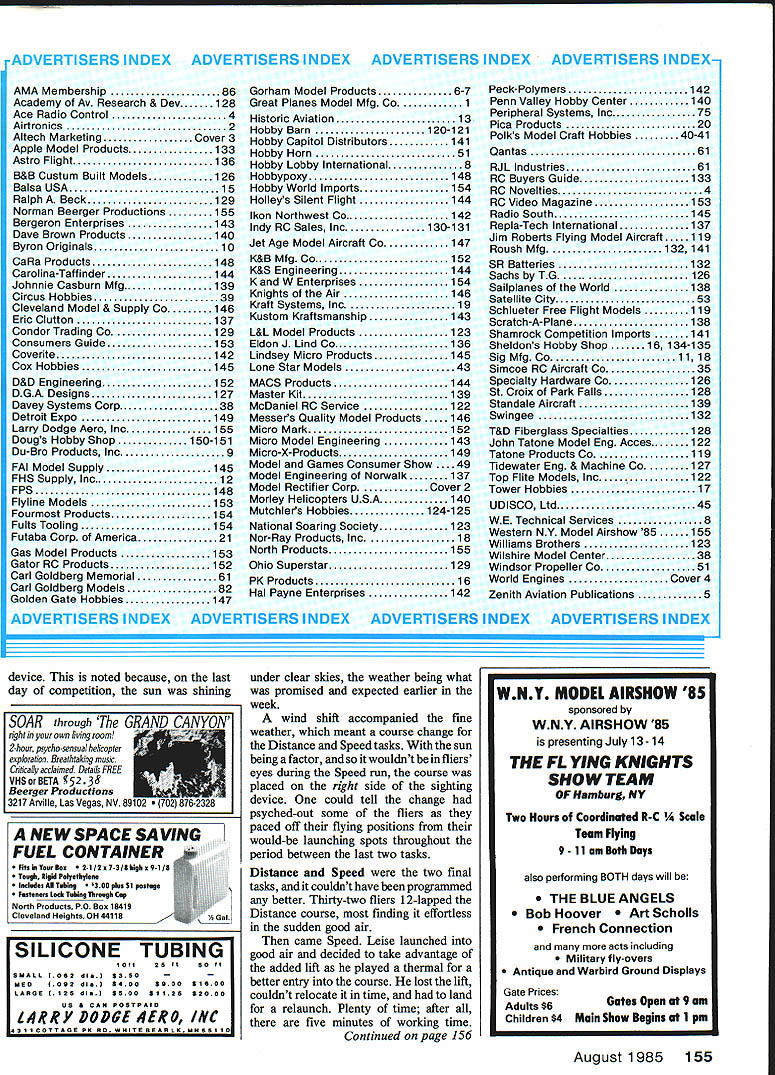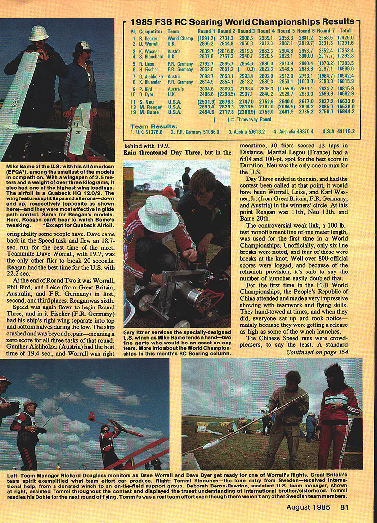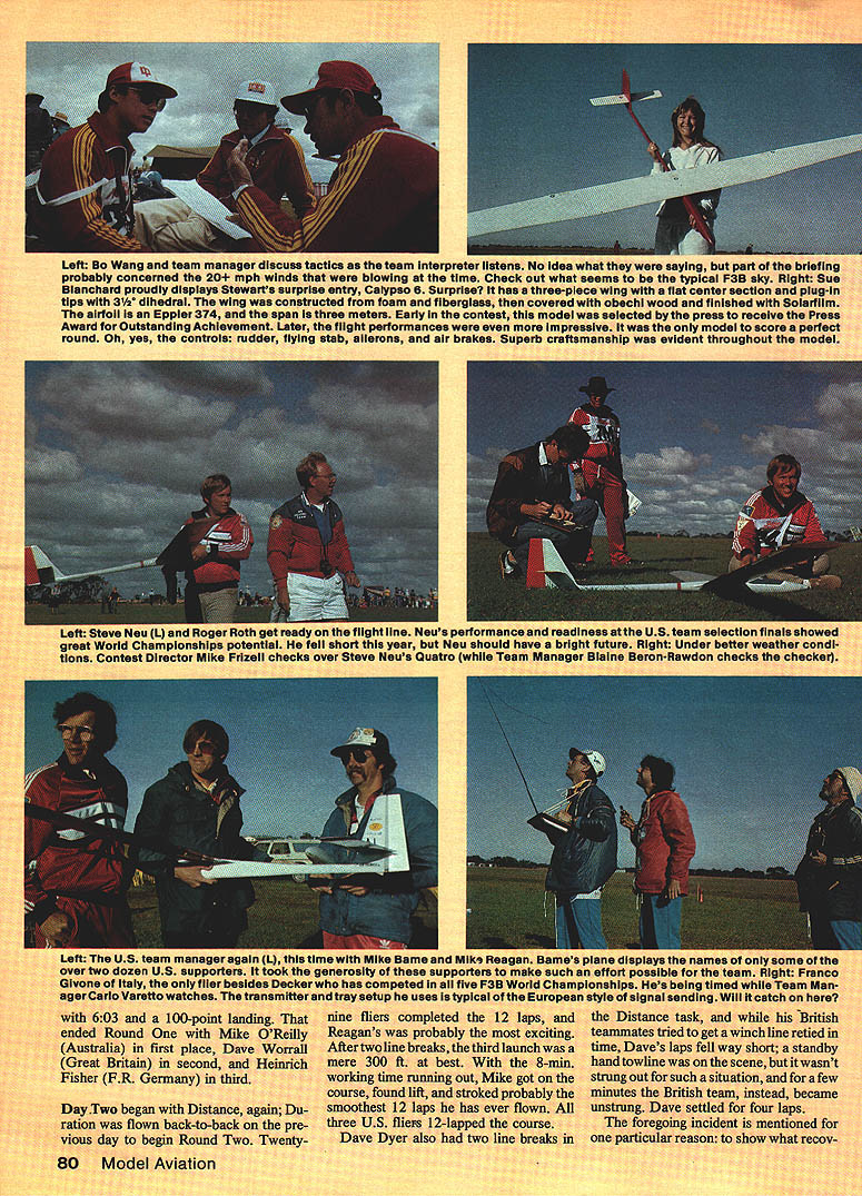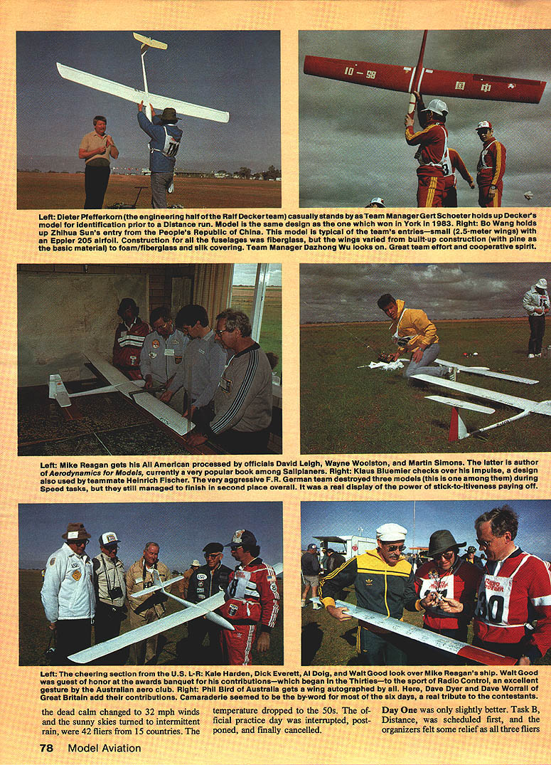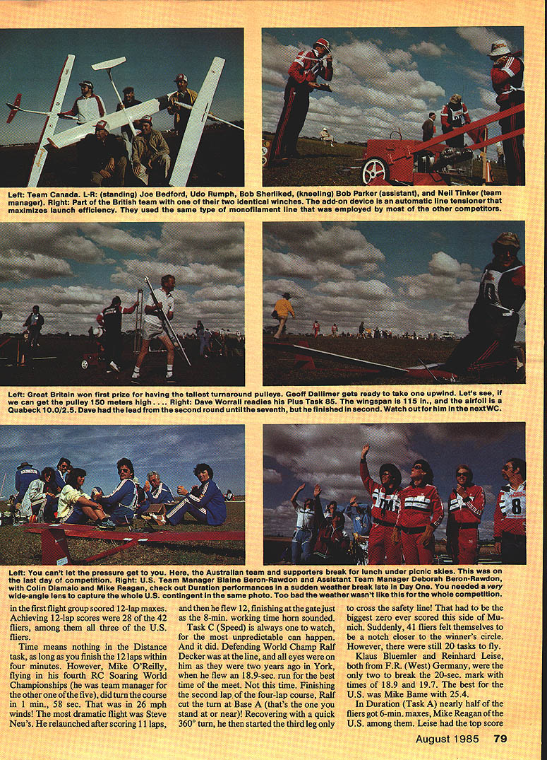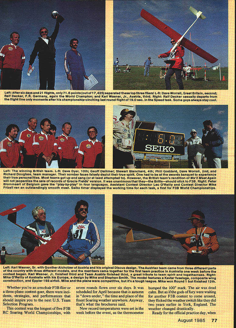 Raif Decker FUR Germany successfully 4efended World Champion years April 1 could n I I THIS WAS lastlomir Belgium addedonly tired legs armsbut hean-else account 80 organizers coming over Australia neip event together hosnit shown Leo OReilly met group upon came out lone entrant Swe George Pappas eled 1800 miles ani to helo Mexican ent as run t ifliers sec RC Ti Left Aftersix daysand 21 flights oniy7l 6 pointsoutof 17425 separated topthreefiiersi L-R Dave Worrali Great Britain secona Rail Decker PR Germany again Wand Champion Karl Weaner Jr Austria third Right Rail Decker casuaiiy departs flight line oniy moments after championship-cinching lest round flight 01190 sec Speed task Some guys always stay cool Left winning urman icam L-H uave Dyer 10th hieoff Daliimer Stewart Blanchard 4th ard Dave Worrali 2nd Richara uouglase team manager somber faces falsely depict true spirit awards banquet experience true peraonalities Moat teems got up sang least attempted However British teams rendition Well Meet gain will Jeopardize sale records Grade Fields versIon unanimous theythe Brittsshouid stick F3B Right Peter Biommeart Belgium gave play-by-pisy four ianguages Assistant Contest Director Leo OReiiiy Contest DIrector Mike Frizeli ran en outstandIngly smooth meet Seiko timer dispiayed working time task fIrst P35 World Championships seven rounds flown over six days scheduled April because autumn down under time place finest Soaring weather anywhere Anyway thats what brochures said New record temperatures set week before event thermometer i Whether youre armchair F3B flier three-plane contest-goer inci dents strategies performances should inspire next US Team Selection Program contest longest five F3B RC Soaring World Championships ginal Discus deeign Austrian team came th together first teem practice Australia finished third greet tribute team spirit itephan Smith model features Kevlar fuselag ompetitive its tough league Mike won Round 1 t 1 n bumped 1000 mark air dead calm gods fury waiting another F3B contest come around fficked weather switch like did two years earlier York England weather changed drastically Ready official practice day Left Distalmiferkom ti model Ifttlfication up Zhihua Eppier basic material f Reagan gets h umics Moda .y teammate Helm asks still IC -flu wee nusigia. Team Manager Imaz officials David book among Saul ryesiv PR Geri second piece overall rt5choeterholdi 1983 Right So small 28-mete p construction i effort coop. artin Simons Thi hecks over 1w ama etick-to-Itlveness P1 OK over Mt 4lC spOft Lem V5 5 L nticai nofilament un tarner assIsiarnJ Nell Tinker twain device automatic line tensioner employed other competitors Left ureat Britain won Tiret prize having ins tailest turnaround pulleys Geoff Dalilmer gets ready take upwind Lets see can get puiley 150 meters high.. Right Dave Worrali readies Pius Task 85 wingspan 115 airfoil Quabeck 100/25 Dave hadthe ieadfrom second round until seventh finished second Watch outforhim next WC Left US team manage over two dozen US SUDDOr GIvone Italy ager Carlo Varetto wa 603 100-point ended Round Australia first place Great Britain second Fisher PR Gemiany Day Two began Distance again Du ration flown backto-back pre- vious day begin Round Two Twentyn interpretef time 6 Surprise fiberglas mexeuu Early con s flight performances eve stab ailerons air brakes Sij wnn WEEKS name Mn merosity support o has competed fiv4 ma tray setup usea typical nine fliers completed Reagans probably After two line breaks th 300 ft best time runni nii also sayli perti bethety alF3Bsi flat center sectloi hl wood finished WI press receive model score a evident throughout ftS US team selsc iture Right Under bel Beron-Rawdon ch wet Irtp4 tel" hips ebi signal Distance ta teammates tried time Daves laps hand towline 01 strung out such minutes British setti British ed standby ivasnt tor few became d fnr 80 Model Aviation Leftand16 tiignt NeWs perw great World ampionifelt short year Neu tlons Contest Director h. over Steve Neus Quatro wL... ering ability some people have Dave came back Speed task flew 187sec run best time meet Teammate Dave Worrall 197 other flier break 20 seconds Reagan best time US 222 sec end Round Two Worrall Philand -from Great Britain Germany first ces Reagan sixth flown begin Round cher FR Germany separate top thetow ship airmeaning s round ria best 1985 F3B RC Soaring World Championships Results TernRound 2 Round 3 Round 4 Round 5 Round S Round 7 Total World Champ UK P1 Competitor 1Fl Decker 20 Worrall 3K Weaner 4S Blanchard 5R Usse 6H Fischer 713 Aichholzer 8K Bluemler 9P Bird 1013 Dyer 11SNeu 13 M Reagan 19 M Dame Austria UK FR Germany FR Germany Austria FR Germany Australia UK USA USA USA RouRd 1 19912 28652 28397 28378 21927 28626 26987 26149 28046 24866 25319 26934 24846 27313 29449 28168 27673 28657 26512 26531 28541 28692 22985 26793 28293 27179 29088 29508 29195 29407 29546 00 29934 28182 27984 29071 27470 26185 23669 29891 29123 28833 29205 28960 28223 28920 28853 28363 28402 27526 27070 27560 29563 28871 29048 28261 29139 29465 29120 28501 17558 29287 29400 20949 24819 28812 28197 29537 39000 28604 28868 27931 10000 28731 29333 26770 29942 27352 29585174250 28313173916 28524173534 27177172923 19782172835 27971169666 19847169424 27933188159 26342168159 25969166929 28372196330 28857165380 27597159442 waway Round Team Results 1 UK 5137682 FR Germany 5106603 Austria 5061324 Australia 488704USA 491152 behind 199 Rain threatened Day Three meantime 30 scored 12 laps Distance Martial Legon France 604 100-pt spot best score Duration Neu max US Day Three ended rain contest called point would have Worrall Leise Karl Wasncr Jr Great Britain FR Germany Austria winners circle point Reagan 11th Nen 13th Bame 20th controversial weak link 100-lbtest monofilament line meter length used first time World Championships Unofficially six line breaks noted four breaks knot Well over 80 official scores logged because relaunch provision its safe say number l