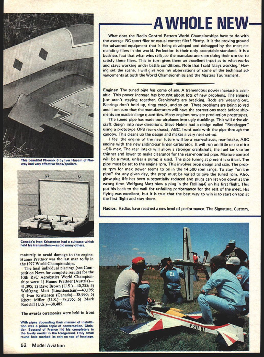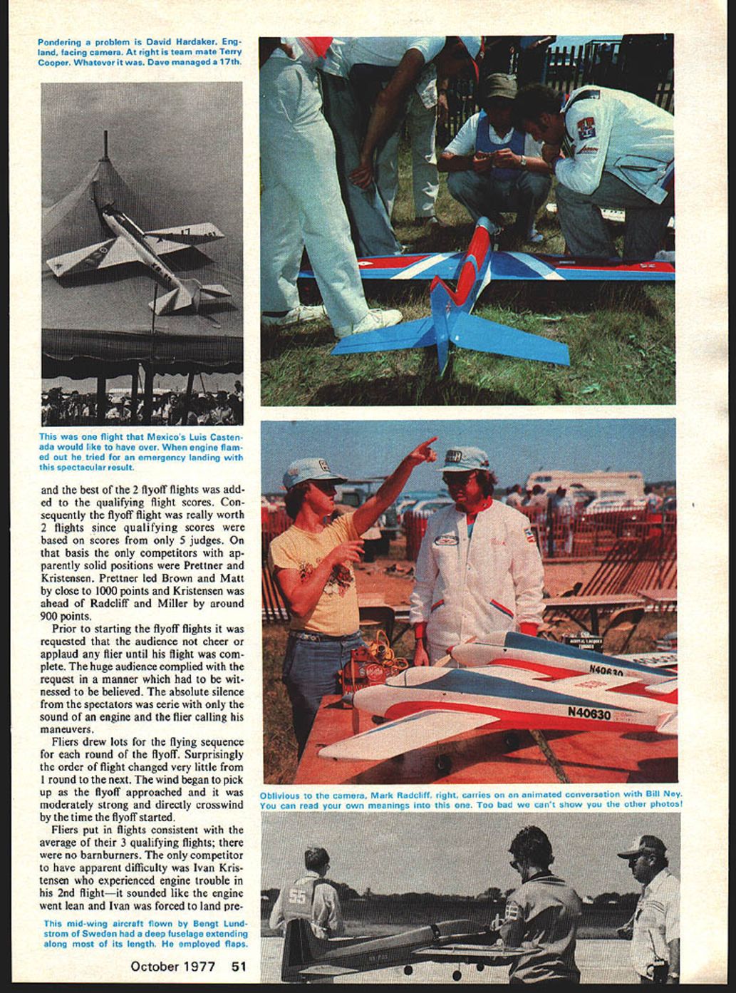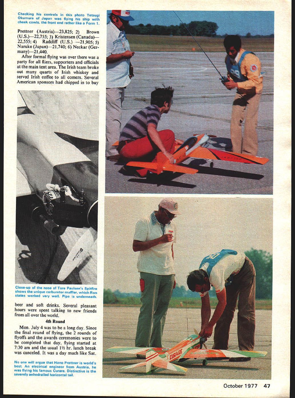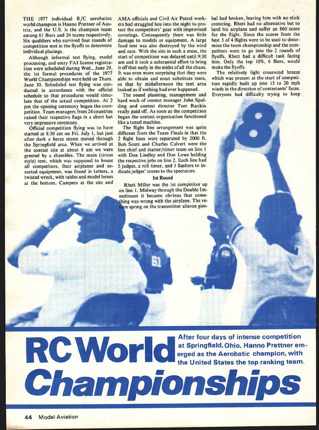 THE 1977 individual R/C aerobatics world champion Hanno Prettner Aus tria US champion team among 61 fliers 24 teams respectively Six qualifiers survived four rounds competition met flyoffs determine individual placings Although informal test flying model processing entry FAT license registra tion scheduled during Wed June 29 1st formal procedures 1977 World Championships held Thurs June 30 Scheduled test flying con ducted accordance official schedule procedures would simu late actual competition 2 pm opening ceremony began com petition Team managers 24 countries raised respective flags short very impressive ceremony Official competition flying have started 830 am Fri July 1 just after dark fierce storm moved through Springfield area arrived contest site about 8 am greeted shambles main circus style tent supposed house competitors airplanes sorted equipment found tatters twisted wreck tables model boxes bottom Campers site AMA officials Civil Air Patrol work ers struggled late night pro tect competitors gear improvised coverings Consequently little damage models equipment large food tent also destroyed wind rain site such mess start competition delayed until 930 am took substantial effort bring off early midst chaos surprising able obtain erect substitute tents midafternoon tent area looked nothing ever happened sound planning management hard work contest manager John Spal ding contest director Tom Rankin really paid off As soon competition began contest organization functioned like tuned machine flight line arrangement quite different Team Finals 2 flight lines separated 2000 ft Bob Scott Charles Calvert line chief starter/timer team line Don Lindley Don Lowe holding respective jobs line 2 line 5 judges roll timer 5 flashers dicate judges scores spectators 1st Round Rhett Miller 1st competitor up line Midway through Double Tm melmann became obvious some ng wrong airplane re spring transmitter aileron gim hal broken leaving him no stick centering Rhett no alternative land airplane suffer 860 score flight Since scores best 3 4 flights used deter team championship com petitors go 2 rounds flyoffs Rhett difficult task facing him Only top 10% 6 fliers would make flyoffs relatively light crosswind breeze present start competi tion rapidly built up 15 20 mph winds direction contestants faces Everyone difficulty trying keep RCWorId After four days intense competition SpringfieldOhio Hanno Prettner em erged Aerobatic champion United States top ranking team Championships 44 Model Aviation flights out front judges stead right top Flight scores suffered severely few pilots could overcome handicap Notable ex ceptions Hanno Prettner Mark Radcliff outstanding flights such adverse conditions Wolfgang Matt 1975 world cham pion engine flameout midway through flight appeared would facing same difficult task Rhett Miller get flyoffs also make subsequent flight count As turned out severe crosswind actually helped Matt Miller because virtually other competitor lowest flight score during 1st round ended up throwing score away However no knew things would turn out way pressure really Matt Miller well remaining flights end 1st round top 6 fliers Prettner Austria75 10 2 Radcliff US7035 3 Neckar Ger many6970 4 Yoshioka Japan6855 5 Brown US6655 6 Bertolani Italy6580 2nd Round Sat July 2 2nd day competition clear skies light moderate quartering crosswinds contestants found much liking Fri Scores soared relative previous day Unfortunately also several instances severe interfer ence 27145 MHz some glitch- Unusual several respects Spitfire entered Tore Paulsen Norway sand-and es 72 MHz frequencies privi- spinach camouflaged scale-type model tail-dragger flown during competition As leged watch gorgeous flight Ivan another picture shows detail engine equipped intake muffler October 1977 45 Like contestants judges worlds best came various countries photo taken during actual flight holding aloft individual point cards Olympic-style scoring naturally quite popular watching competitors spectators Second-place winner Dave Brown wife Sally happily pose trusty red-and-white Phoenix 7 During 1 0-man fly-off crowd maintained silenceuntil flight com plete just sounds engine flier calling maneuvers Kristensen left spectators cheer ing applauding maneuver score 8195 highest competition until point Rhett Miller Wolfgang Matt both 7700 flight scores began move up stand ings top six after 2nd round 1 Prettner Austrial5580 2 Kristensen Canada14560 3 Brown US14535 4 Radcliff US14350 5 Neck ar Germany14160 6 Naruke Japan 14140 3rd Round Sun July 3 3rd day competition blessed clear skies light vari able winds winds light contestants taking off landing both directions International rules allow competitor take off land direction choice direction perform 1st airborne maneuver figure M So uncommon see competitor take off right left start figure M left right cer tainly kept judges toes light winds resulted generally higher scores competitors Hanno Prettner Dave Brown both 8 200 scores lead way Matt Miller continued bear up under pressure advanced 12th 31st place respectively Rhett would have much higher initial score 860 compared Matts 4570 held him back top 6 after 3rd round 1 46 Model Aviation United States team solidly consistent placing three members fly-offs L R Dick Penrod team manager Dave Brown Rhett Miller Mark Radcliff same team represented USA 1975 WC Don Lowe team manager year Under sunny skies Springrield waiting contestants models pits spectators occasional beach umbrella pleased eye color rainbow another part field some 24 national flags raised short impressive ceremony Checking controls photo Tetsugi Okumura Japan flying ship cheek cowls front end rather like Form 1 Prettner Austria23825 2 Brown US22755 3 Kristensen Canada 22555 4 Radcliff US 21905 5 Naruke Japan2 1740 6 Neckar Ger many2 1440 After formal flying over party fliers supporters officials main tent area Irish team broke out quarts Irish whiskey served Irish coffee co