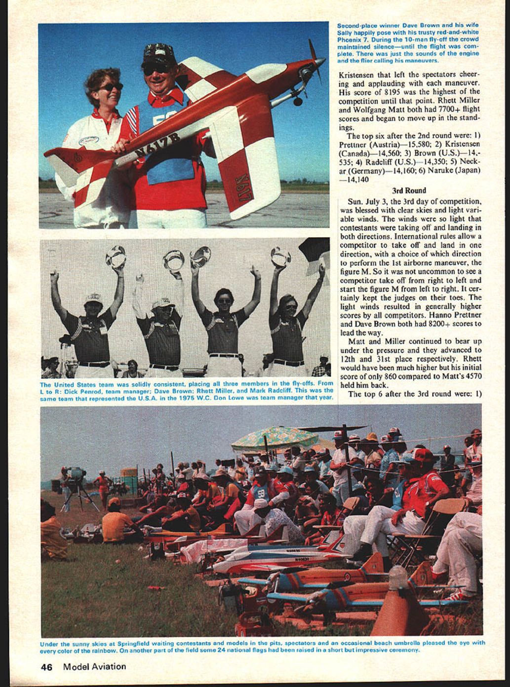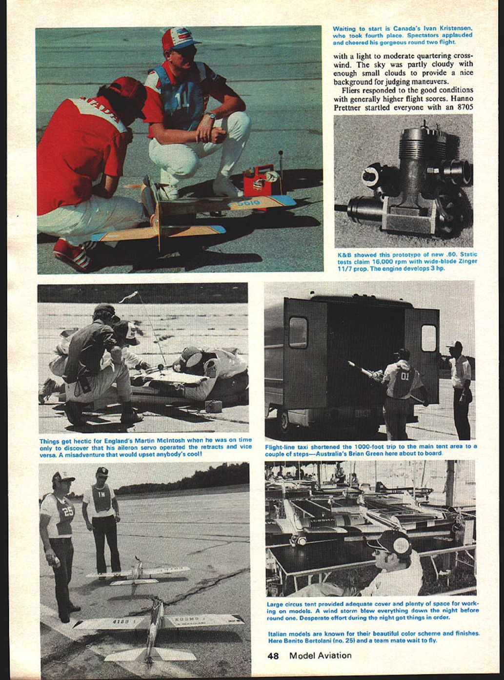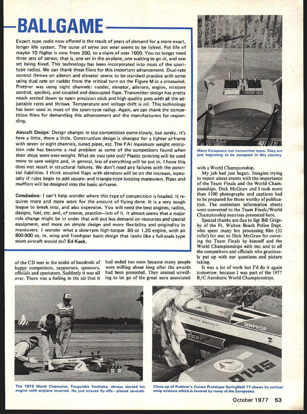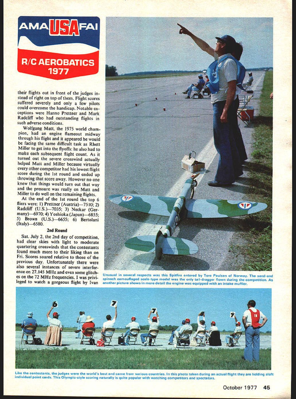 THE 1977 individual R/C aerobatics world champion Hanno Prettner Aus tria US champion team among 61 fliers 24 teams respectively Six qualifiers survived four rounds competition met flyoffs determine individual placings Although informal test flying model processing entry FAT license registra tion scheduled during Wed June 29 1st formal procedures 1977 World Championships held Thurs June 30 Scheduled test flying con ducted accordance official schedule procedures would simu late actual competition 2 pm opening ceremony began com petition Team managers 24 countries raised respective flags short very impressive ceremony Official competition flying have started 830 am Fri July 1 just after dark fierce storm moved through Springfield area arrived contest site about 8 am greeted shambles main circus style tent supposed house competitors airplanes sorted equipment found tatters twisted wreck tables model boxes bottom Campers site AMA officials Civil Air Patrol work ers struggled late night pro tect competitors gear improvised coverings Consequently little damage models equipment large food tent also destroyed wind rain site such mess start competition delayed until 930 am took substantial effort bring off early midst chaos surprising able obtain erect substitute tents midafternoon tent area looked nothing ever happened sound planning management hard work contest manager John Spal ding contest director Tom Rankin really paid off As soon competition began contest organization functioned like tuned machine flight line arrangement quite different Team Finals 2 flight lines separated 2000 ft Bob Scott Charles Calvert line chief starter/timer team line Don Lindley Don Lowe holding respective jobs line 2 line 5 judges roll timer 5 flashers dicate judges scores spectators 1st Round Rhett Miller 1st competitor up line Midway through Double Tm melmann became obvious some ng wrong airplane re spring transmitter aileron gim hal broken leaving him no stick centering Rhett no alternative land airplane suffer 860 score flight Since scores best 3 4 flights used deter team championship com petitors go 2 rounds flyoffs Rhett difficult task facing him Only top 10% 6 fliers would make flyoffs relatively light crosswind breeze present start competi tion rapidly built up 15 20 mph winds direction contestants faces Everyone difficulty trying keep RCWorId After four days intense competition SpringfieldOhio Hanno Prettner em erged Aerobatic champion United States top ranking team Championships 44 Model Aviation flights out front judges stead right top Flight scores suffered severely few pilots could overcome handicap Notable ex ceptions Hanno Prettner Mark Radcliff outstanding flights such adverse conditions Wolfgang Matt 1975 world cham pion engine flameout midway through flight appeared would facing same difficult task Rhett Miller get flyoffs also make subsequent flight count As turned out severe crosswind actually helped Matt Miller because virtually other competitor lowest flight score during 1st round ended up throwing score away However no knew things would turn out way pressure really Matt Miller well remaining flights end 1st round top 6 fliers Prettner Austria75 10 2 Radcliff US7035 3 Neckar Ger many6970 4 Yoshioka Japan6855 5 Brown US6655 6 Bertolani Italy6580 2nd Round Sat July 2 2nd day competition clear skies light moderate quartering crosswinds contestants found much liking Fri Scores soared relative previous day Unfortunately also several instances severe interfer ence 27145 MHz some glitch- Unusual several respects Spitfire entered Tore Paulsen Norway sand-and es 72 MHz frequencies privi- spinach camouflaged scale-type model tail-dragger flown during competition As leged watch gorgeous flight Ivan another picture shows detail engine equipped intake muffler October 1977 45 Like contestants judges worlds best came various countries photo taken during actual flight holding aloft individual point cards Olympic-style scoring naturally quite popular watching competitors spectators Second-place winner Dave Brown wife Sally happily pose trusty red-and-white Phoenix 7 During 1 0-man fly-off crowd maintained silenceuntil flight com plete just sounds engine flier calling maneuvers Kristensen left spectators cheer ing applauding maneuver score 8195 highest competition until point Rhett Miller Wolfgang Matt both 7700 flight scores began move up stand ings top six after 2nd round 1 Prettner Austrial5580 2 Kristensen Canada14560 3 Brown US14535 4 Radcliff US14350 5 Neck ar Germany14160 6 Naruke Japan 14140 3rd Round Sun July 3 3rd day competition blessed clear skies light vari able winds winds light contestants taking off landing both directions International rules allow competitor take off land direction choice direction perform 1st airborne maneuver figure M So uncommon see competitor take off right left start figure M left right cer tainly kept judges toes light winds resulted generally higher scores competitors Hanno Prettner Dave Brown both 8 200 scores lead way Matt Miller continued bear up under pressure advanced 12th 31st place respectively Rhett would have much higher initial score 860 compared Matts 4570 held him back top 6 after 3rd round 1 46 Model Aviation United States team solidly consistent placing three members fly-offs L R Dick Penrod team manager Dave Brown Rhett Miller Mark Radcliff same team represented USA 1975 WC Don Lowe team manager year Under sunny skies Springrield waiting contestants models pits spectators occasional beach umbrella pleased eye color rainbow another part field some 24 national flags raised short impressive ceremony Checking controls photo Tetsugi Okumura Japan flying ship cheek cowls front end rather like Form 1 Prettner Austria23825 2 Brown US22755 3 Kristensen Canada 22555 4 Radcliff US 21905 5 Naruke Japan2 1740 6 Neckar Ger many2 1440 After formal flying over party fliers supporters officials main tent area Irish team broke out quarts Irish whiskey served Irish coffee co