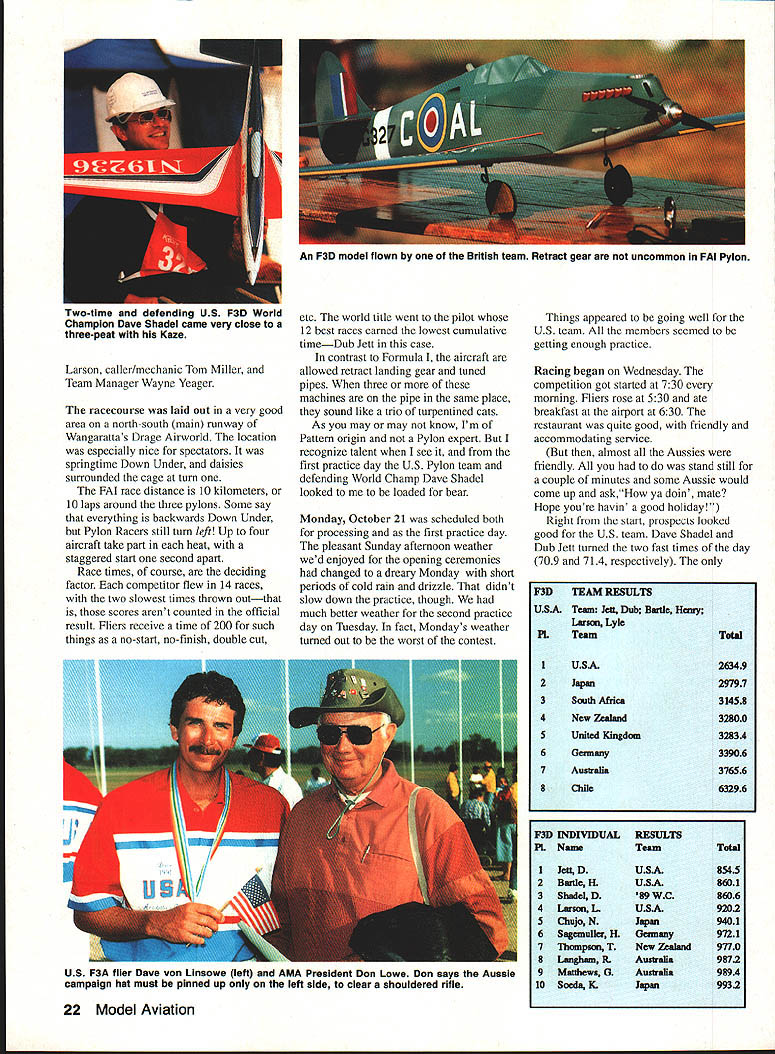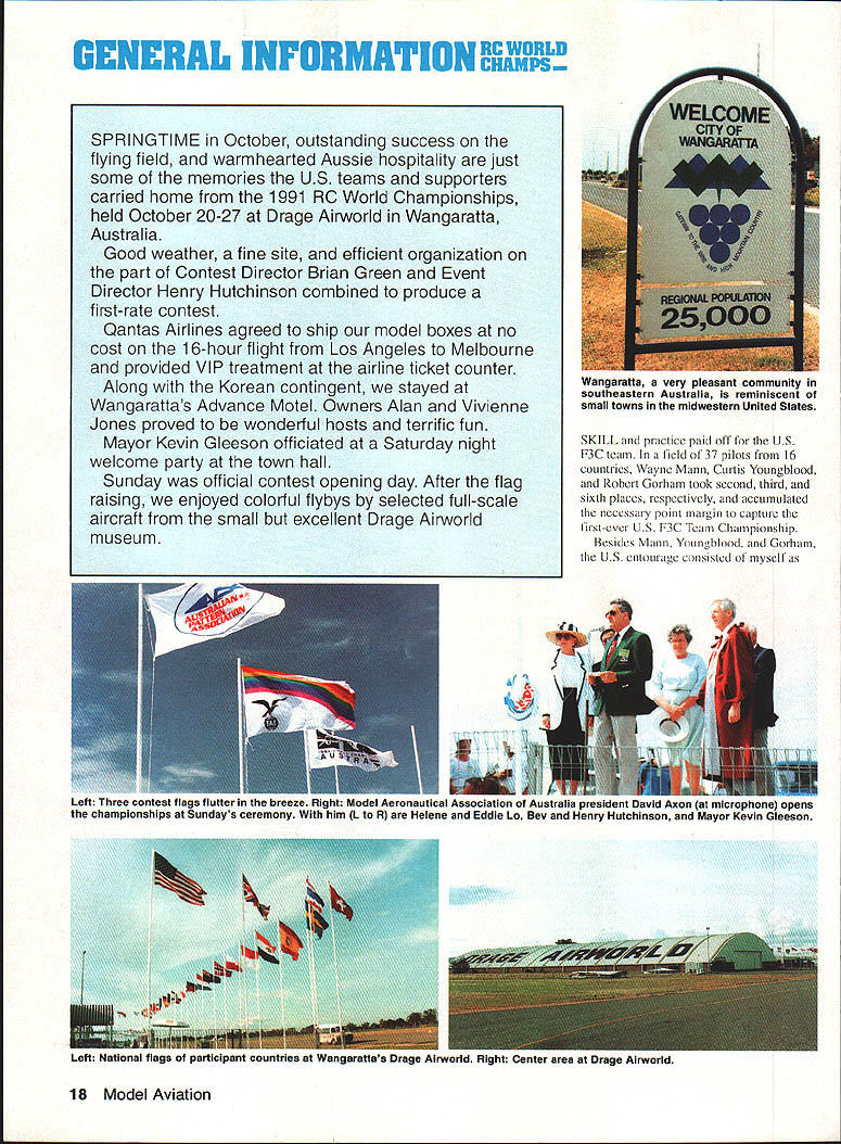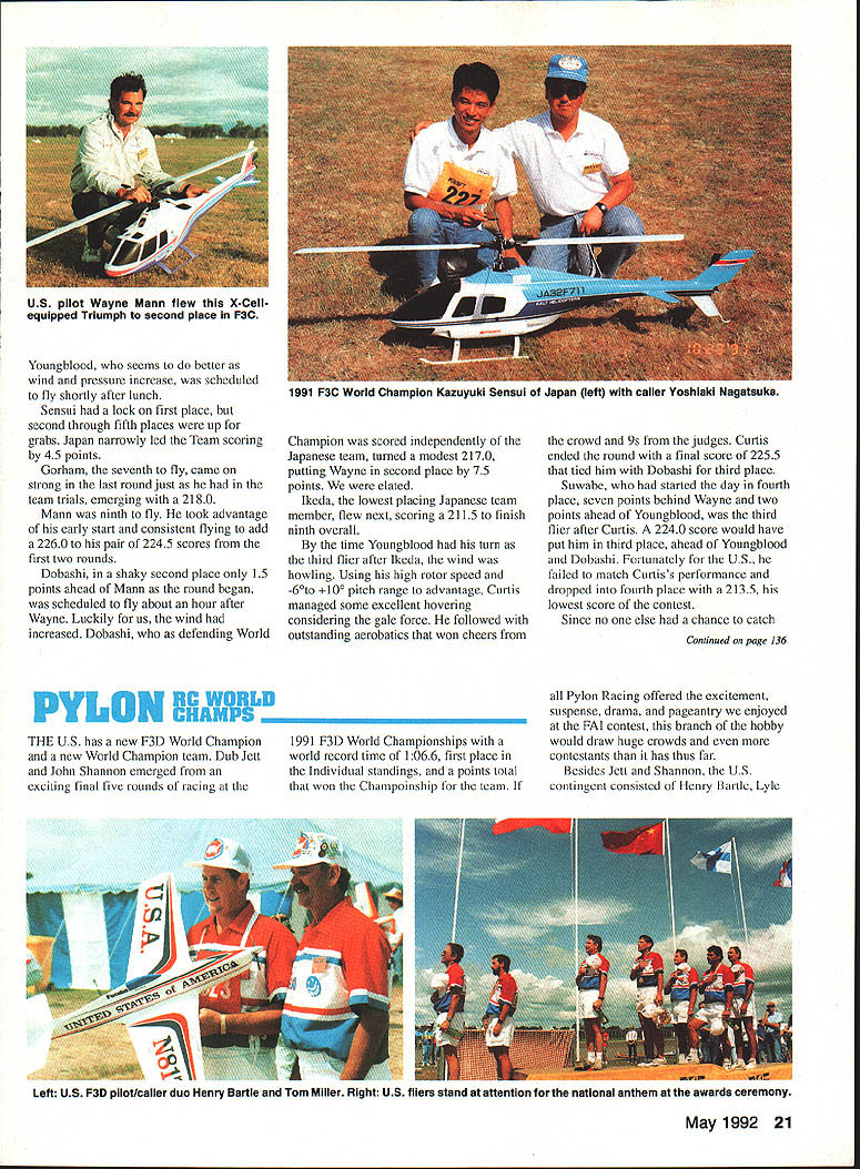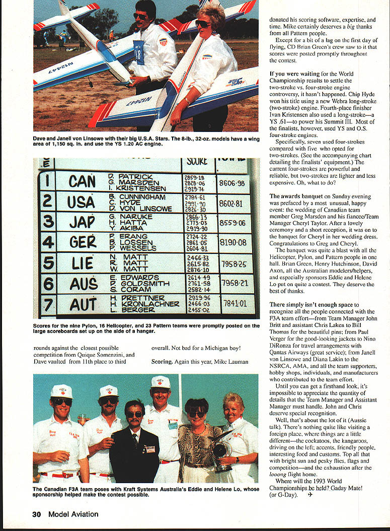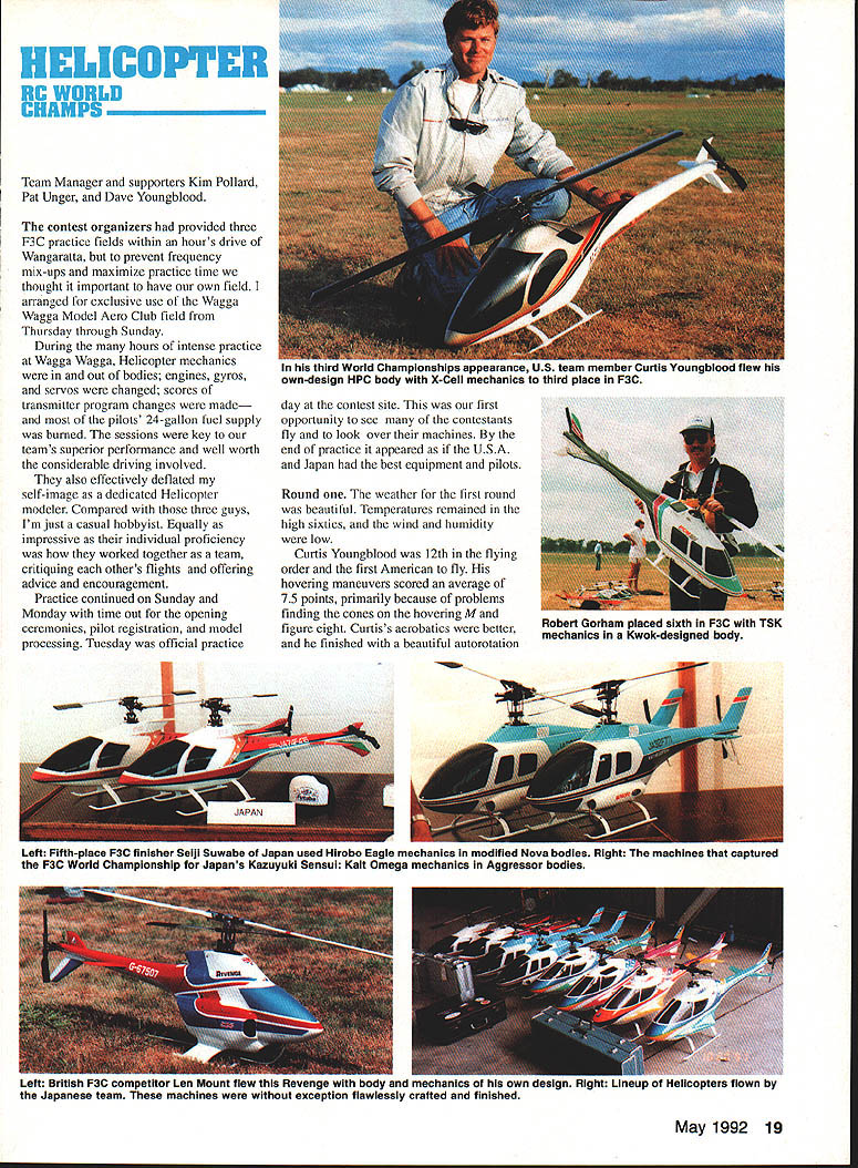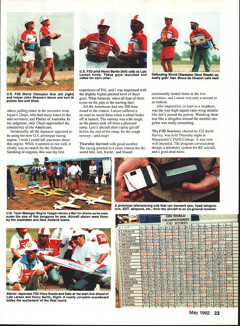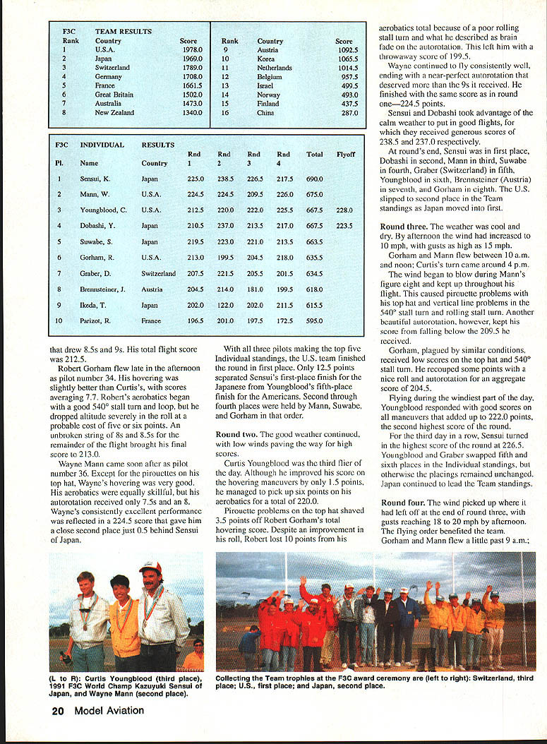 jS 3pyiorId CbSt1WOfl ChIP I4~cIO Helicopter Tom Unger 54 4 GENERAL INFORMATION D HAMPS SPRINGTIME October outstanding success flying field warmhearted Aussie hospitality just some memories US teams supporters carried home 1991 RC World Championships held October 20-27 Drage Airworld Wangaratta Australia Good weather fine site efficient organization part Contest Director Brian Green Event Director Henry Hutchinson combined produce first-rate contest Qantas Airlines agreed ship model boxes no cost 16-hour flight Los Angeles Melbourne provided VIP treatment airline ticket counter Along Korean contingent stayed Wangarattas Advance Motel Owners Alan Vivienne Jones proved wonderful hosts terrific fun Mayor Kevin Gleeson officiated Saturday night welcome party town hall Sunday official contest opening day After flag raising enjoyed colorful flybys selected full-scale aircraft small excellent Drage Airworld museum SKILL practice paid off US F3C tcam field 37 pilots 16 countrics Waync Mann Curtis Youngblood Robert Gorham took second third sixth places respectively accumulated neccssaly point margin capture tirstevei US F3C Team Championship Resides Mann Youneblood Gorham US entourage consisted myself 18 Model Aviation Wangaratta very pleasant community southeastern Australia reminiscent small towns midwestern United States U Left Three coniesi iags iuuer tne Dreeze ilignt MOCi Aeronautical Association Australia president David Axon microphone opens championships Sundays ceremony him L R Helene Eddie Lo Bev Henry Hutchinson Mayor Kevin Gleeson Left National flags participant countries Wangarattas Drage Airworld Right IenIur area ai urage Airworia HELICOPTER RC WORLD CHAMPS Team Manager supporters Kim Pollard Pat Unger Dave Youngblood contest organizers provided three F3C practice fields within hours drive Wangaratta prevent frequency mix-ups maximize practicc time thought important have own field arranged exclusive use Wagga Wagga Model Aero Club field Thursday through Sunday During hours intense practice Wagga Wagga Helicopter mechanics out bodies engines gyros servos changed scores transmitter program changes made pilots 24-gallon fuel supply burned sessions key teams superior performance well worth considerable driving involved also effectively deflated self-image dedicated Helicopter modeler Compared three guys Im just casual hobbyist Equally impressive individual proficiency worked together team critiquing others flights offering advice encouragement Practice continued Sunday Monday time out opening ceremonies pilot registration model processing Tuesday official practice day contest site first opportunity see contestants fly look over machines end practice appeared USA Japan best equipment pilots Round weather first round beautiful Temperatures remained high sixties wind humidity low Curtis Youngblood 12th flying order first American fly hovering maneuvers scored average 75 points primarily because problems finding cones hovering M figure eight Curtiss aerobatics better finished beautiful autorotation May1992 19 mechanics third place F3C Robert Gorham placed sixth F3C TSK mechanics Kwok-designed body Left Fifth-place F3C finisher Seiji Suwabe Japan used Hirobo Eagle mechanics modified Nova bodies Right machines captured F3C World Championship Japans Kazuyuki Sensui Kalt Omega mechanics Aggressor bodies Left British F3C competitor Len Mount flew Revenge body mechanics own nese team machines exception flawlessly crafted finished F3CTEAM RESULTS RankCountryScoreRankCountryScore 1USA197809Austria10925 2Japan1969010Korea10655 3Switzerland1789011Netherlands10145 4Germany1708012Belgium9575 SFrance1661513Israel4995 6Great Britain1502014Norway4930 7Australia1473015Finland4375 8New Zealand1340016China2870 F3C INDIVIDUALRESULTS RndRndRndRnd Total Flyoff P1NameCountry1234 ISenaui KJapan22502385226521756900 2Mann WUSA22452245209522606750 3Youngblood CUSA212522002220225566752280 4Dobashi YJapan210523702135217066752235 SSuwabe SJapan21952230221021356635 6Gorharn RUSA21301995204521806355 7Graber DSwitzerland20752215205520156345 8Brennateiner JAustria20452140181019956180 9Ikeda TJapan20201220202021156155 10Parizot RFrance19652010197517255950 drew 85s 9s total flight score 2125 Robert Gorham flew late afternoon pilot number 34 hovering slightly better Curtiss scores averaging 77 Roberts aerobatics began good 540 stall turn loop dropped altitude severely roll probable cost five six points An unbroken string 8s 85s remainder flight brought final score 2130 Wayne Mann came soon after pilot number 36 Except pirouettes top hat Waynes hovering very good aerobatics equally skillful autorotation received 75s 8 Waynes consistently excellent performance reflected 2245 score gave him close second place just 05 behind Sensui Japan three pilots making top five Individual standings US team finished round first place Only 125 points separated Sensuis first-place finish Japanese Youngbloods fifth-place finish Americans Second through fourth places held Mann Suwabe Gorham order Round two good weather continued low winds paving way high scores Curtis Youngblood third flier day Although improved score hovering maneuvers 15 points managed pick up six points aerobatics total 2200 Pirouette problems top hat shaved 35 points off Robert Gorhams total hovering score Despite improvement roll Robert lost 10 points aerobatics total because poor rolling stall turn what described brain fade autorotation left him throwaway score 1995 Wayne continued Ily consistently well ending near-perfect autorotation deserved 9s received finished same score round one2245 points Sensui Dobashi took advantage calm weather put good flights received generous scores 2385 2370 respectively rounds end Sensui first place Dobashi second Mann third Suwabe fourth Graber Switzerland fifth Younghlood sixth l3rennsteiner Austria seventh Gorham eighth US slipped second place Team standings Japan moved first Round three weather cool dry afternoon wind increased 10 mph 