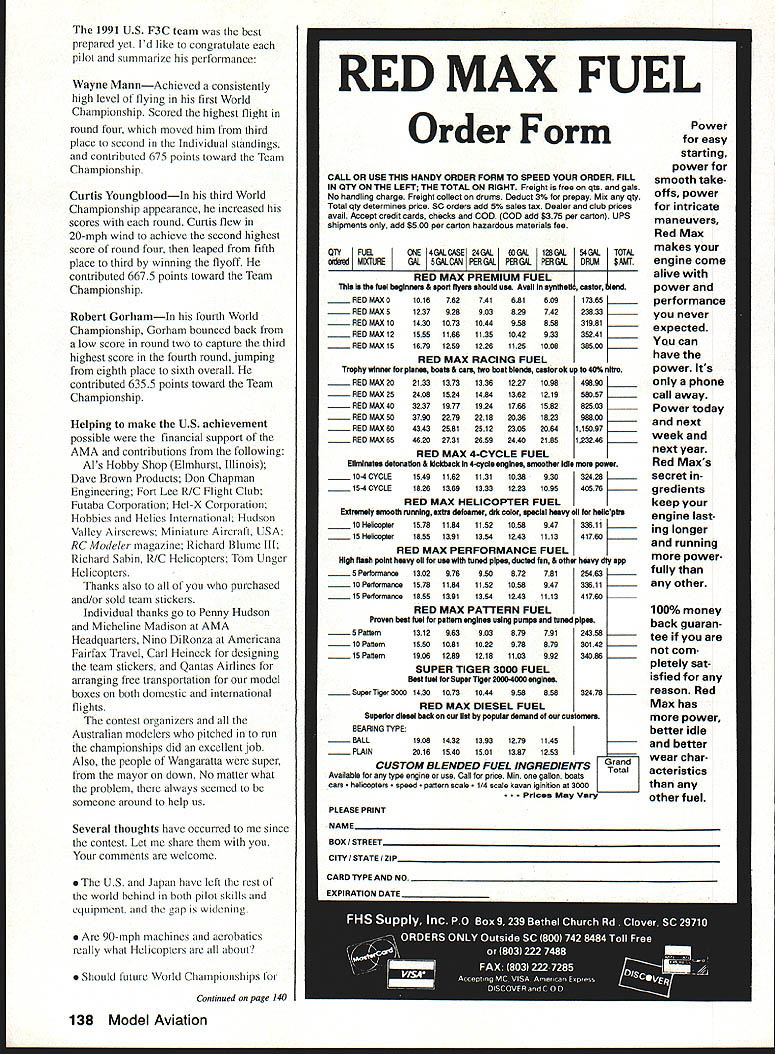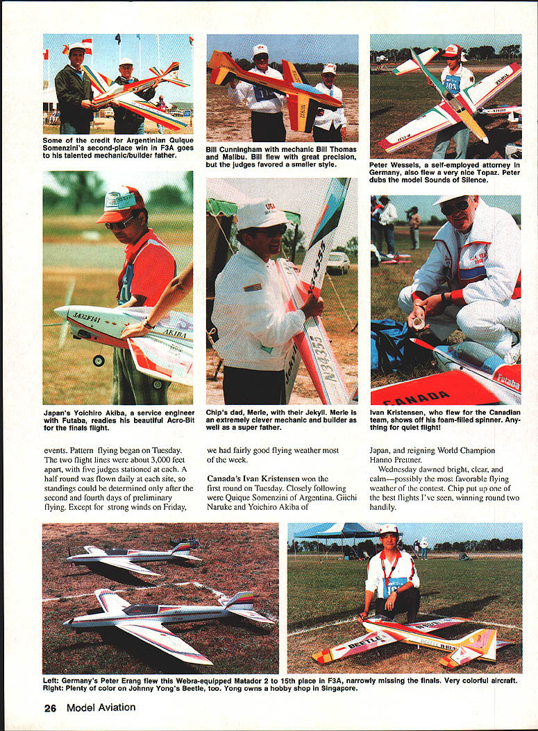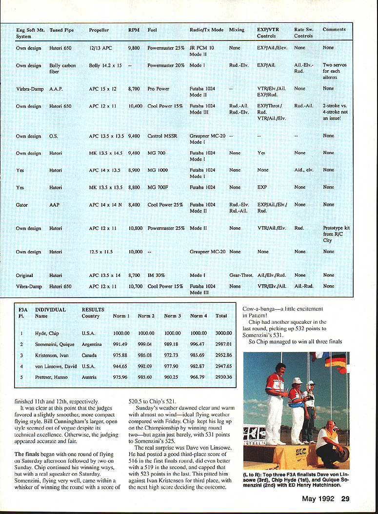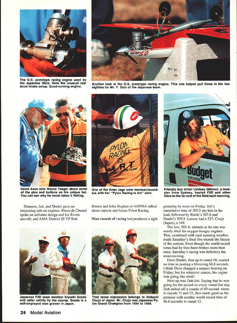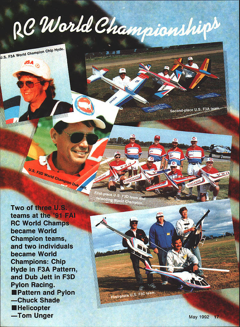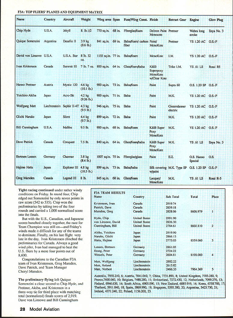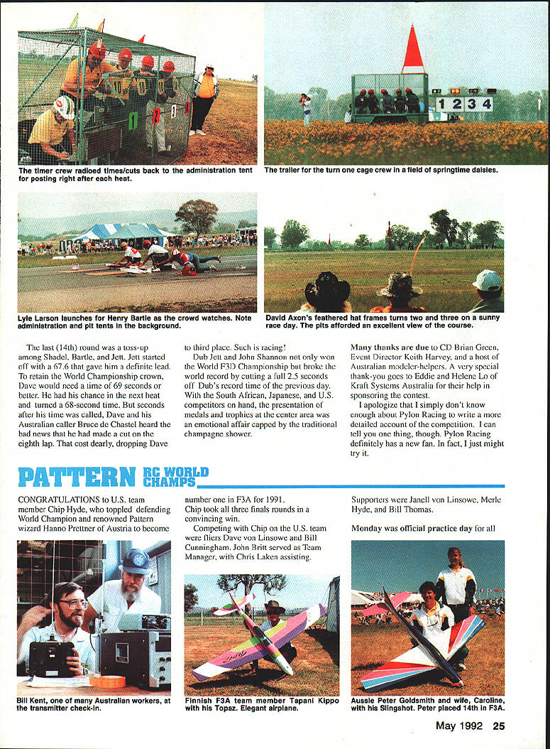 jS 3pyiorId CbSt1WOfl ChIP I4~cIO Helicopter Tom Unger 54 4 GENERAL INFORMATION D HAMPS SPRINGTIME October outstanding success flying field warmhearted Aussie hospitality just some memories US teams supporters carried home 1991 RC World Championships held October 20-27 Drage Airworld Wangaratta Australia Good weather fine site efficient organization part Contest Director Brian Green Event Director Henry Hutchinson combined produce first-rate contest Qantas Airlines agreed ship model boxes no cost 16-hour flight Los Angeles Melbourne provided VIP treatment airline ticket counter Along Korean contingent stayed Wangarattas Advance Motel Owners Alan Vivienne Jones proved wonderful hosts terrific fun Mayor Kevin Gleeson officiated Saturday night welcome party town hall Sunday official contest opening day After flag raising enjoyed colorful flybys selected full-scale aircraft small excellent Drage Airworld museum SKILL practice paid off US F3C tcam field 37 pilots 16 countrics Waync Mann Curtis Youngblood Robert Gorham took second third sixth places respectively accumulated neccssaly point margin capture tirstevei US F3C Team Championship Resides Mann Youneblood Gorham US entourage consisted myself 18 Model Aviation Wangaratta very pleasant community southeastern Australia reminiscent small towns midwestern United States U Left Three coniesi iags iuuer tne Dreeze ilignt MOCi Aeronautical Association Australia president David Axon microphone opens championships Sundays ceremony him L R Helene Eddie Lo Bev Henry Hutchinson Mayor Kevin Gleeson Left National flags participant countries Wangarattas Drage Airworld Right IenIur area ai urage Airworia HELICOPTER RC WORLD CHAMPS Team Manager supporters Kim Pollard Pat Unger Dave Youngblood contest organizers provided three F3C practice fields within hours drive Wangaratta prevent frequency mix-ups maximize practicc time thought important have own field arranged exclusive use Wagga Wagga Model Aero Club field Thursday through Sunday During hours intense practice Wagga Wagga Helicopter mechanics out bodies engines gyros servos changed scores transmitter program changes made pilots 24-gallon fuel supply burned sessions key teams superior performance well worth considerable driving involved also effectively deflated self-image dedicated Helicopter modeler Compared three guys Im just casual hobbyist Equally impressive individual proficiency worked together team critiquing others flights offering advice encouragement Practice continued Sunday Monday time out opening ceremonies pilot registration model processing Tuesday official practice day contest site first opportunity see contestants fly look over machines end practice appeared USA Japan best equipment pilots Round weather first round beautiful Temperatures remained high sixties wind humidity low Curtis Youngblood 12th flying order first American fly hovering maneuvers scored average 75 points primarily because problems finding cones hovering M figure eight Curtiss aerobatics better finished beautiful autorotation May1992 19 mechanics third place F3C Robert Gorham placed sixth F3C TSK mechanics Kwok-designed body Left Fifth-place F3C finisher Seiji Suwabe Japan used Hirobo Eagle mechanics modified Nova bodies Right machines captured F3C World Championship Japans Kazuyuki Sensui Kalt Omega mechanics Aggressor bodies Left British F3C competitor Len Mount flew Revenge body mechanics own nese team machines exception flawlessly crafted finished F3CTEAM RESULTS RankCountryScoreRankCountryScore 1USA197809Austria10925 2Japan1969010Korea10655 3Switzerland1789011Netherlands10145 4Germany1708012Belgium9575 SFrance1661513Israel4995 6Great Britain1502014Norway4930 7Australia1473015Finland4375 8New Zealand1340016China2870 F3C INDIVIDUALRESULTS RndRndRndRnd Total Flyoff P1NameCountry1234 ISenaui KJapan22502385226521756900 2Mann WUSA22452245209522606750 3Youngblood CUSA212522002220225566752280 4Dobashi YJapan210523702135217066752235 SSuwabe SJapan21952230221021356635 6Gorharn RUSA21301995204521806355 7Graber DSwitzerland20752215205520156345 8Brennateiner JAustria20452140181019956180 9Ikeda TJapan20201220202021156155 10Parizot RFrance19652010197517255950 drew 85s 9s total flight score 2125 Robert Gorham flew late afternoon pilot number 34 hovering slightly better Curtiss scores averaging 77 Roberts aerobatics began good 540 stall turn loop dropped altitude severely roll probable cost five six points An unbroken string 8s 85s remainder flight brought final score 2130 Wayne Mann came soon after pilot number 36 Except pirouettes top hat Waynes hovering very good aerobatics equally skillful autorotation received 75s 8 Waynes consistently excellent performance reflected 2245 score gave him close second place just 05 behind Sensui Japan three pilots making top five Individual standings US team finished round first place Only 125 points separated Sensuis first-place finish Japanese Youngbloods fifth-place finish Americans Second through fourth places held Mann Suwabe Gorham order Round two good weather continued low winds paving way high scores Curtis Youngblood third flier day Although improved score hovering maneuvers 15 points managed pick up six points aerobatics total 2200 Pirouette problems top hat shaved 35 points off Robert Gorhams total hovering score Despite improvement roll Robert lost 10 points aerobatics total because poor rolling stall turn what described brain fade autorotation left him throwaway score 1995 Wayne continued Ily consistently well ending near-perfect autorotation deserved 9s received finished same score round one2245 points Sensui Dobashi took advantage calm weather put good flights received generous scores 2385 2370 respectively rounds end Sensui first place Dobashi second Mann third Suwabe fourth Graber Switzerland fifth Younghlood sixth l3rennsteiner Austria seventh Gorham eighth US slipped second place Team standings Japan moved first Round three weather cool dry afternoon wind increased 10 mph 