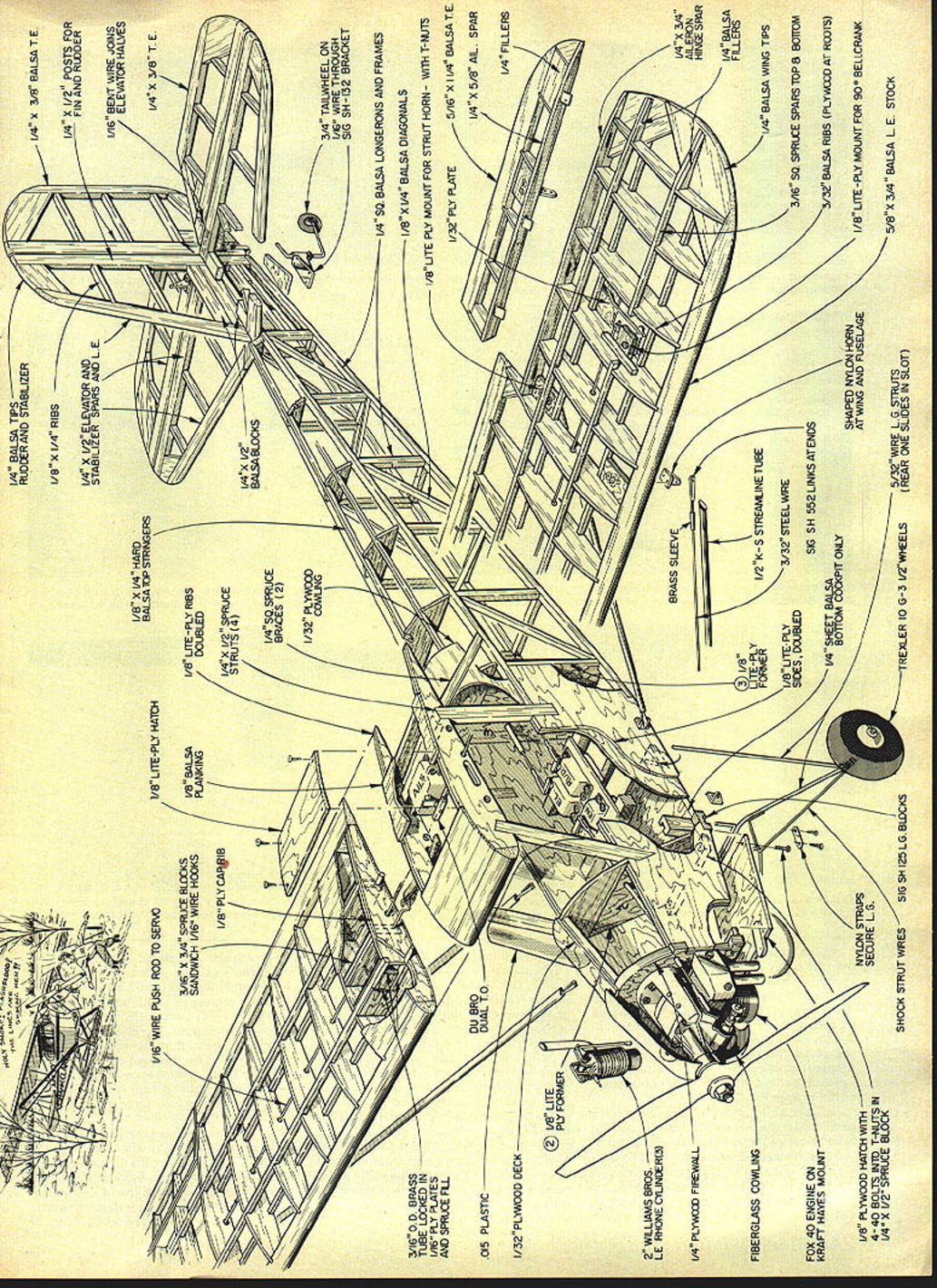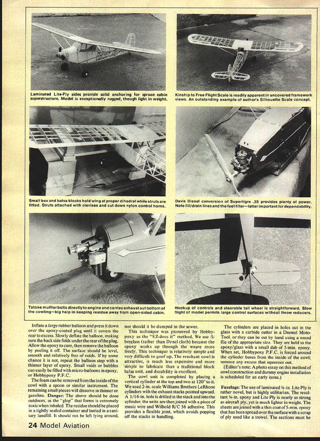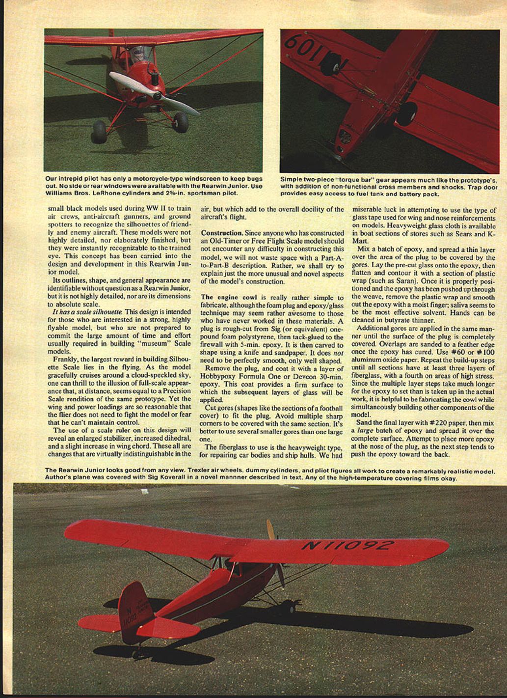 NO OCR TEXT NO OCR TEXT small black models used during WW II train air crews anti-aircraft gunners ground spotters recognize silhouettes friend ly enemy aircraft models highly detailed nor elaborately finished instantly recognizable trained eye concept has carried design development Rearwin jun ior model Its outlines shape general appearance identifiable question Rearwin Junior highly detailed nor its dimensions absolute scale has scale silhouette design intended interested strong highly flyable model prepared commit large amount time effort usually required buil4ing museum Scale models Frankly largest reward building Silhou ette Scale lies flying As model gracefully cruises around cloud-speckled sky can thrill illusion full-scale appear ance distance seems equal Precision Scale rendition same prototype Yet wing power loadings reasonable flier does need fight model fear cant maintain control use scale ruler design will reveal enlarged stabilizer increased dihedral slight increase wing chord changes virtually indistinguishable air add overall docility aircrafts flight Construction Since anyone has constructed Old-Timer Free Flight Scale model should encounter difficulty constructing model will waste space Part-Ato-Part-B description Rather shall try explain just unusual novel aspects models construction engine cowl really rather simple fabricate although foam plug epoxy/glass technique may seem rather axesome have never worked materials plug rough-cut Sig equivalent onepound foam polystyrene tack-glued firewall 5-min epoxy carved shape using knife sandpaper does need perfectly smooth well shaped Remove plug coat layer Hobbypoxy Formula Devcon 30-mm epoxy coat provides firm surface subsequent layers glass will applied Cut gores shapes like sections football cover fit plug Avoid multiple sharp corners covered same section Its better use several smaller gores large fiberglass use heavyweight type repalring car bodies ship hulls miserable luck attempting use type glass tape used wing nose reinforcements models Heavyweight glass cloth available boat sections stores such Sears KMart Mix batch epoxy spread thin layer over area plug covered gores Lay pre-cut glass onto epoxy flatten contour section plastic wrap such Saran Once properly posi tioned epoxy has pushed up through weave remove plastic wrap smooth out epoxy moist finger saliva seems effective solvent Hands can cleaned butyrate thinner Additional gores applied same man ner until surface plug completely covered Overlaps sanded feather edge once epoxy has cured Use *60 #100 aluminum oxide paper Repeat build-up steps until sections have least three layers fiberglass fourth areas high stress Since multiple layer steps take much longer epoxy set taken up actual work helpful fabricating cowl simultaneously building other components model Sand final layer #220 paper mix large batch epoxy spread over complete surface Attempt place epoxy nose plug next step tends push epoxy toward back Rearwin Junior looks good view Trexler air wheels dummy cylinders pliot figures work create remarkably realistic model A,thnr nIRnA covered Sig Koverall novel mannner described text Any high-temperature covering films okay intrepid pilot has moorcyclesype winascreen 50 Keep DU9S out No side rear windows available Rearwin Junior Use Williams Bros LeRhone cylinders 2%-in sportsman pilot ImpIe two-piece torque bar gear appears much like prototypes addition non-functional cross members shocks Trap door provides easy access fuel tank battery pack 3/16 0 D BRASS TUBE LOCKED IN 1/16 PLY PLATES AND SPRUCE FIL I/32PLYWOOD DECK A2 WILLIAMS BROS LE RHONE CYLINDER3 1/4 PLWXI FIBEWALL FIBERGLASS COWLING 1/16 WIRE PUSH ROD TO SER\ 3/16 X 3/4 SPRUCE BLOCKS SANDWKH 1/16 WIRE HOOKS Wa PLY CAFWIB 1/8 X /4 HARD BALSA lOP STRINGERS 1/8 LITE-PLY HAiCH L/B BALSAI/B LITE -PLY RIBS K4X /2 SPRUCE PLANKING DOUBLED TRUTS 4 VI/4SO SPRUCE BRES C PLYW COWLING /7 K 1/4 BALSA TIPS RUDDER AND STABILIZERX7JIIlINNj.j\ /8 X 1/4 RIBS 1/4 X 1/2 ELEVATOR ANDNiIfII[ STABILIZER SPARS AND LE I/4X V2 BALSA BLOCKS FORMER1/2K-S STREAMJNE TUBE I/B UTE- PLY 3/32 STEEL WIRE FOX 40 ENGINE ON516 SH 552 LINKS ATENDS KRAFT HAYES MOUNT1/4 SHEET BALSA BOlTOM COCKPIT ONLY SHAPED NYLON HORN I/B PLWJOOD HATCH WITHAT WING AND FUSELAGE 4-40 BOLTS INTO T-NUTSIN 1/4 X 1/2 SPRUCE BLOCK 5/32 WIRE LG STRUTS SHOCK STRUT WIRES516 SH 125 LG BLOCKSTREXLER ID G-3 I/2WI-EELSI REAR ONE SLIDES IN SLOT II I I/4X 3/8BALSATE 1/4 X 1/2 POSTS FOR AND RUBDER 1/16 BENT WIRE JOINS ELEVATOR HALVES 1/4 X 3/B T E 3/4 TAILWHEEL ON I/B WIRE THROUGH SIG SH- 132 BRACKET 1/4 SQ BALSA LONGERONS AND FRAMES I/BX 1/4 BALSA DIAGONALS I/B UTE PLY MOUNT FOR STRUT HORN WITH T-RUTS 1/32 PLY PLATE 5/16 XII/4 BALSA TE 1/4 15/BAlL SPAR 1/4 FILLERS 1/4 X 3/4 AILERON HINGE SRR 1/4 BALSA FILLERS /4 BALSA WING TIPS 3/16 50 SPRUCE SPARS TOP 8011DM 3/32 BALSA RIBS PLYWOD AT ROOTS 1/BLITE-PLY MOUNT FOR 900 BELLCRANK 5/BX 3/4 BALSA L E STOCK Inflate large rubber balloon press down over epoxy-coated plug until covers rear excess Slowly deflate balloon making sure back side folds under rear plug Allow epoxy cure remove balloon peeling off surface should level smooth relatively free voids some chance repeat balloon step thinner layer epoxy Small voids bubbles can easily filled micro-balloons epoxy Hobbypoxy PFC foam can removed inside cowl spoon similar instrument remaining small pieces will dissolve thinner gasoline Danger above should done outdoors glop forms extremely toxic inhaled residue should placed tightly sealed container buried sani tary landfill should left lying around nor should dumped sewer technique pioneered Hobby poxy EZ-does method use fi berglass rather Dynel cloth because epoxy works up through weave freely technique relatively simple very difficult goof up resultant cowl attractive much less expensive simple fabricate traditional block balsa unit durability excellent cowl unit completed placing vertical cylinder top two 1200 used 2-in scale Williams Bro
